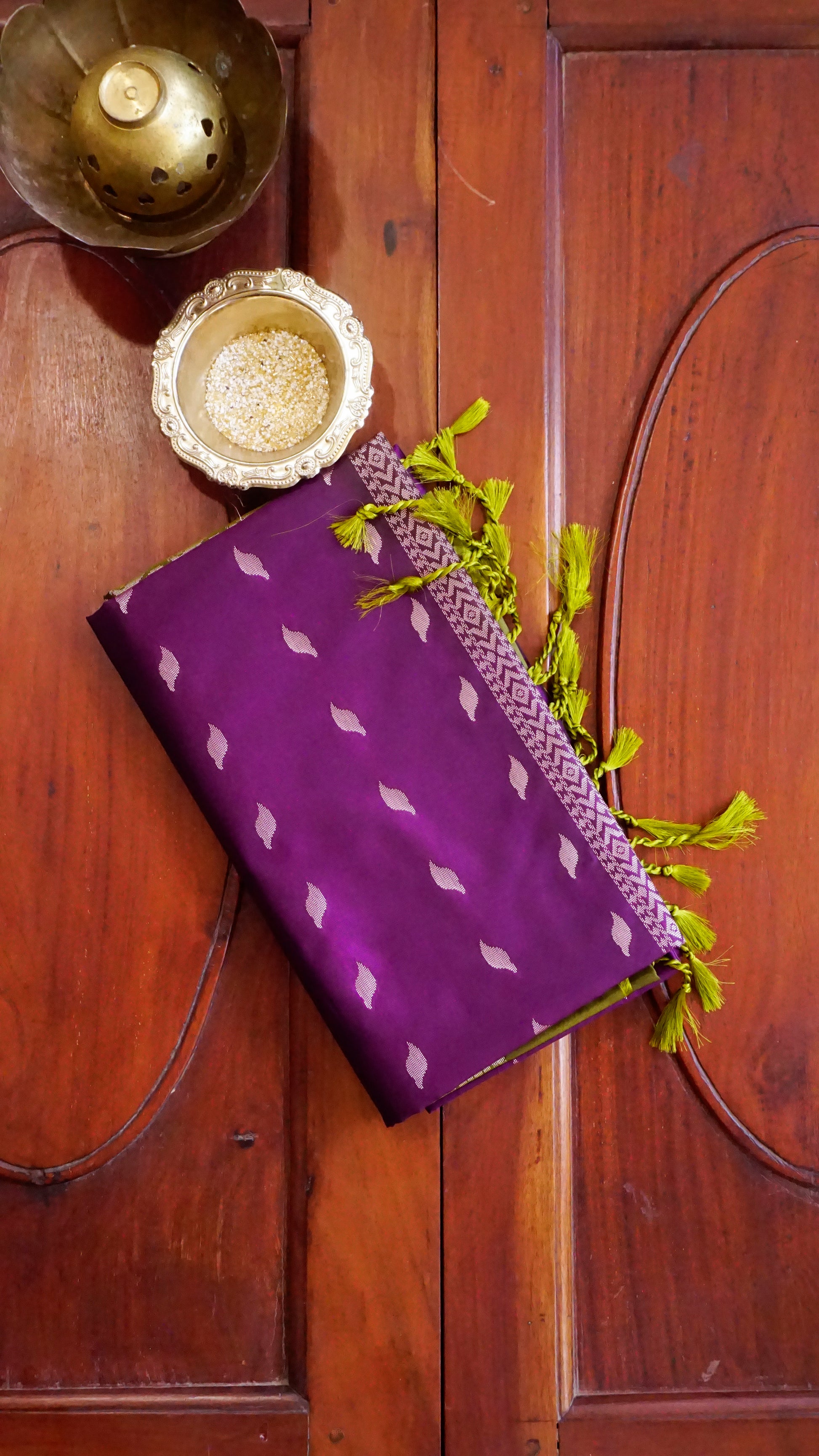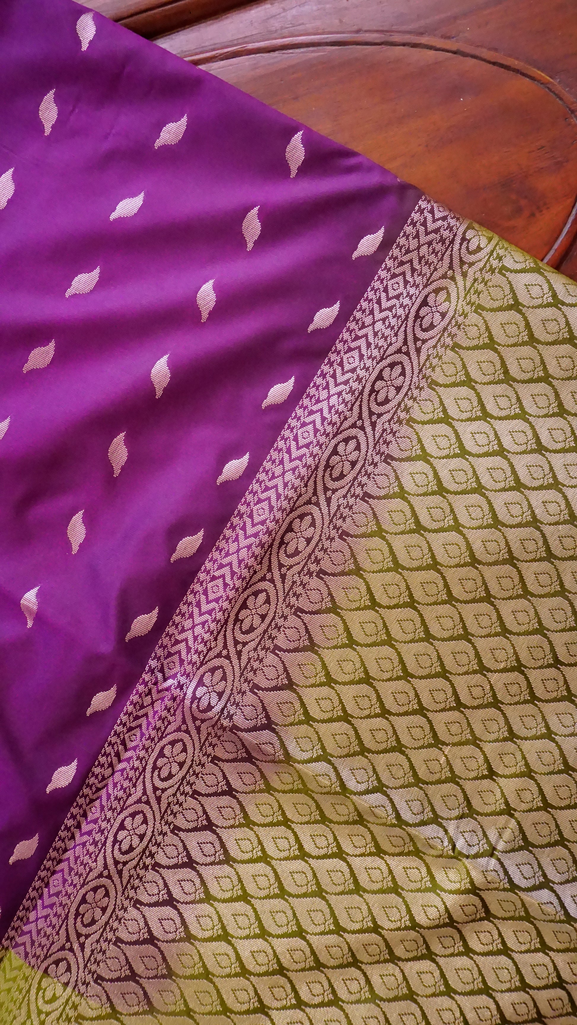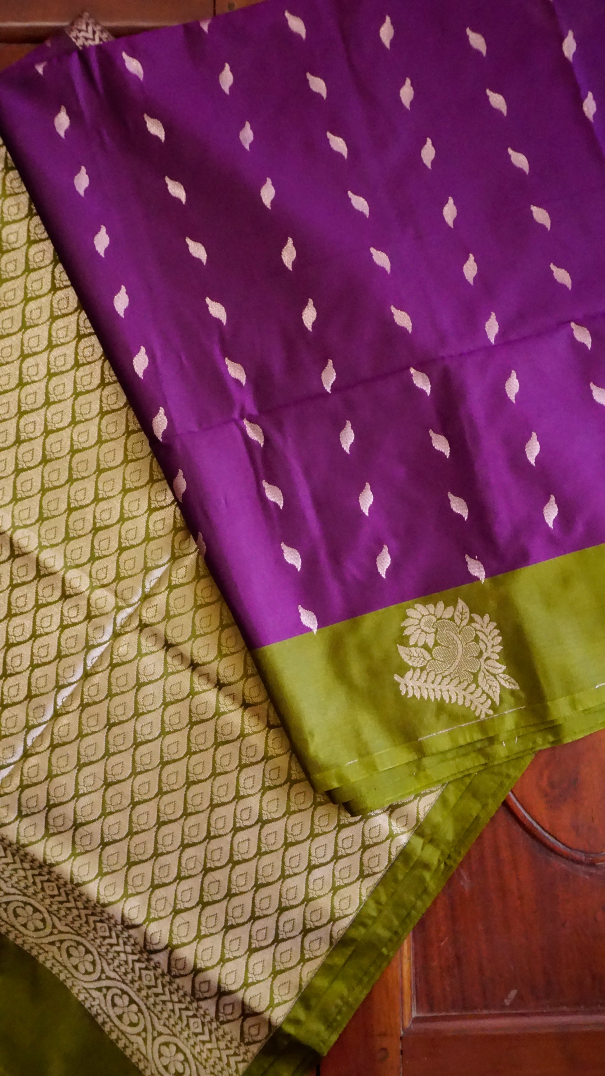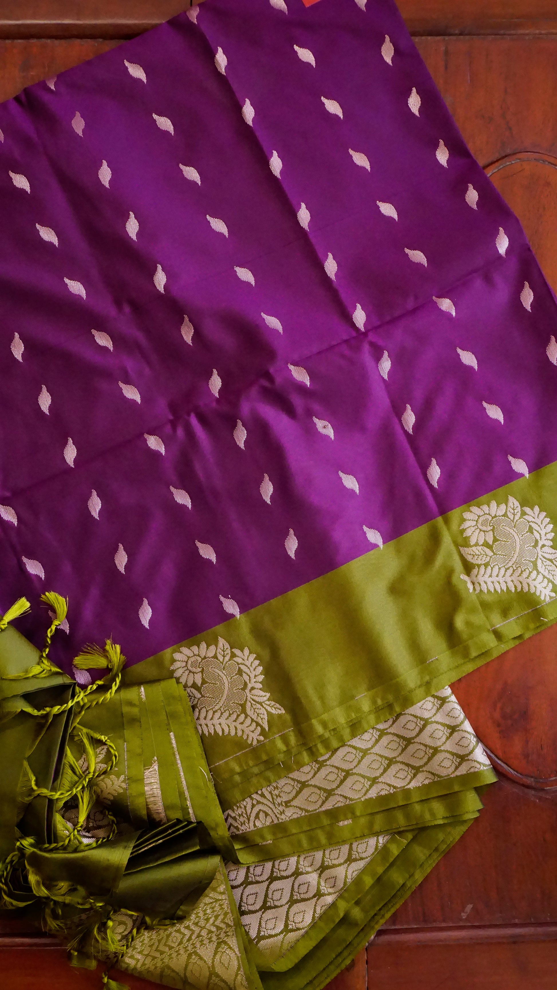 This sophisticated semi-silk saree, with its royal purple body, zari artwork, and traditional green border, is perfect for any event. 🌿💜