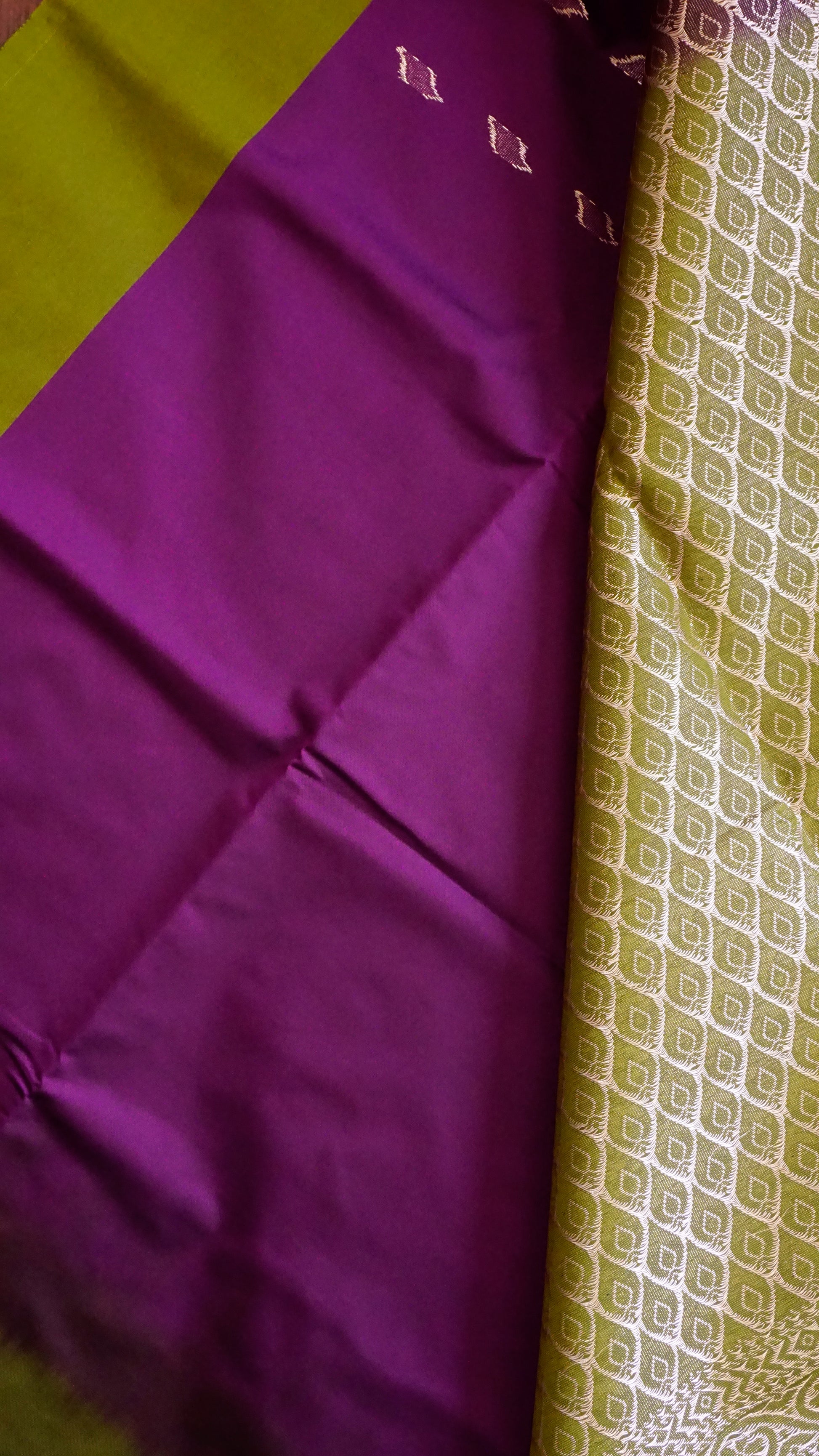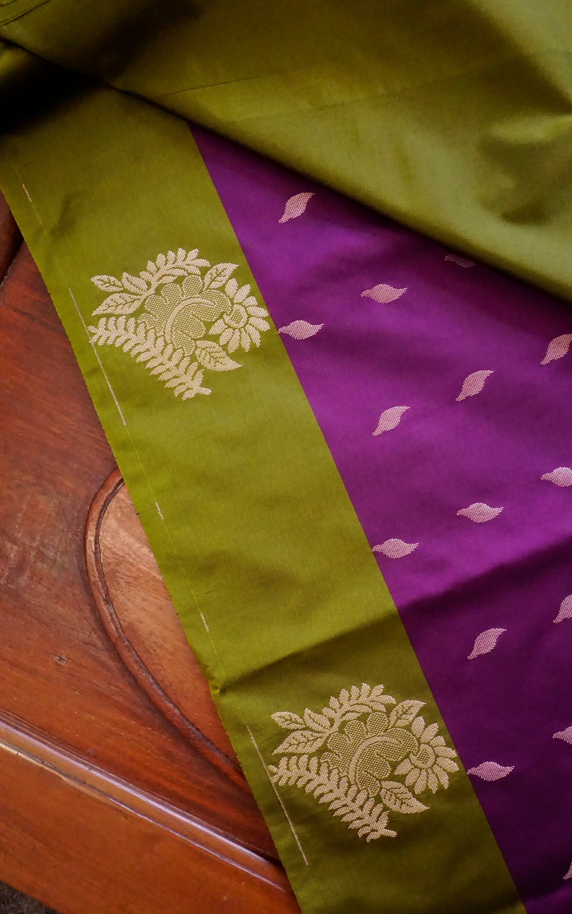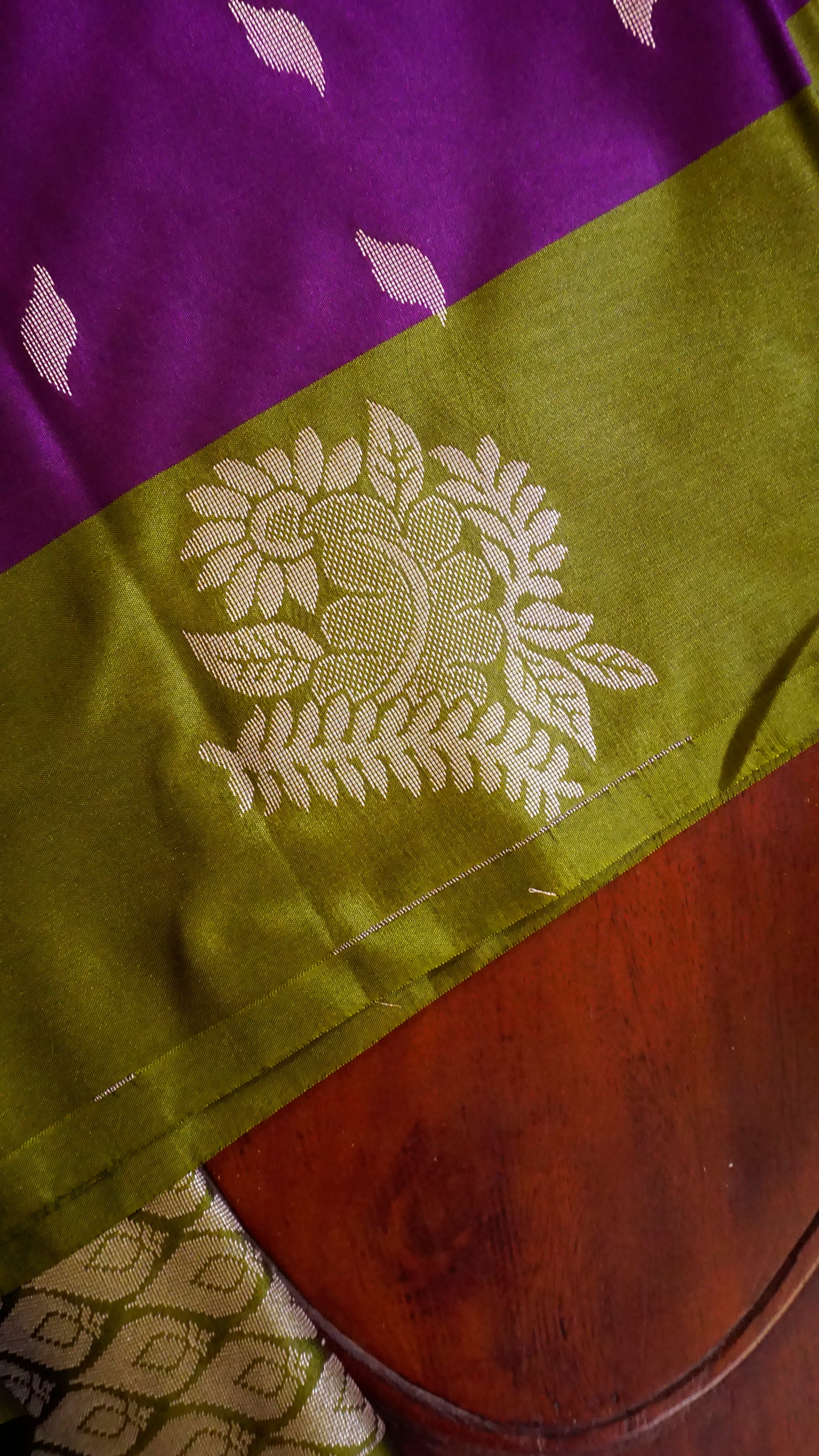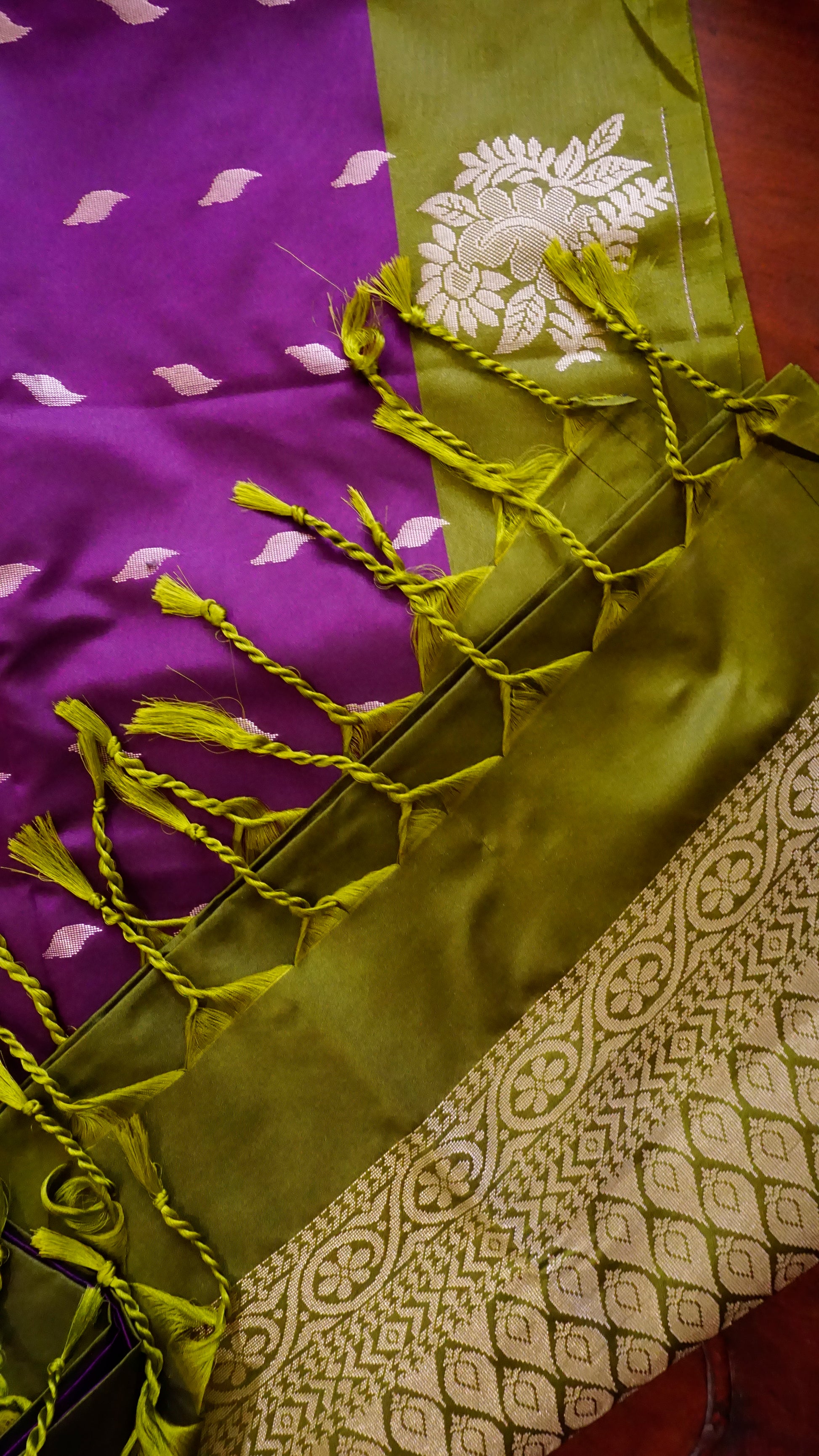 This sophisticated semi-silk saree, with its royal purple body, zari artwork, and traditional green border, is perfect for any event. 🌿💜