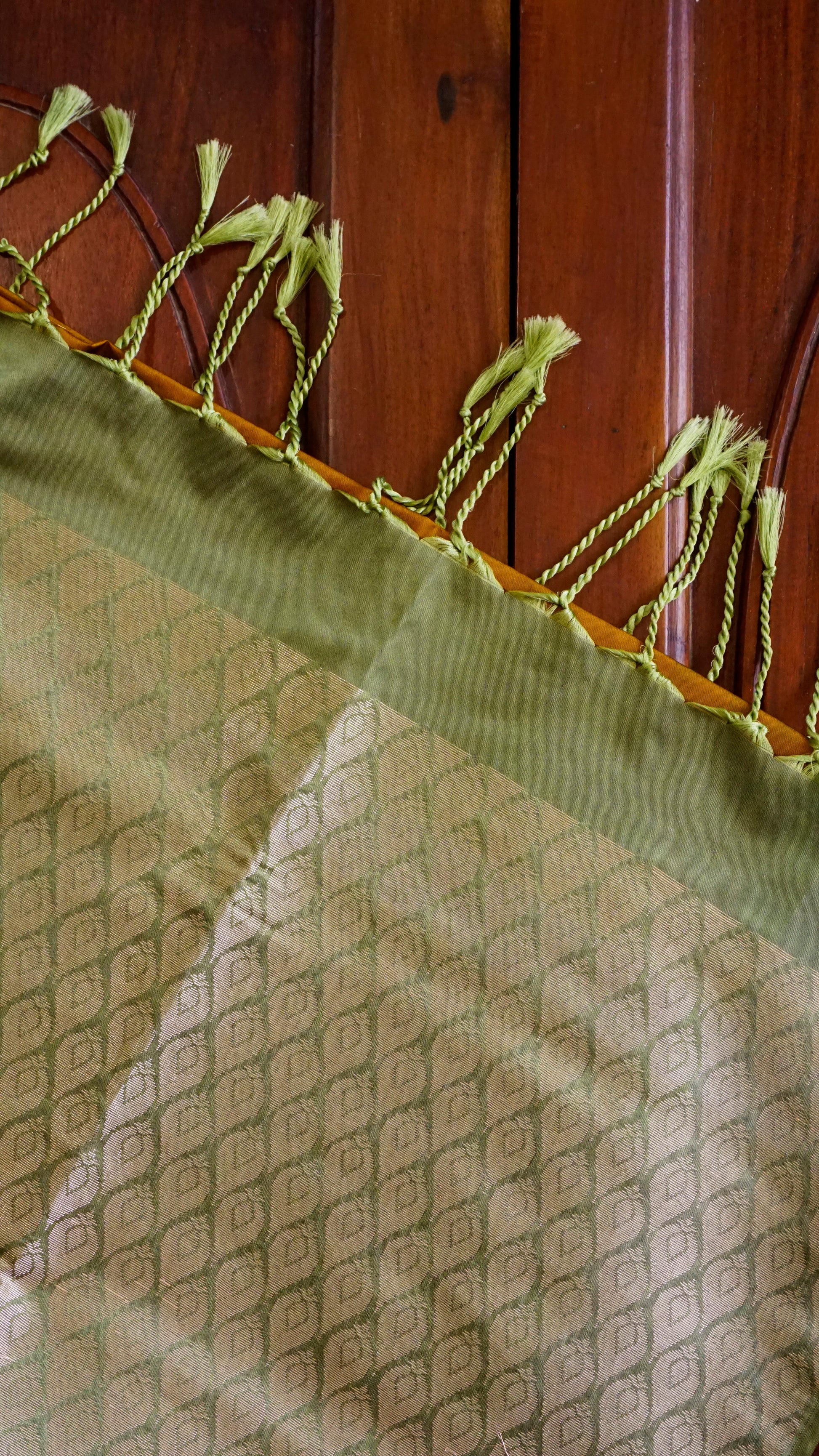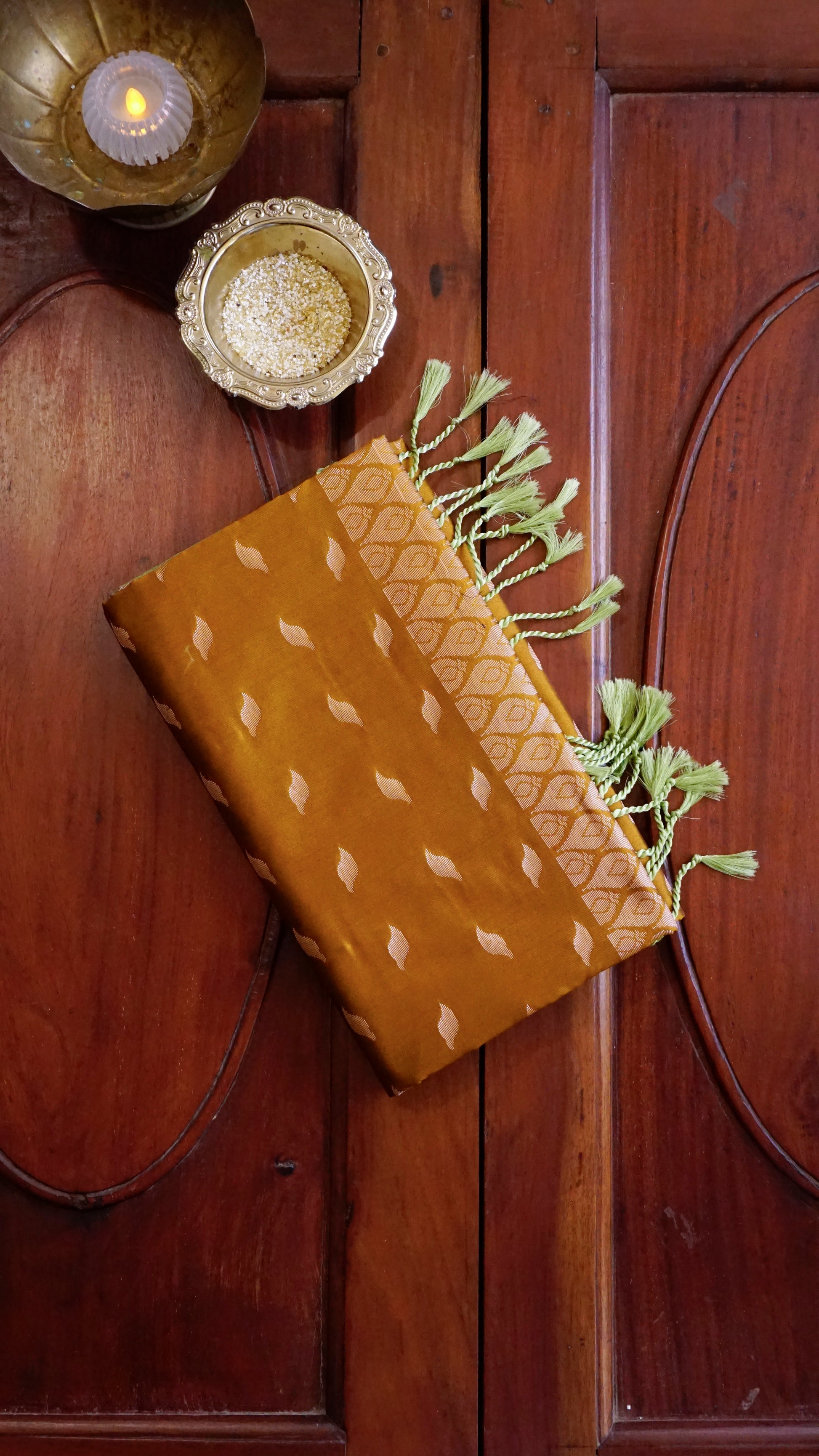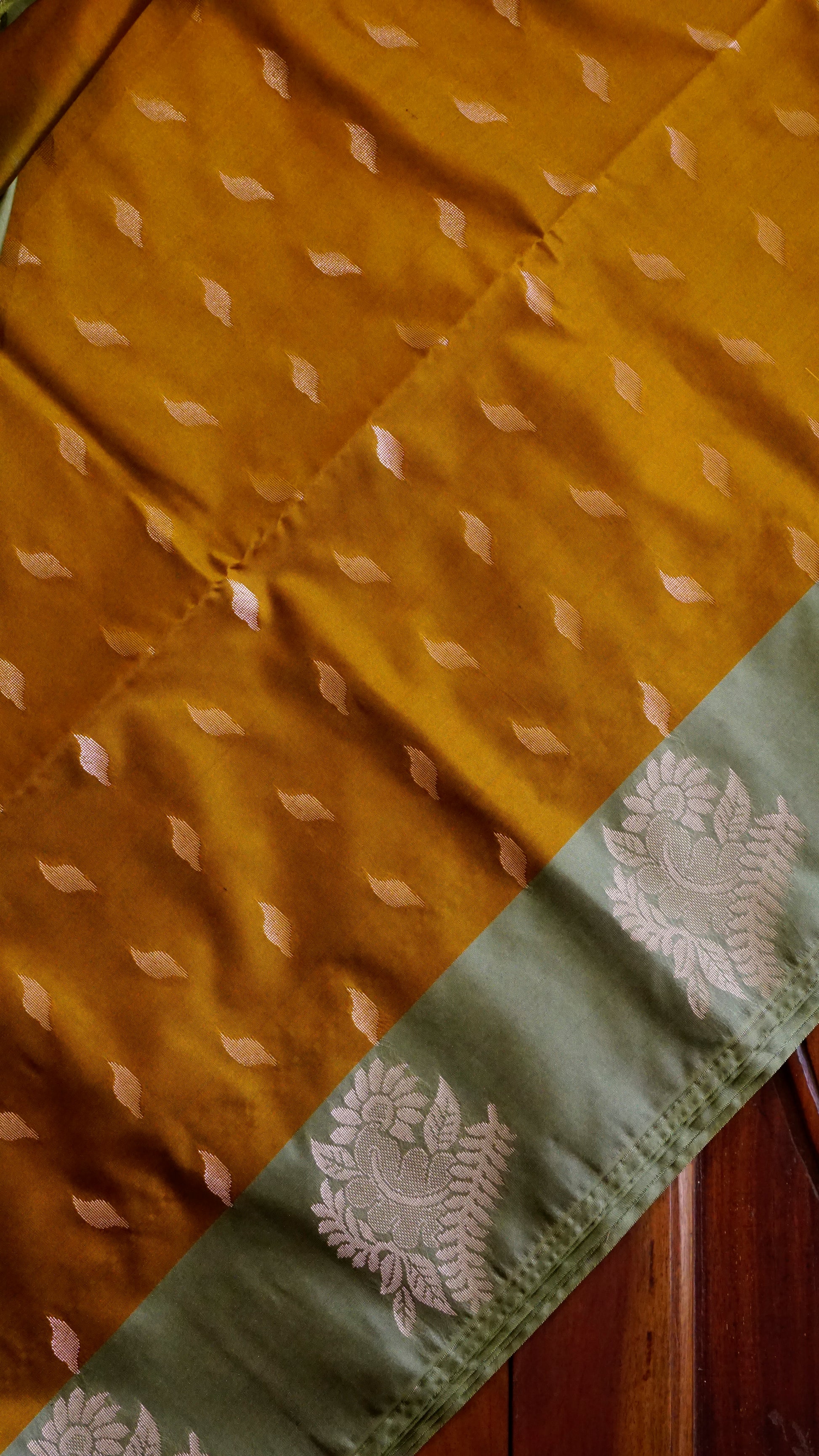 Pallu: Richly woven with golden sheen & leafy motifs, enhancing the traditional appeal