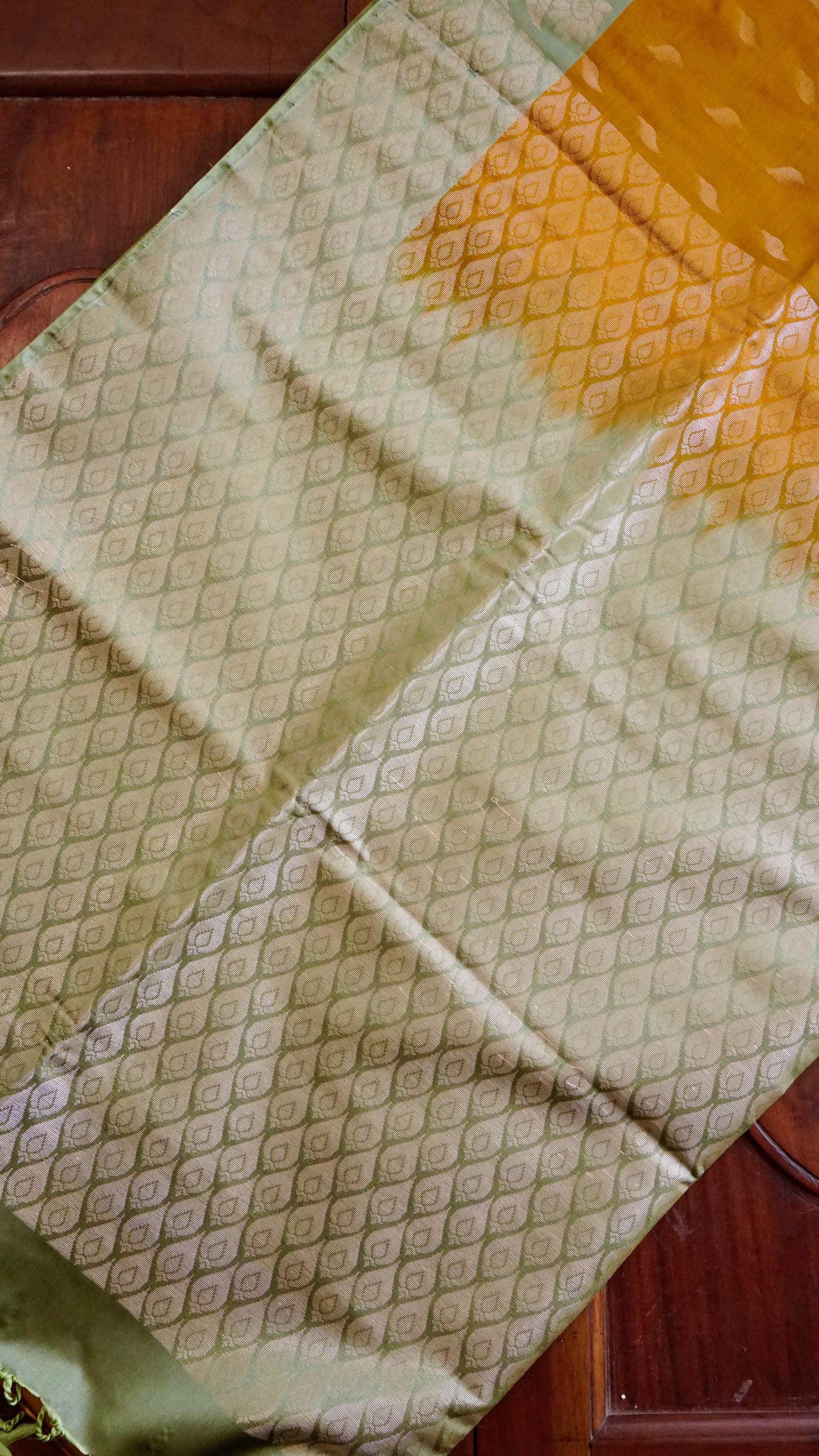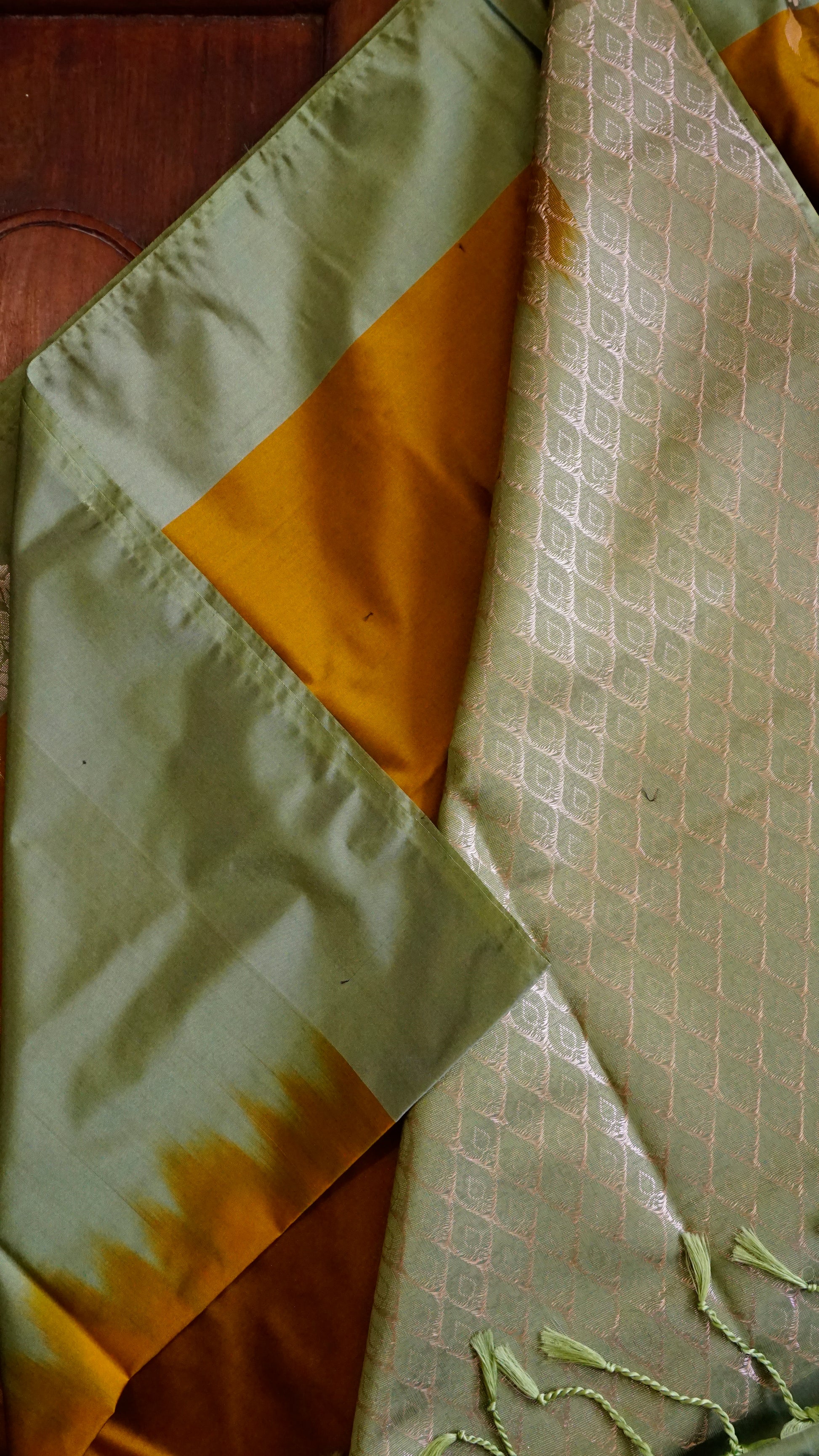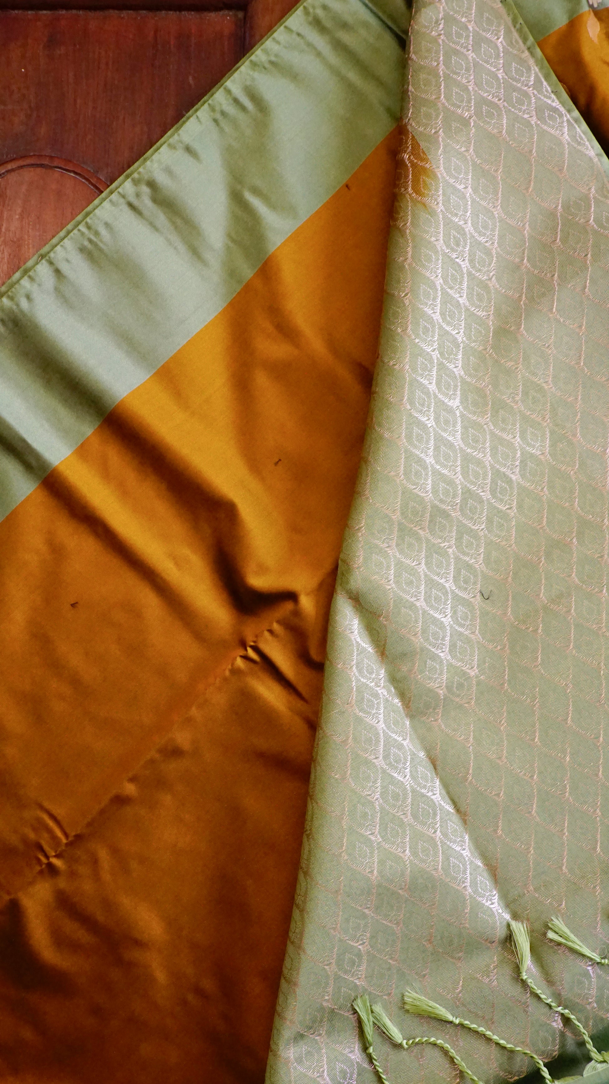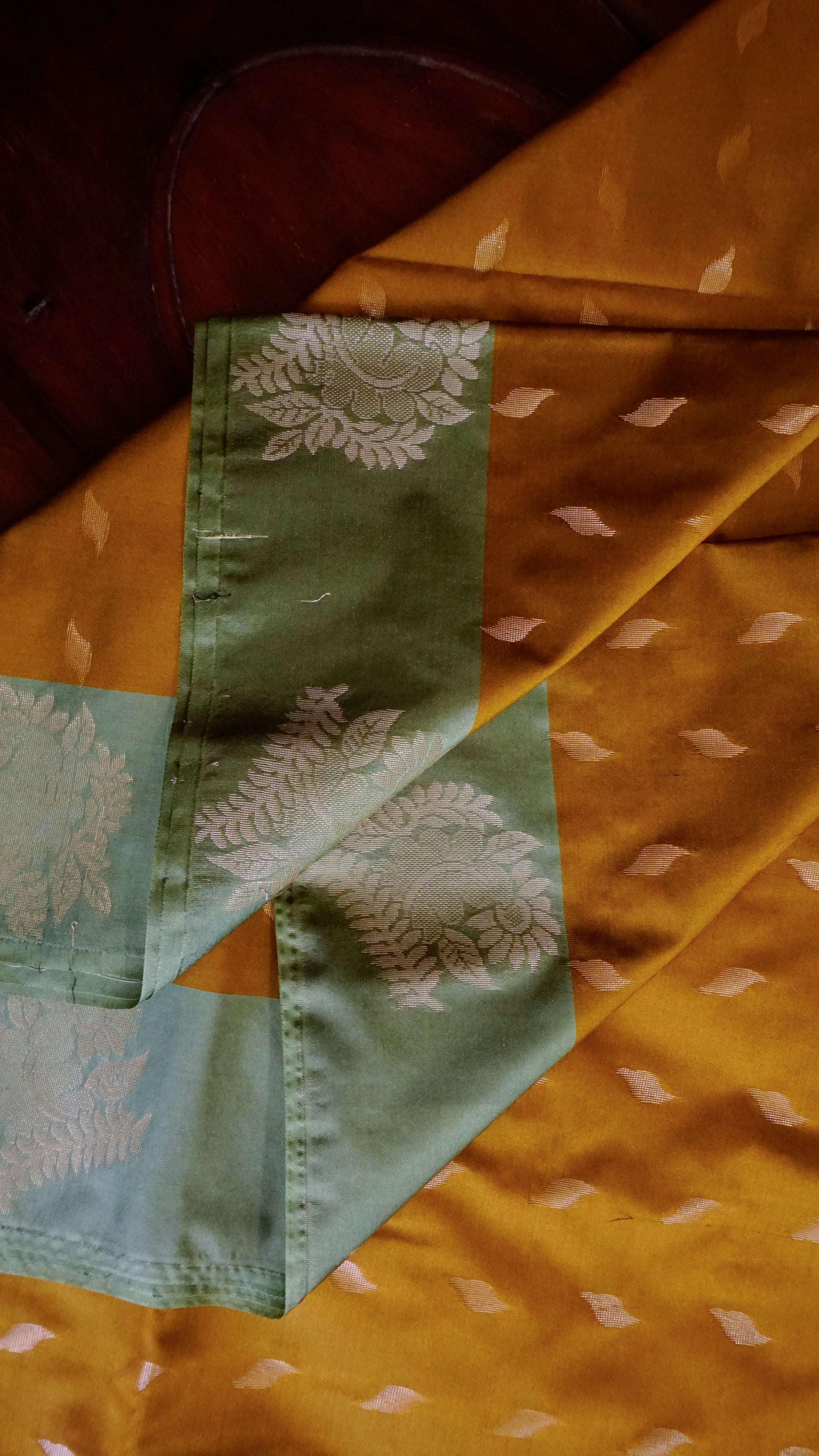 Pallu: Richly woven with golden sheen & leafy motifs, enhancing the traditional appeal
