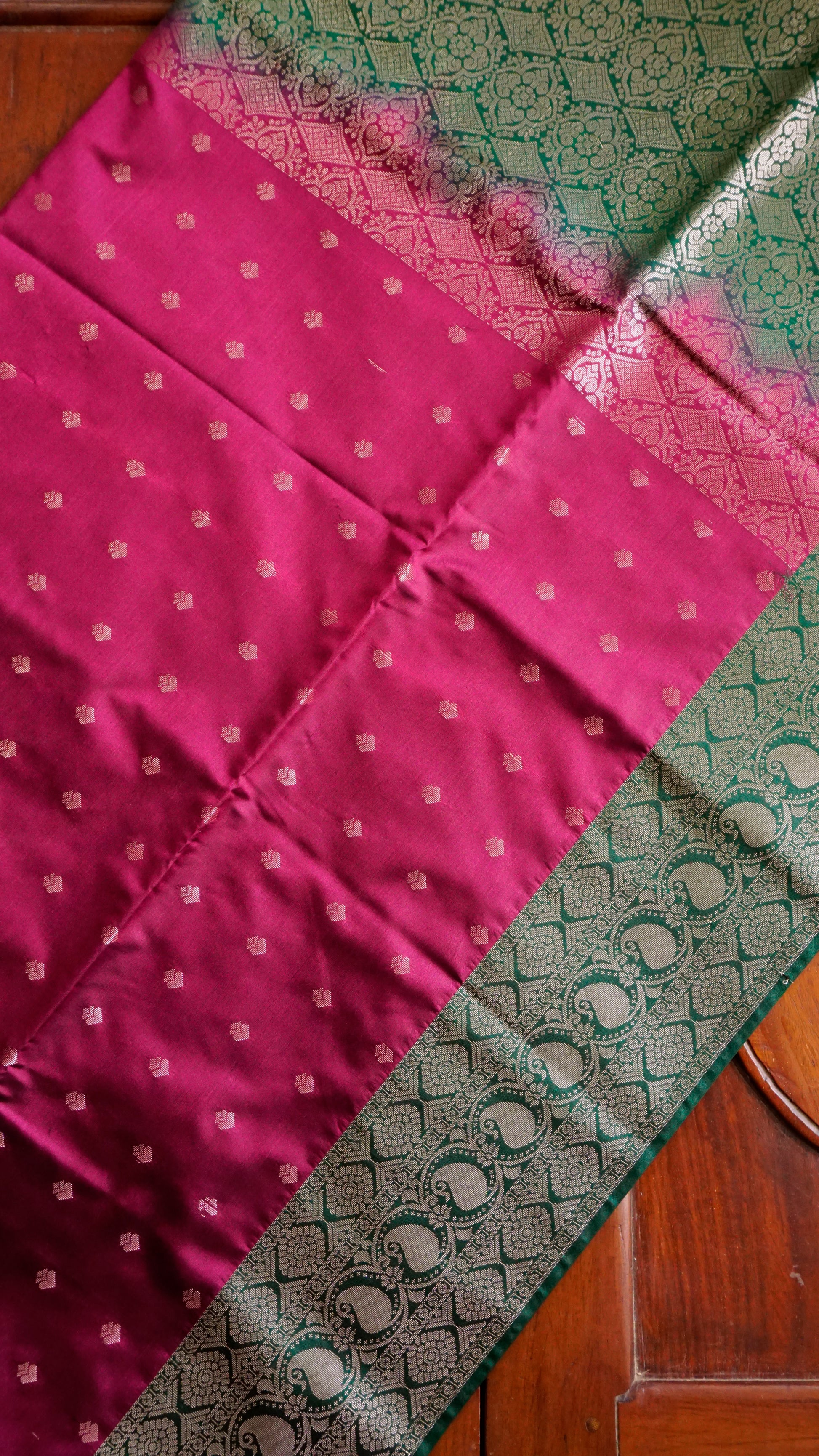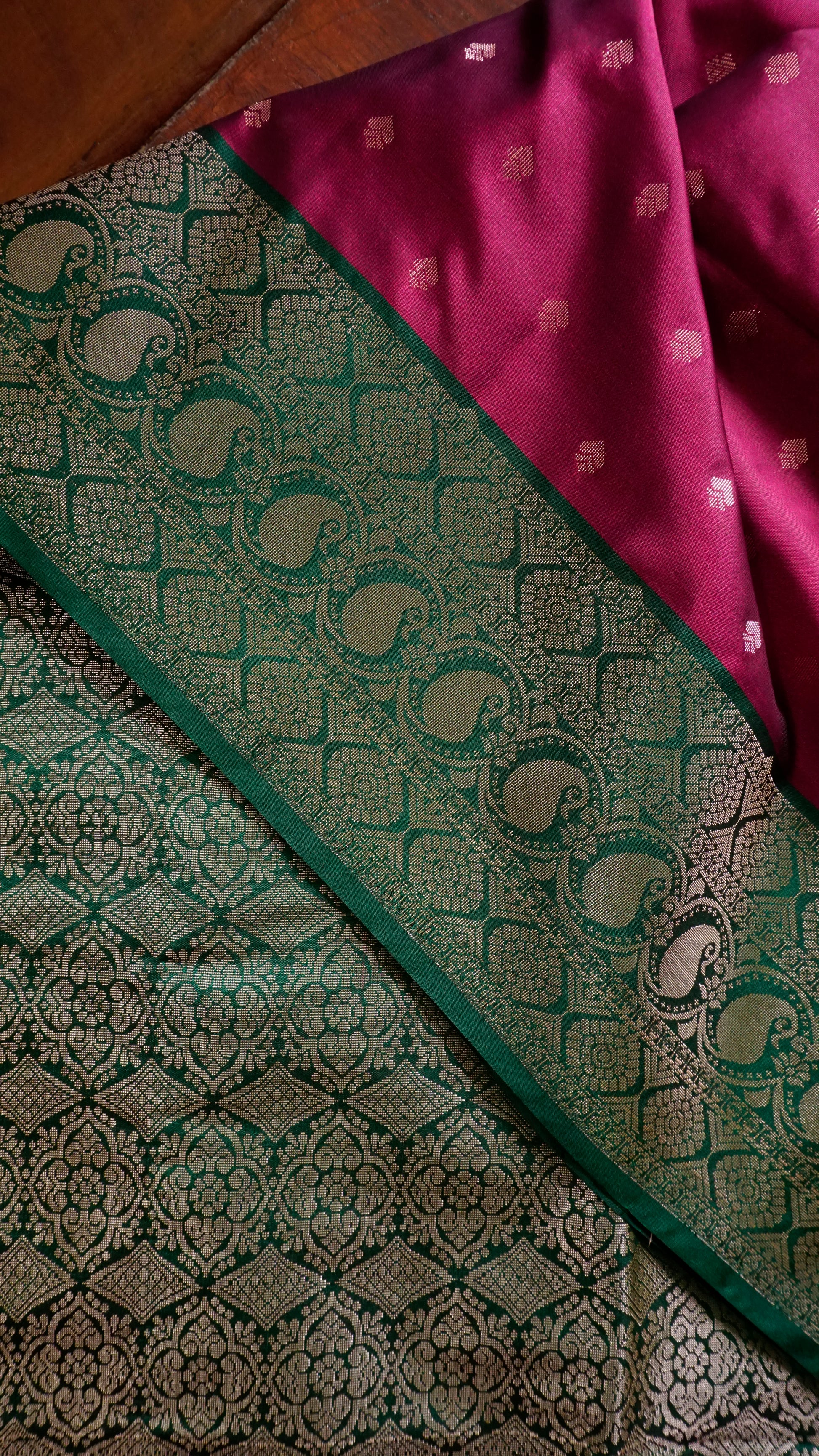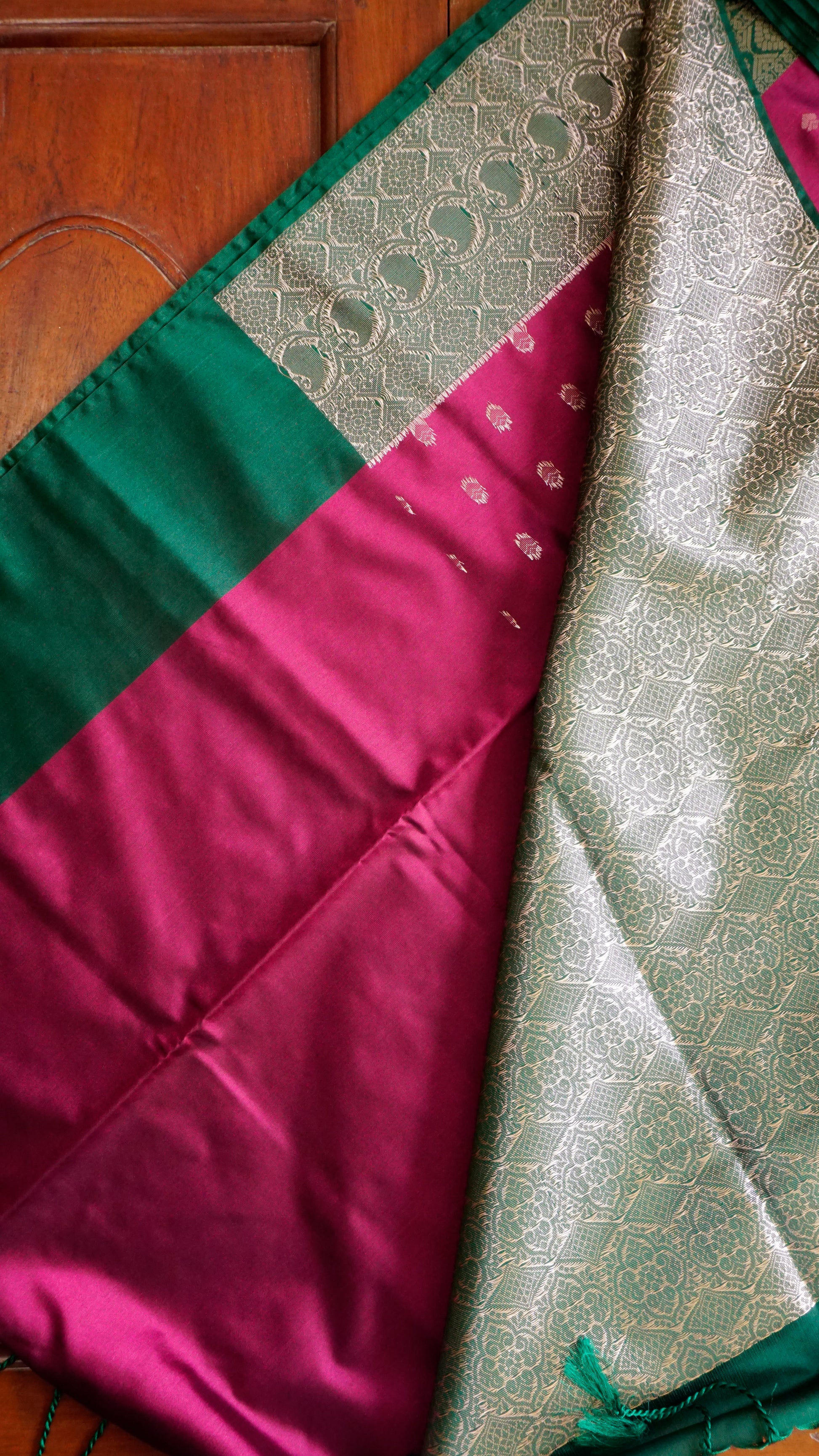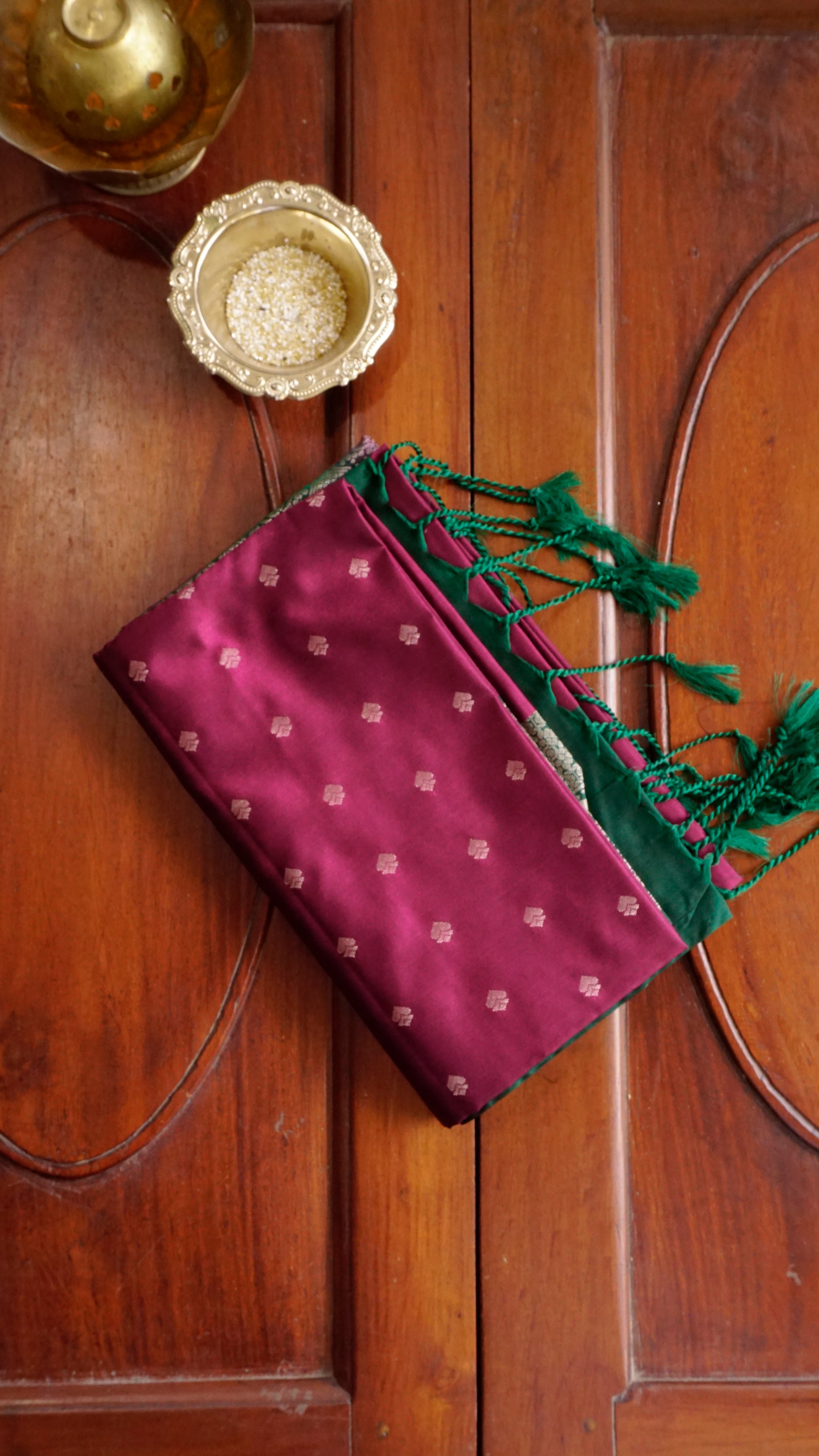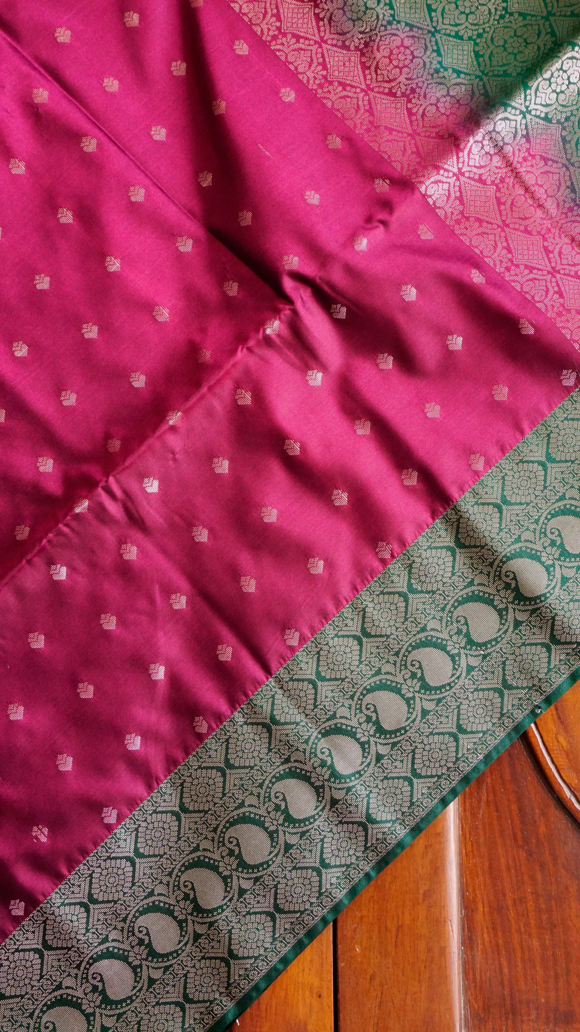 Elevate your festive style with this stunning burgundy & Green Semi Silk Saree. The body of the saree comes in a deep maroon shade adorned with dainty golden buttas, exuding subtle charm. Its rich green border with intricate golden zari motifs adds a bold contrast, while the grand pallu with elaborate floral and geometric weaving enhances its regal appeal. Finished with elegant green tassels, this saree is the perfect balance of tradition and sophistication.
