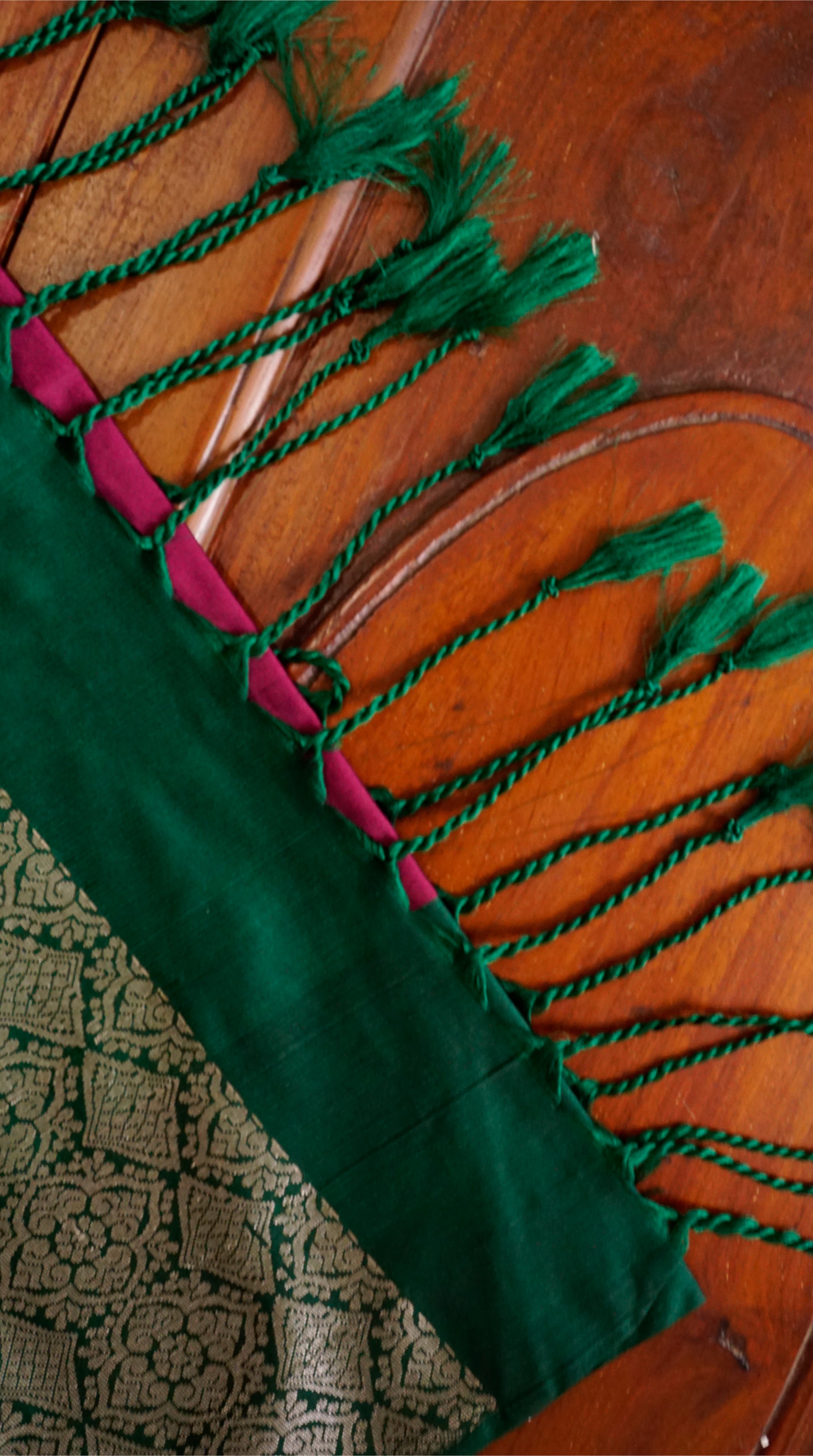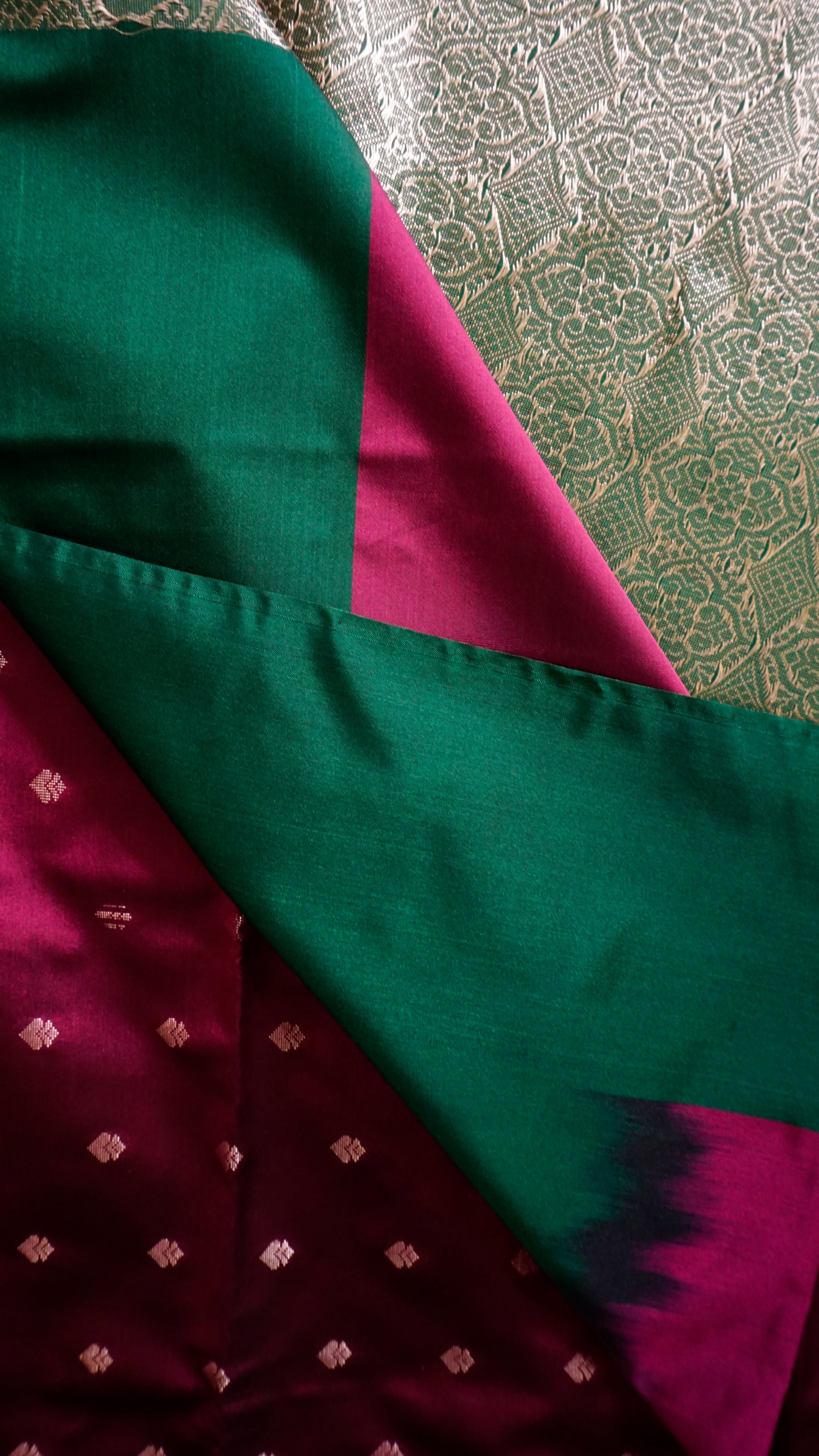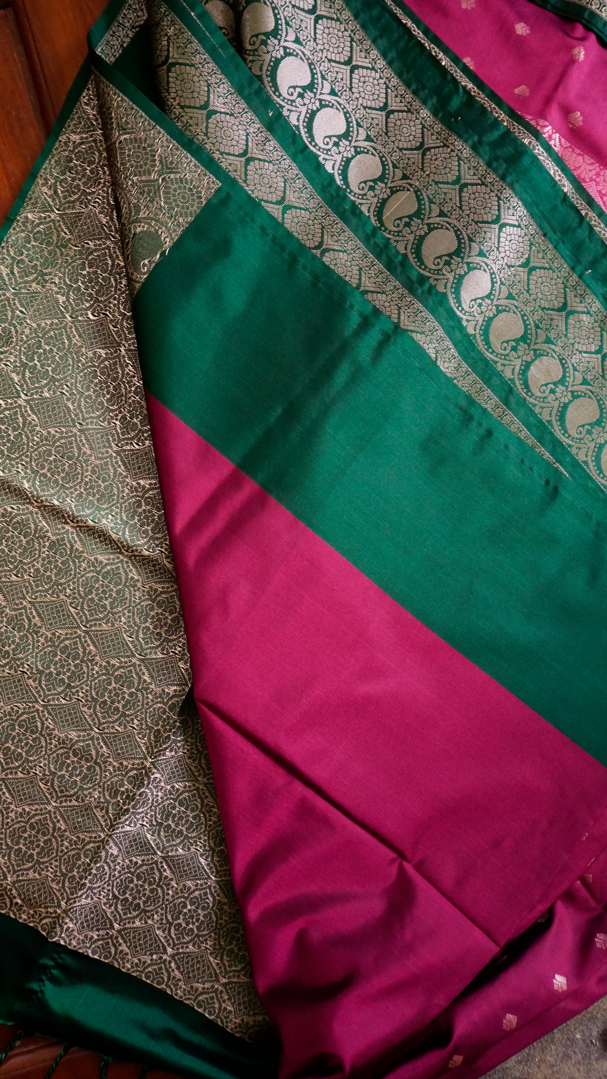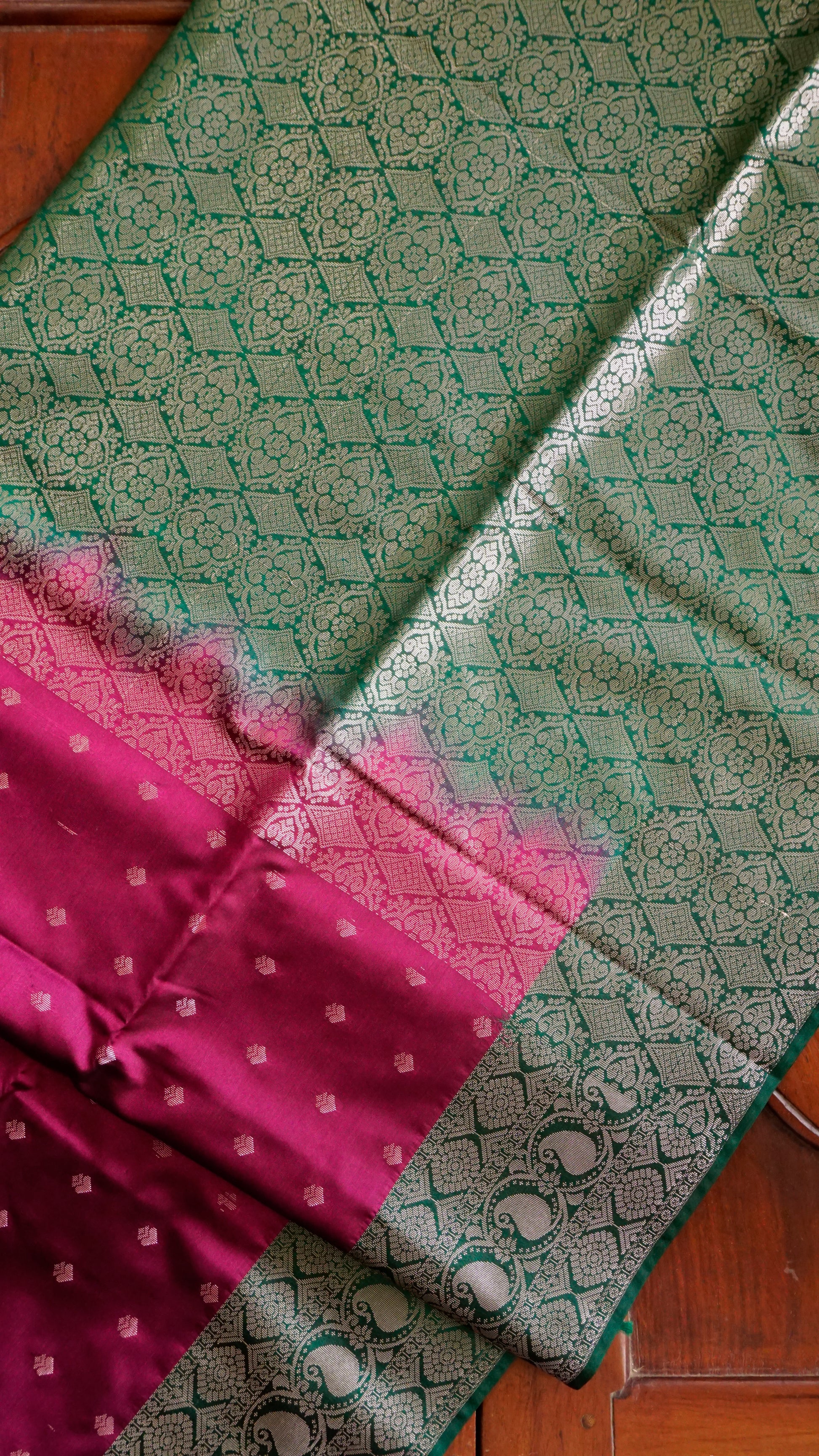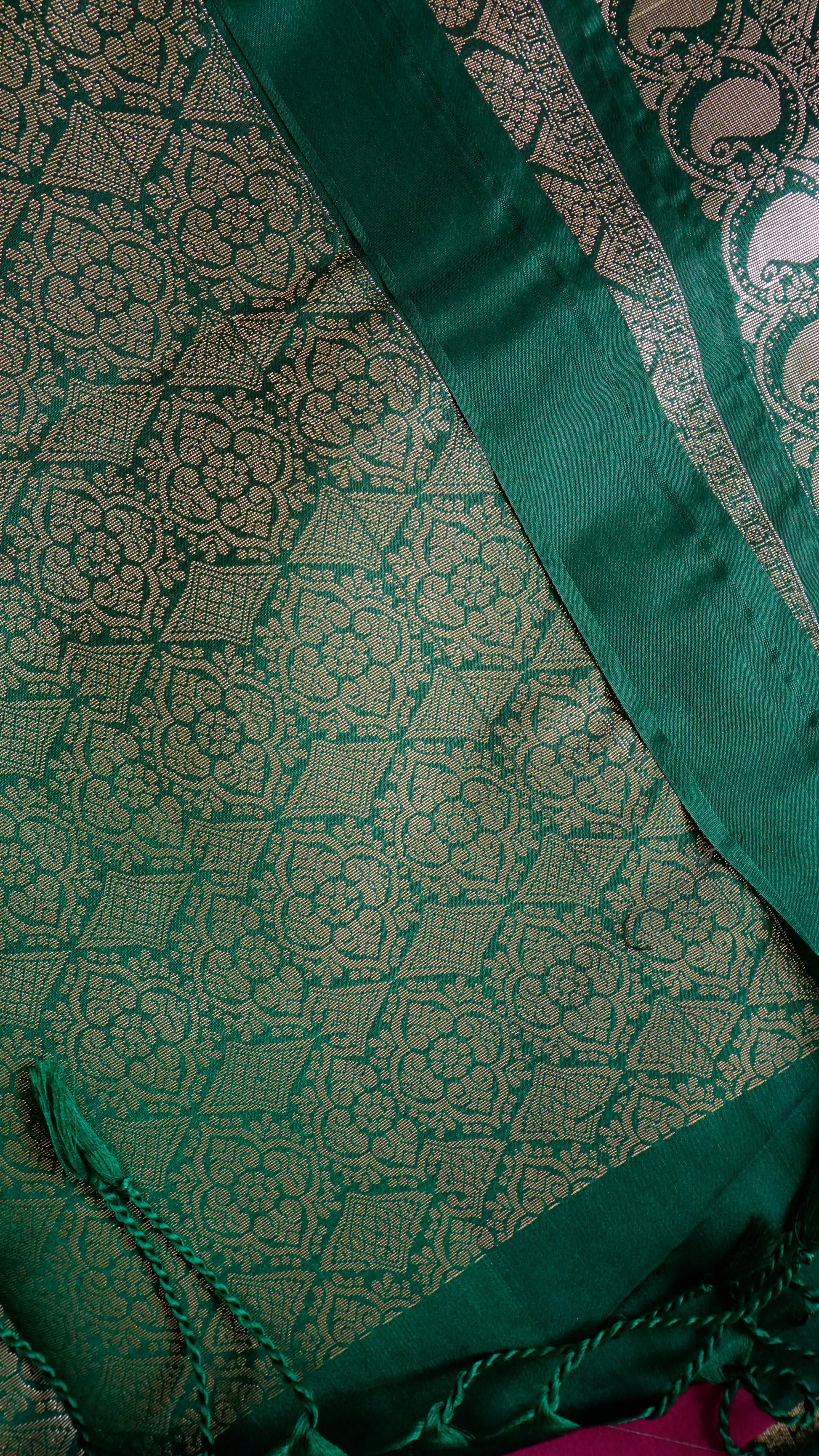 Elevate your festive style with this stunning burgundy & Green Semi Silk Saree. The body of the saree comes in a deep maroon shade adorned with dainty golden buttas, exuding subtle charm. Its rich green border with intricate golden zari motifs adds a bold contrast, while the grand pallu with elaborate floral and geometric weaving enhances its regal appeal. Finished with elegant green tassels, this saree is the perfect balance of tradition and sophistication.