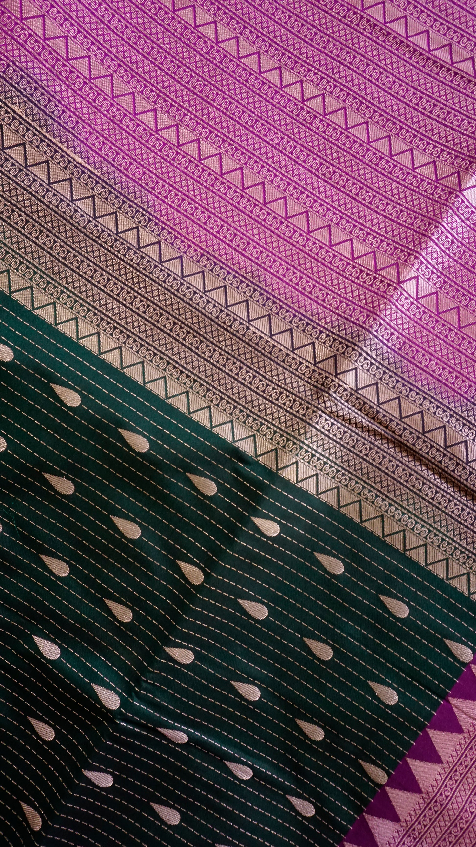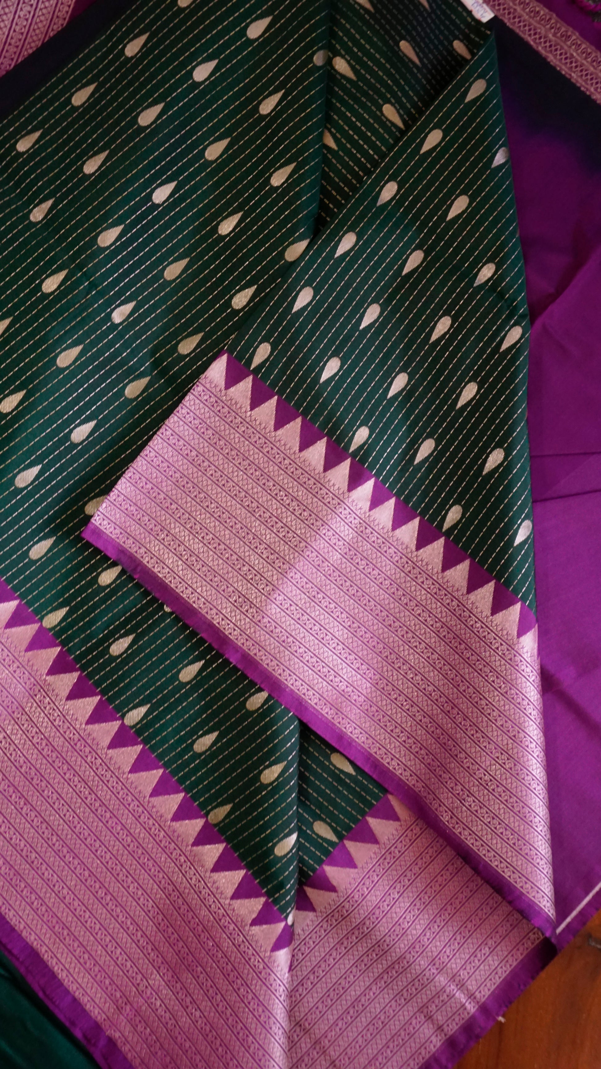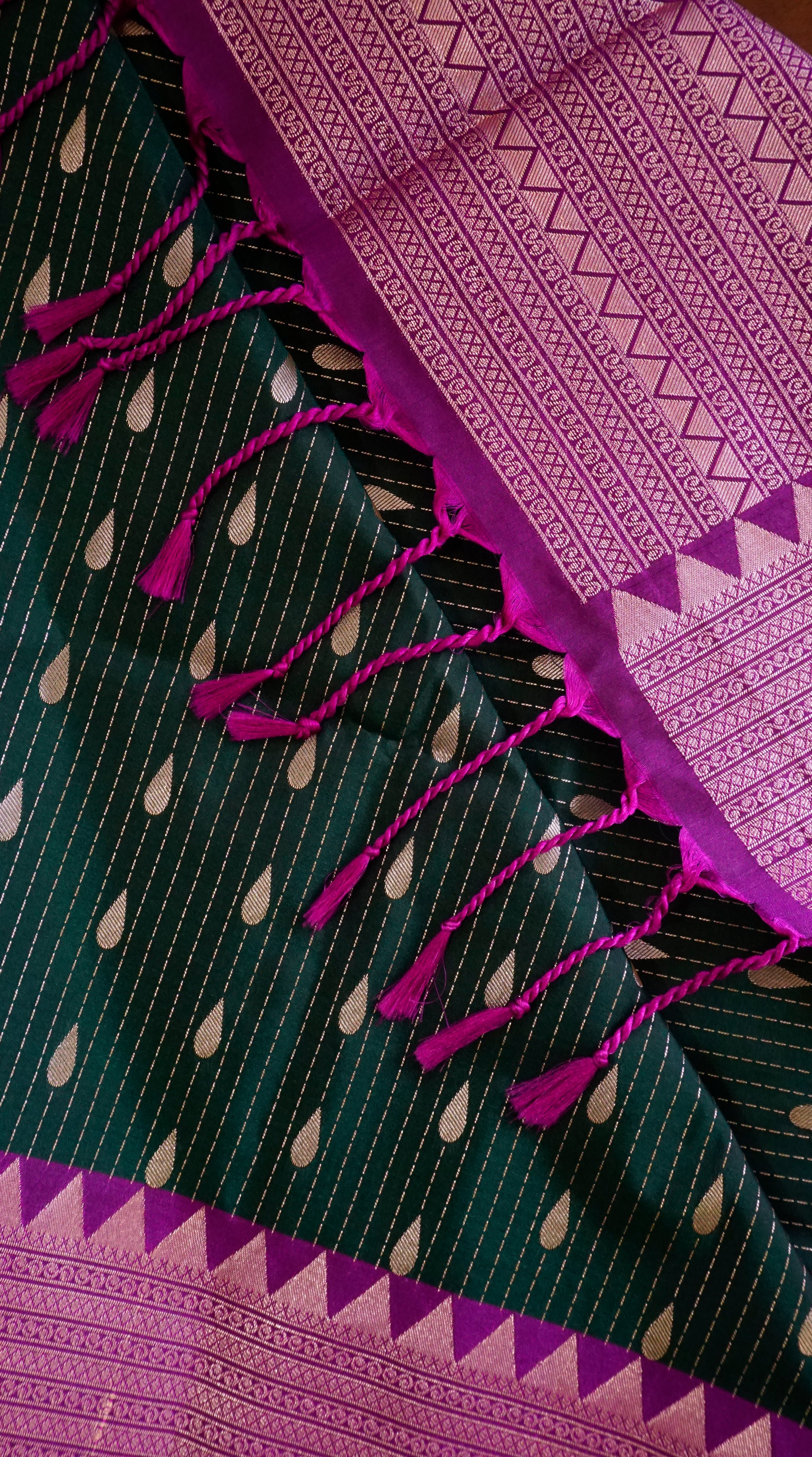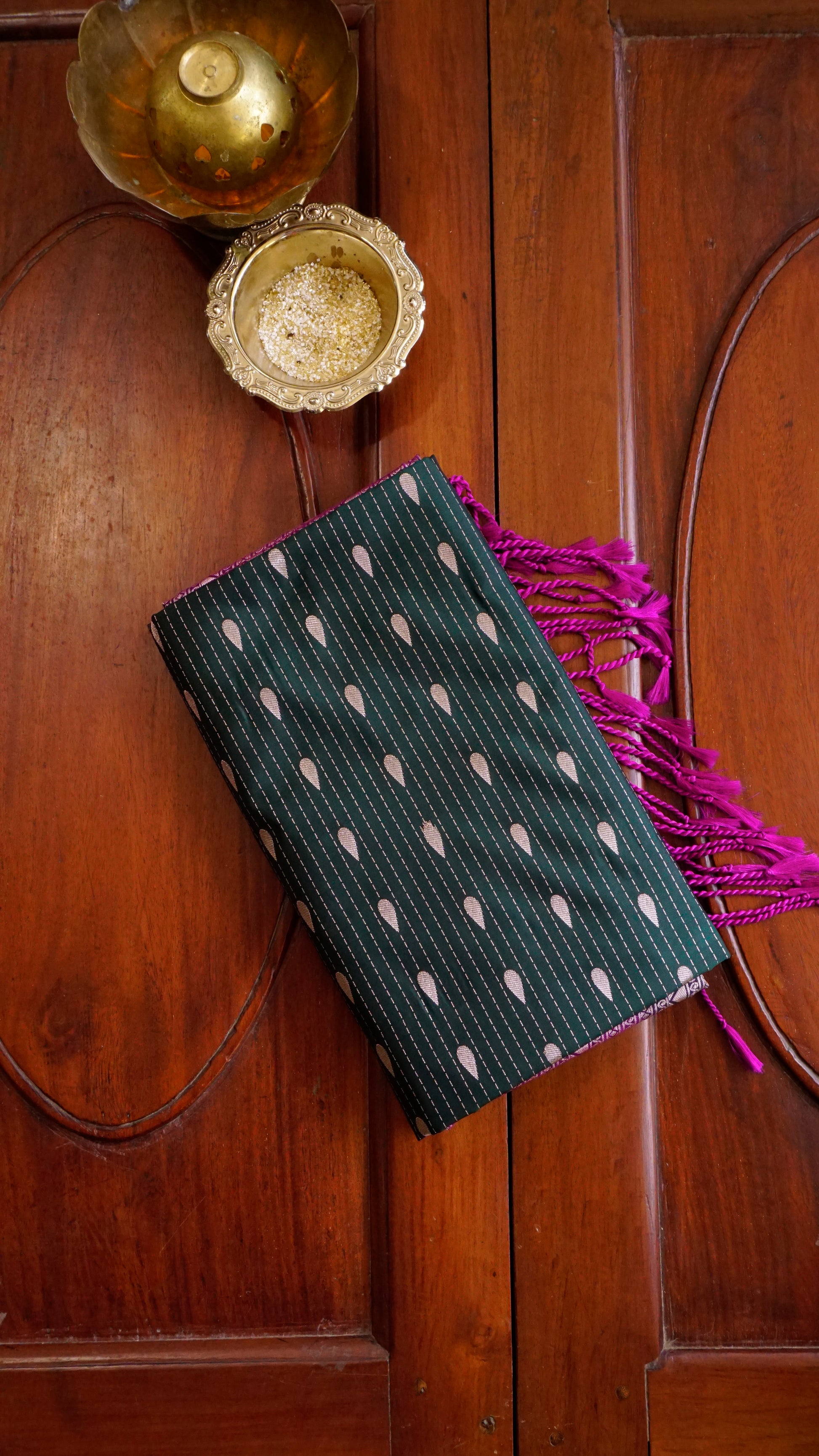 This rich green semi-silk saree is embellished with delicate zari buttas in drop motifs, set in clean vertical lines for a sleek finish. It's a saree that flawlessly mixes elegance and vibrancy.  The striking magenta pallu and border, which are elaborately woven with zari patterns influenced by geometric and floral patterns, are the focal point of this drape, lending it depth and grandeur.