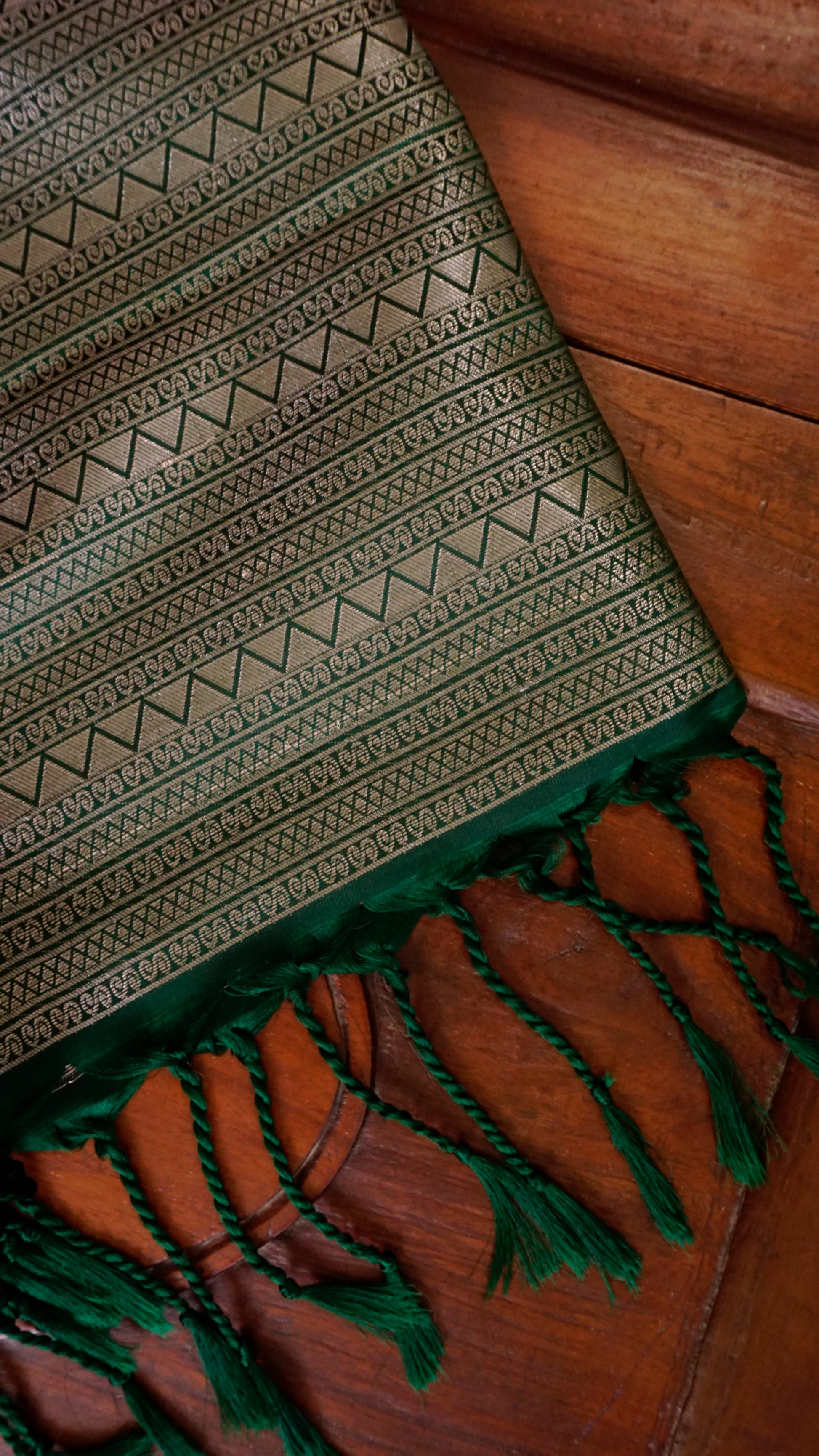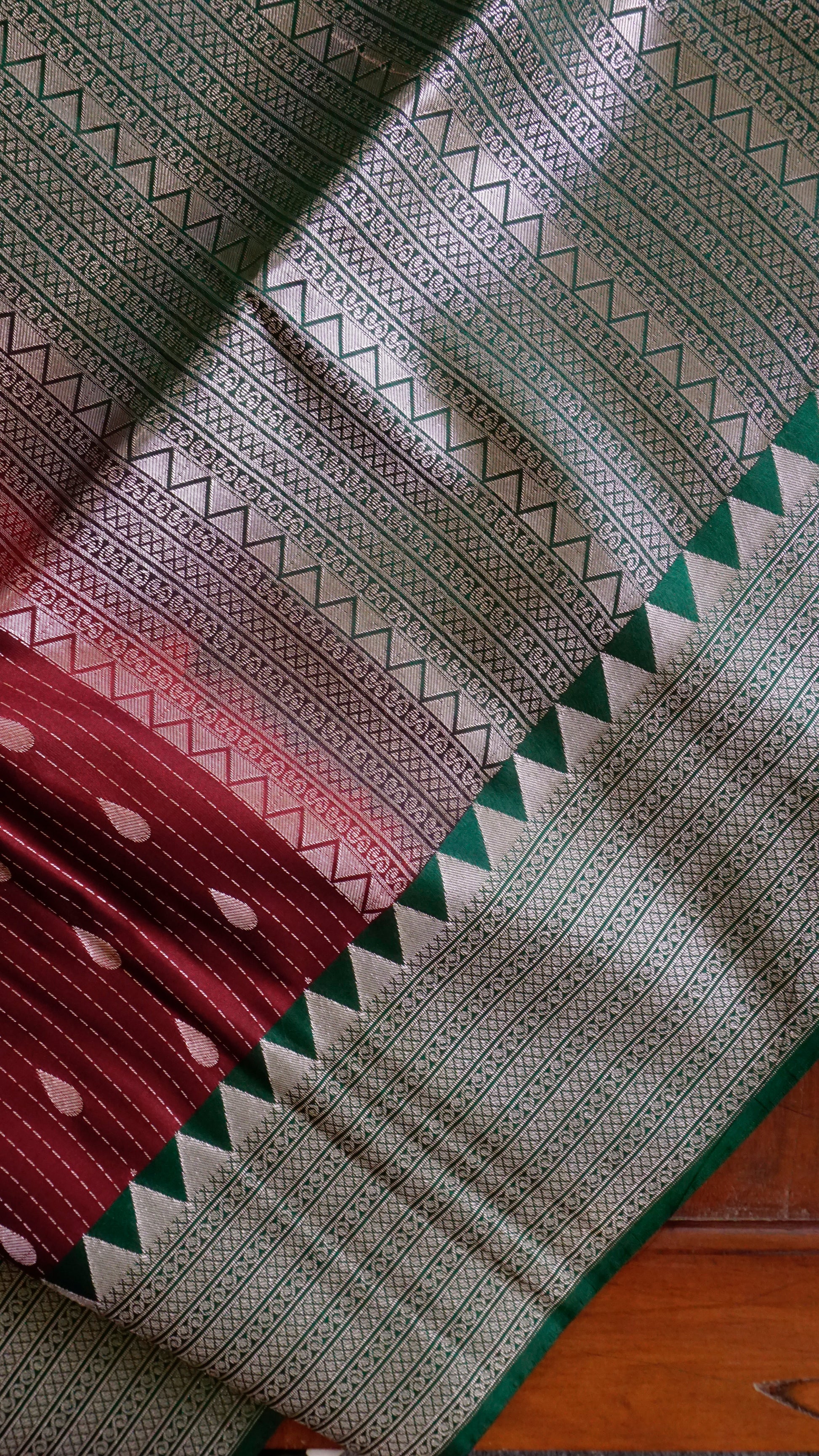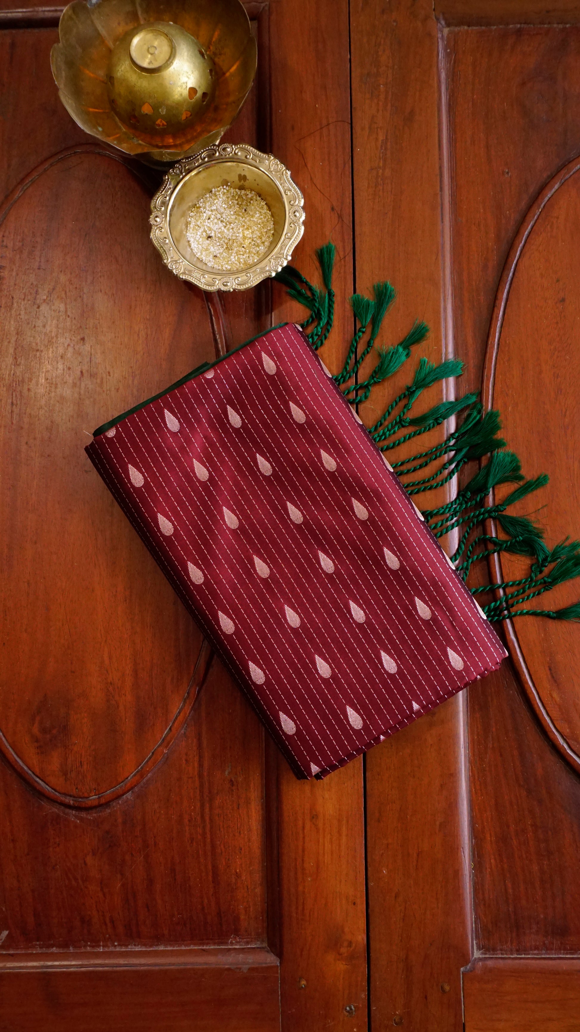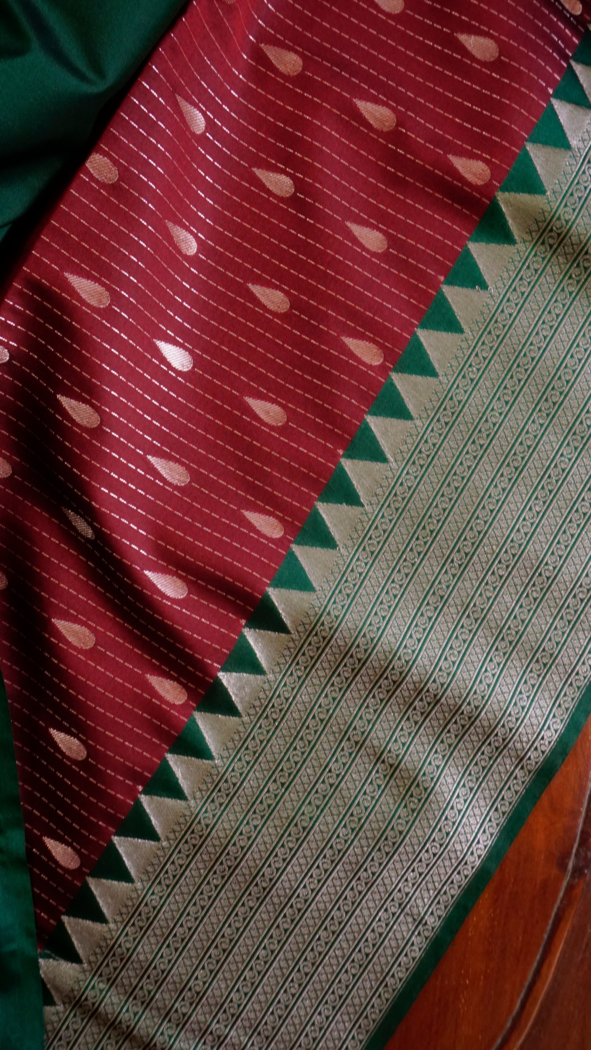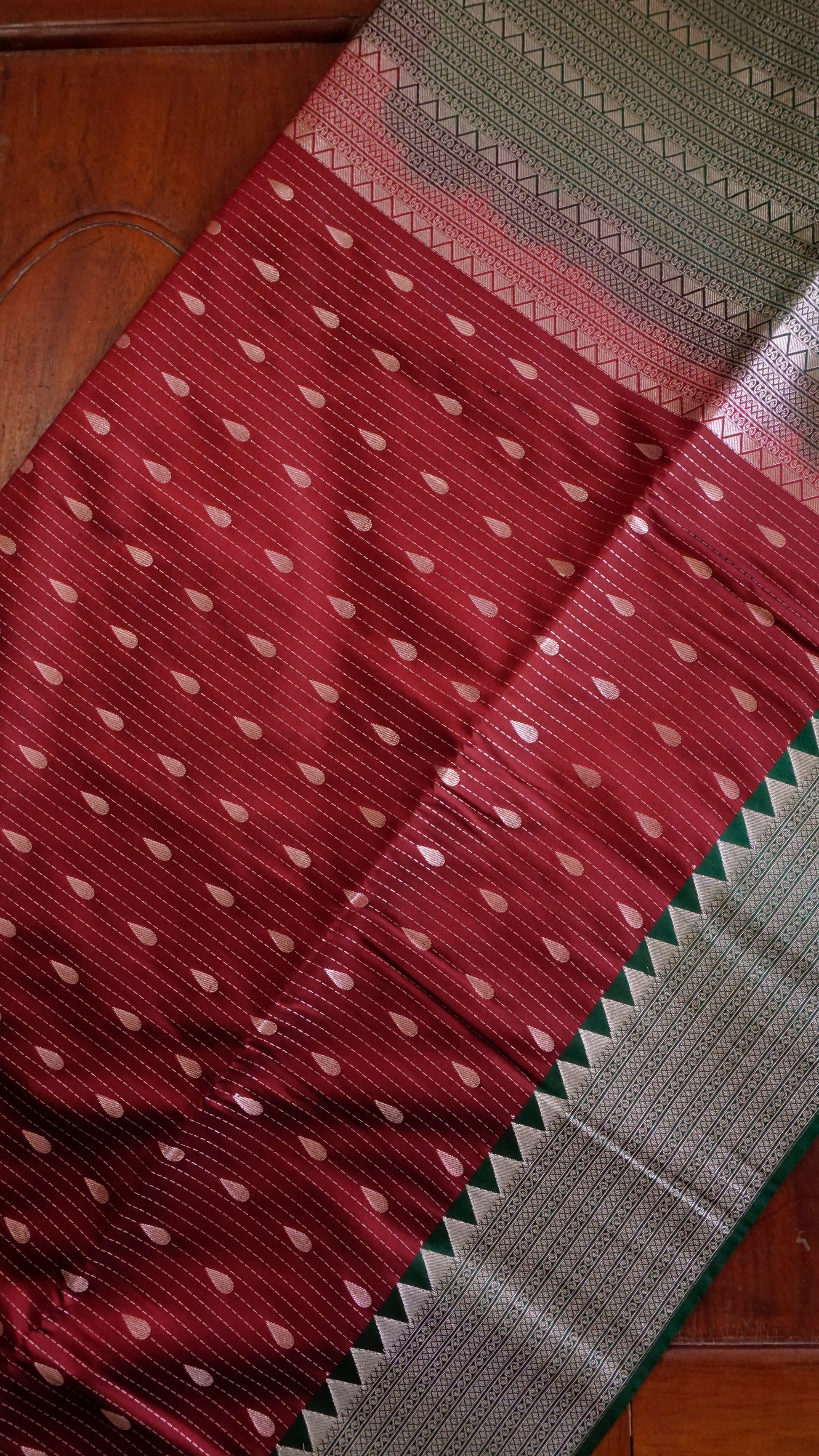 The saree body features deep maroon with golden teardrop buttas aligned in stripes, adding a graceful rhythm to the fabric. The rich green pallu with intricate golden zari weave brings a majestic contrast, beautifully finished with traditional temple-style border motifs.
