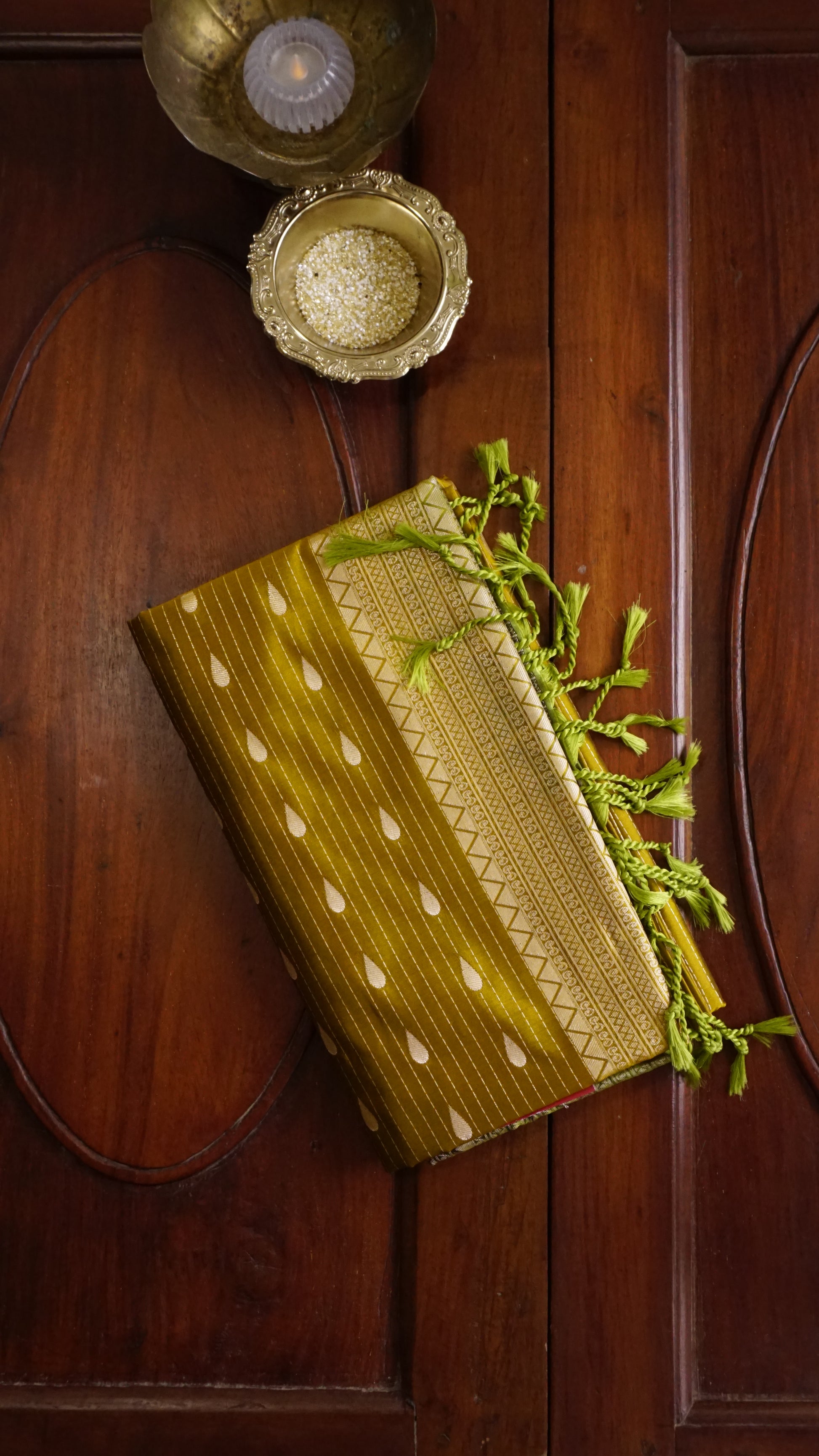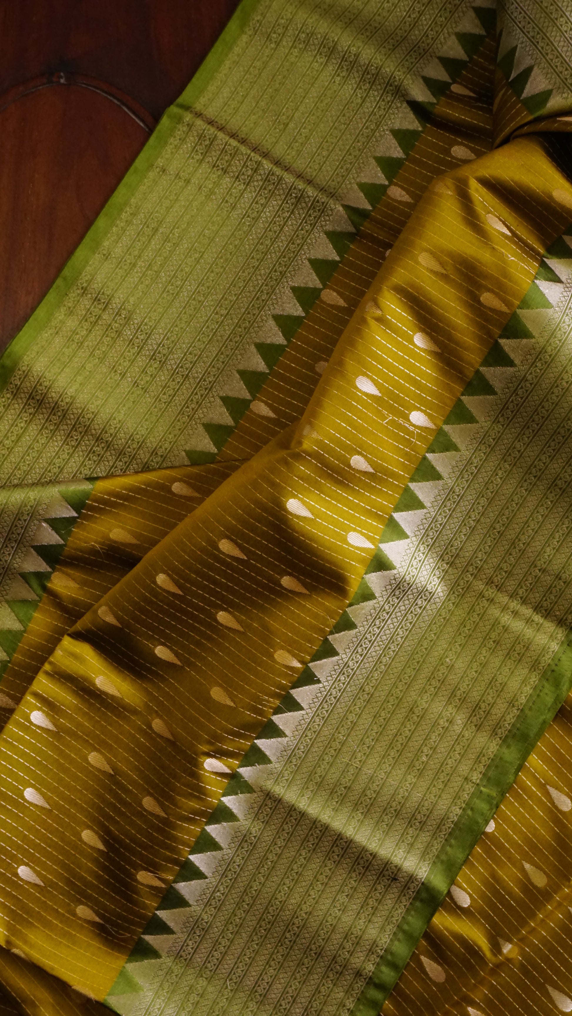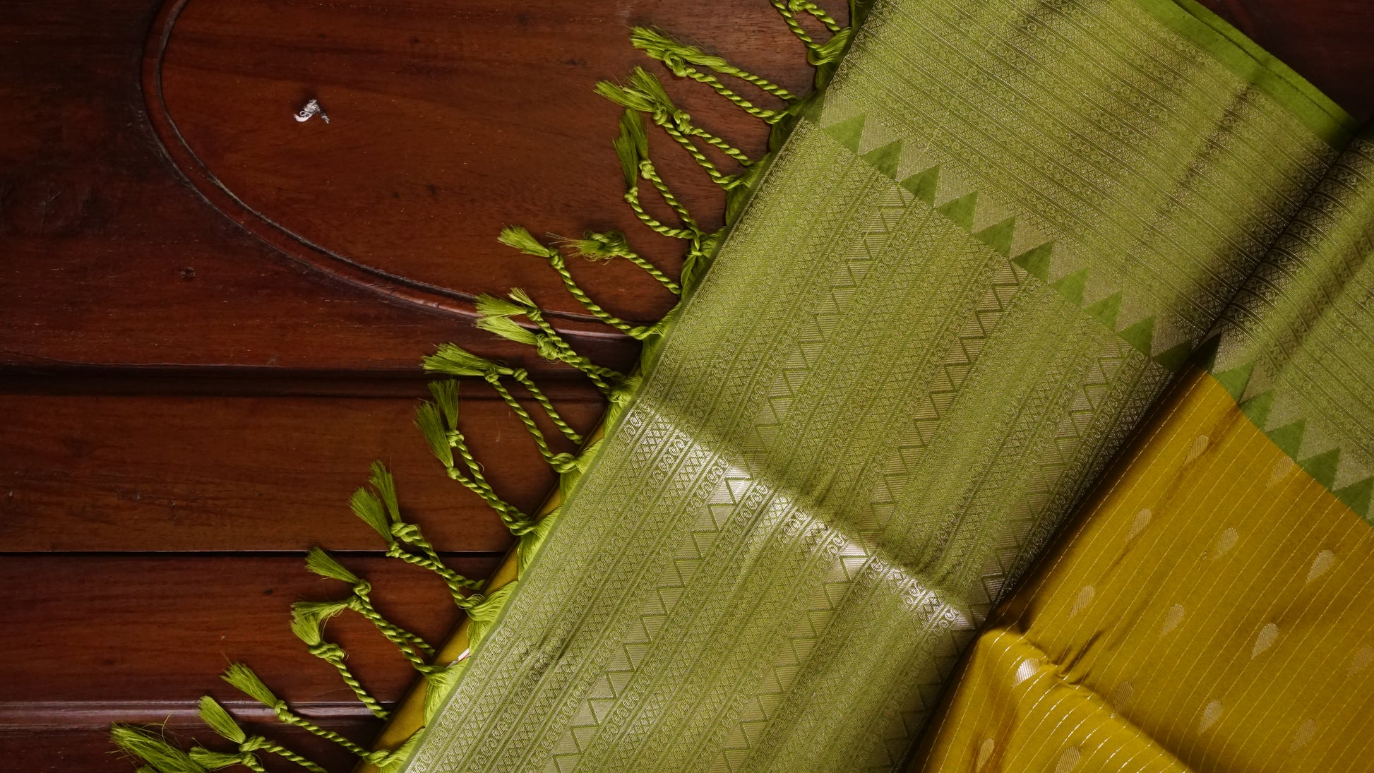 Add a splash of vibrance to your wardrobe with this green and mustard semi-silk saree, gracefully adorned with teardrop zari motifs and geometric border weaving. The subtle sheen of the semi-silk fabric, paired with a contrast pallu and delicate tassels, makes this saree a versatile choice for festive gatherings and cultural occasions.