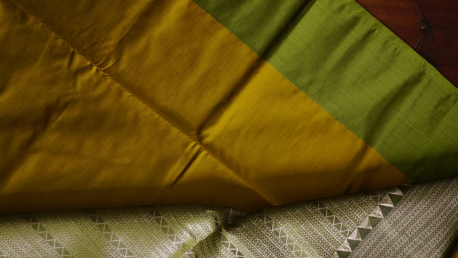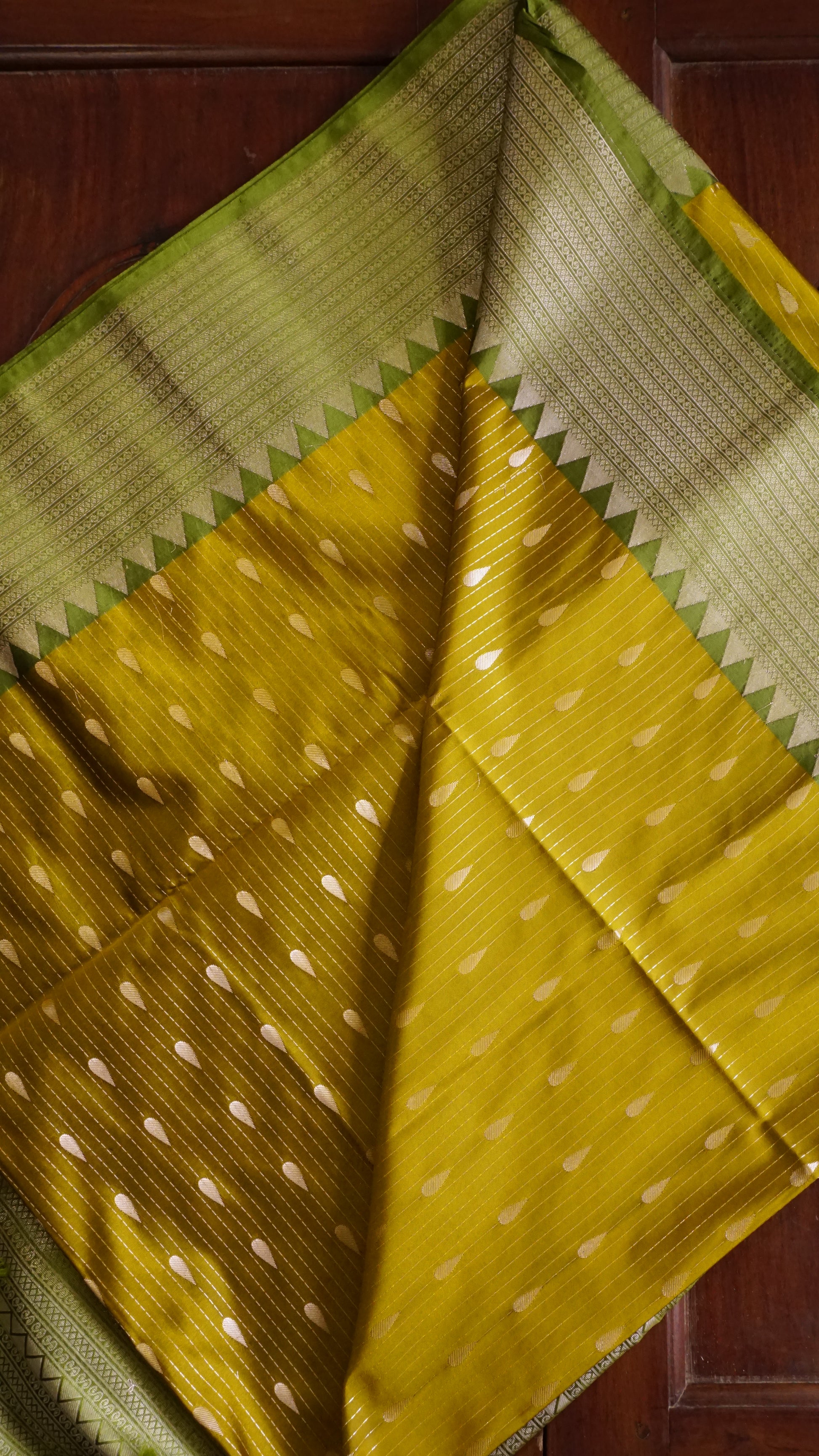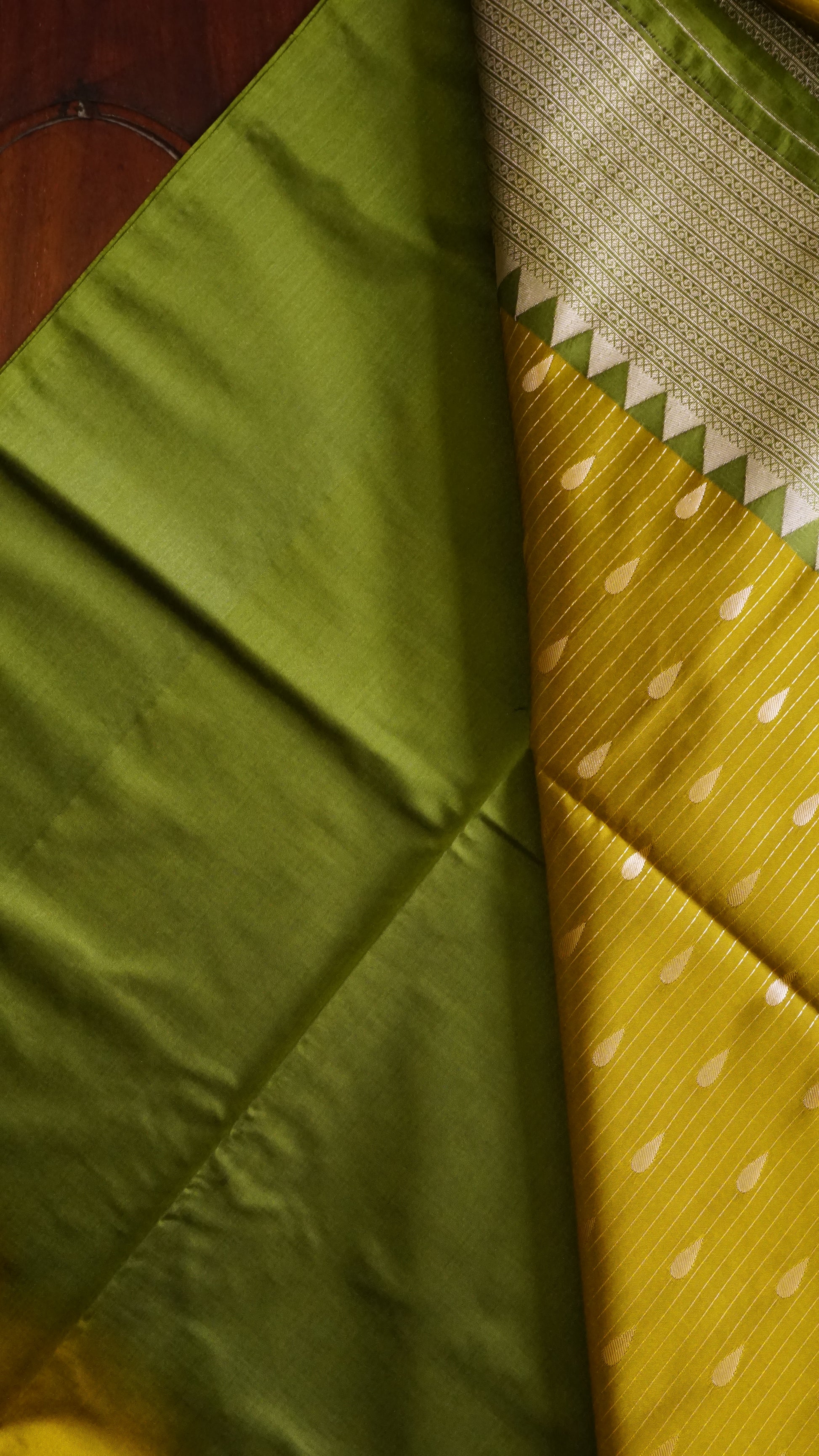 Add a splash of vibrance to your wardrobe with this green and mustard semi-silk saree, gracefully adorned with teardrop zari motifs and geometric border weaving. The subtle sheen of the semi-silk fabric, paired with a contrast pallu and delicate tassels, makes this saree a versatile choice for festive gatherings and cultural occasions.