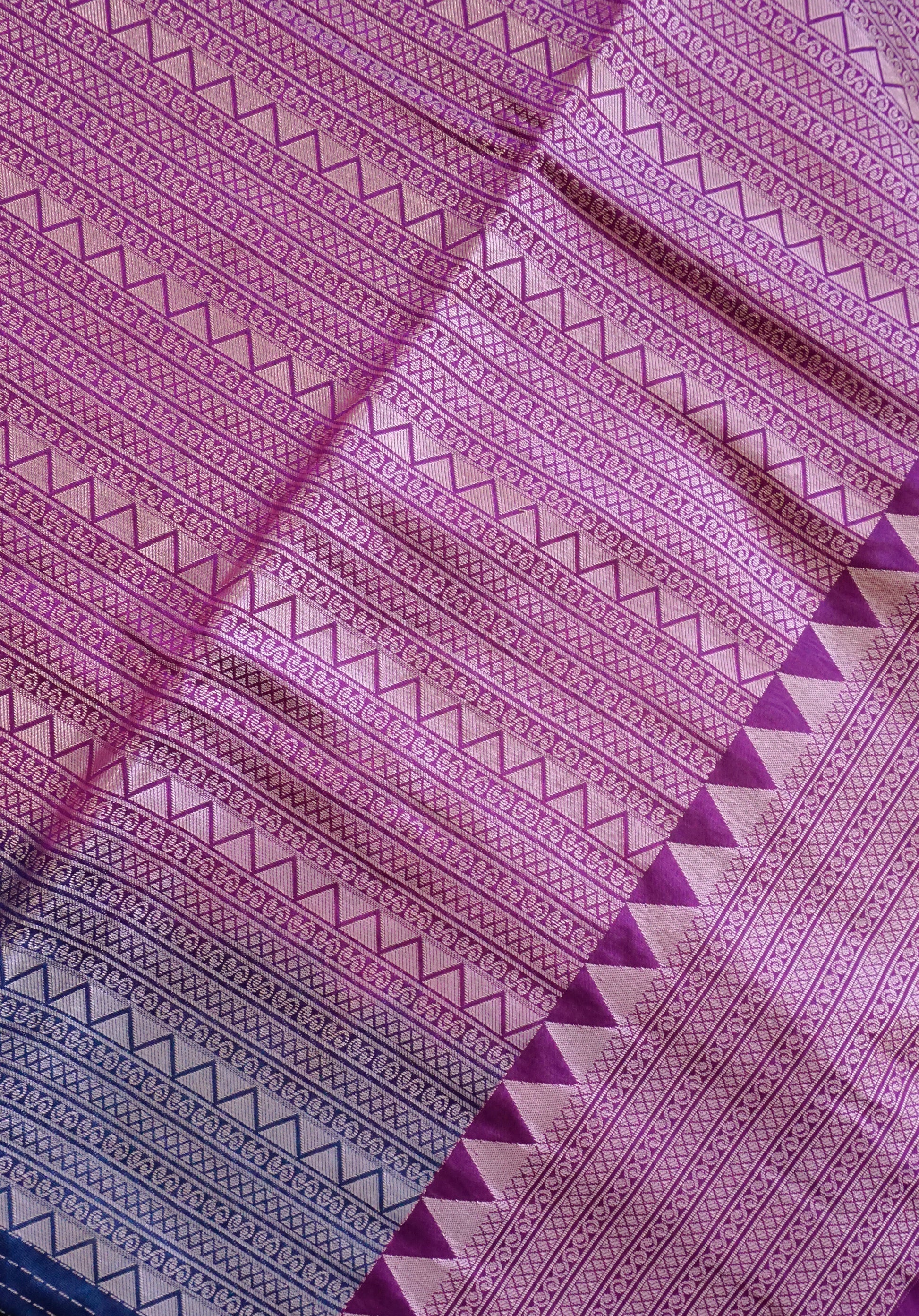 Contrasting rich purple border adorned with intricate zari patterns in geometric and floral designs