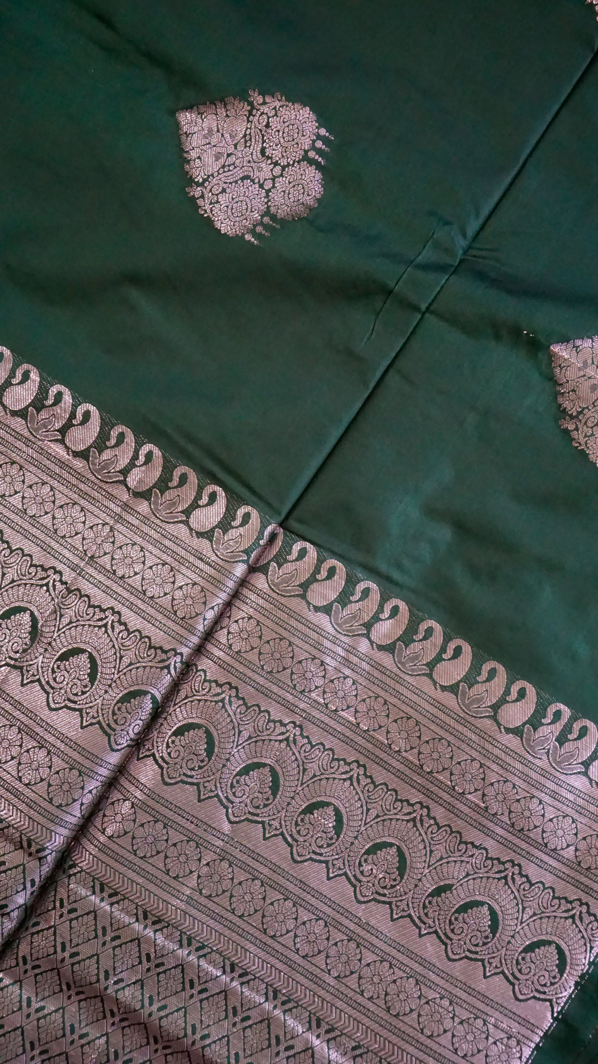 Product Description: This gorgeous green semi-silk saree, with its elaborate pallu and border silver zari weaving, exudes elegance. Delicate buttas draw attention to the deep green body, while the opulent silver embellishments lend an air of royalty. A classic addition to any ethnic wardrobe, this saree is ideal for weddings, festivals, and traditional festivities.