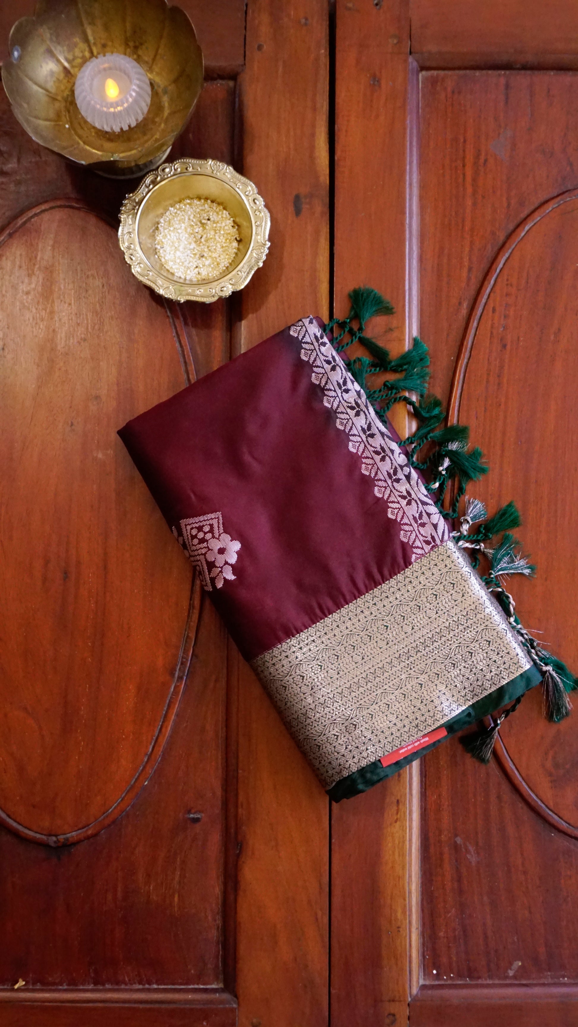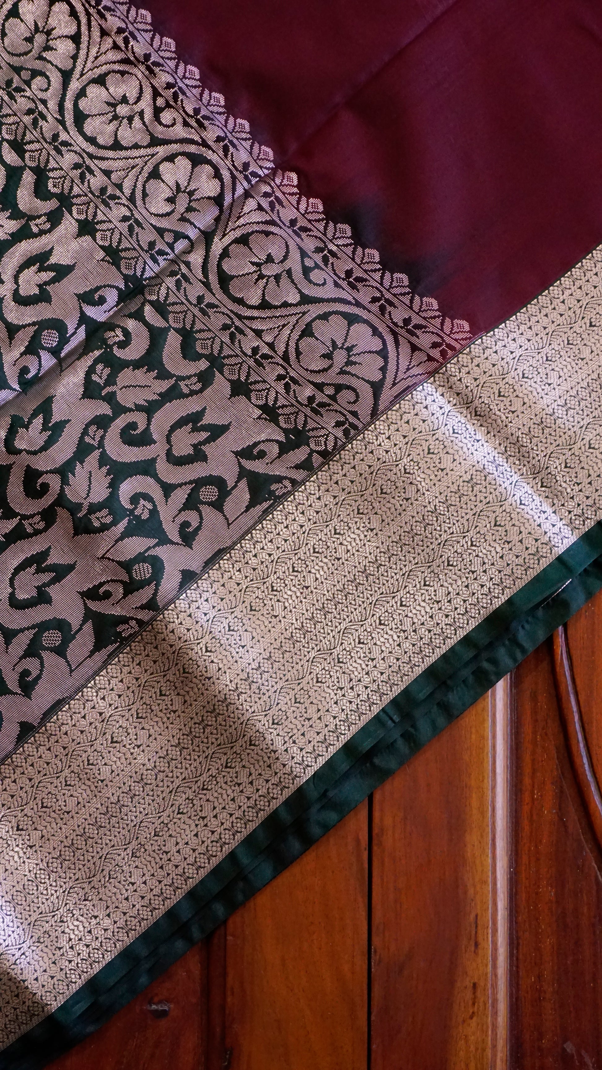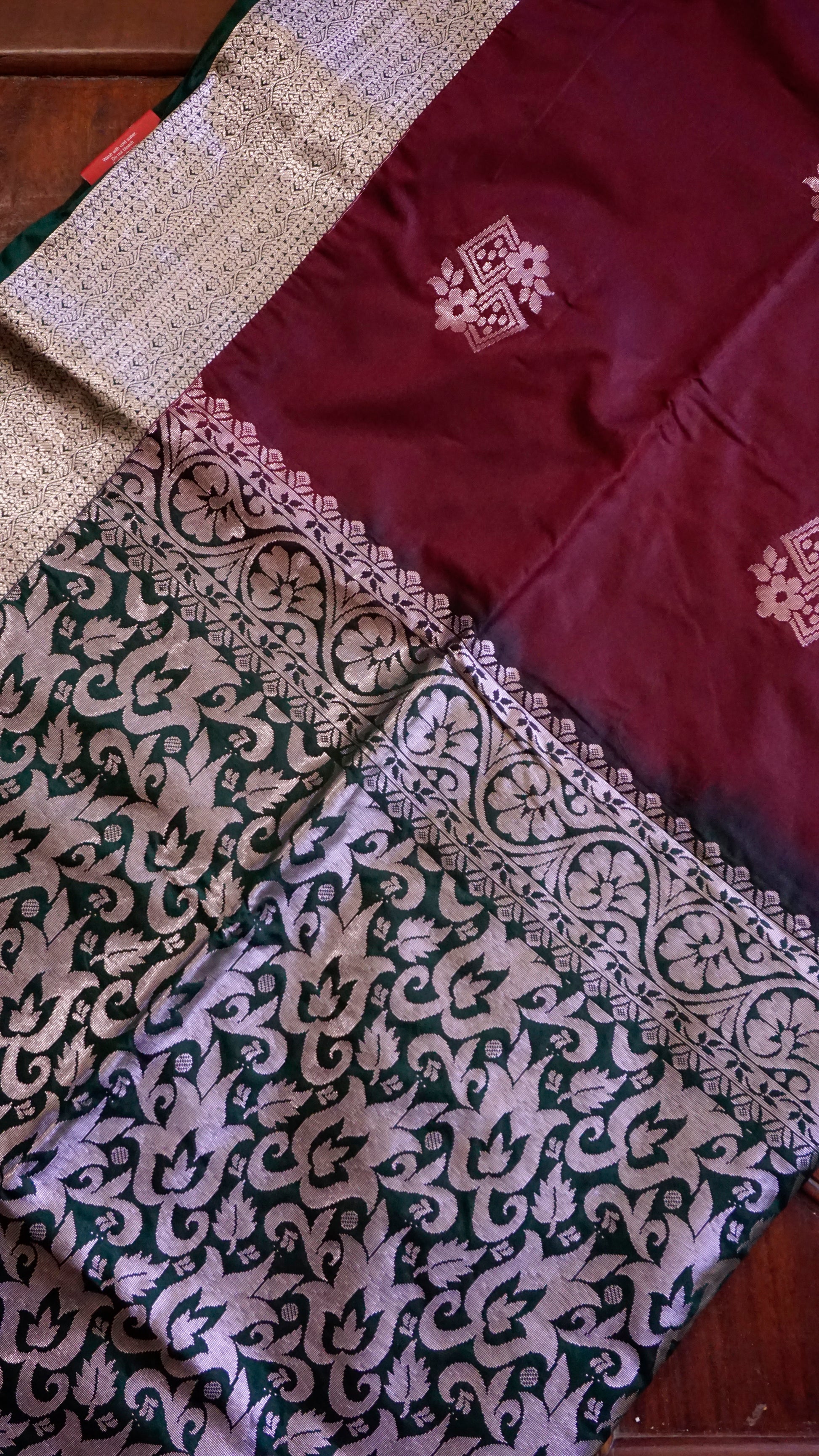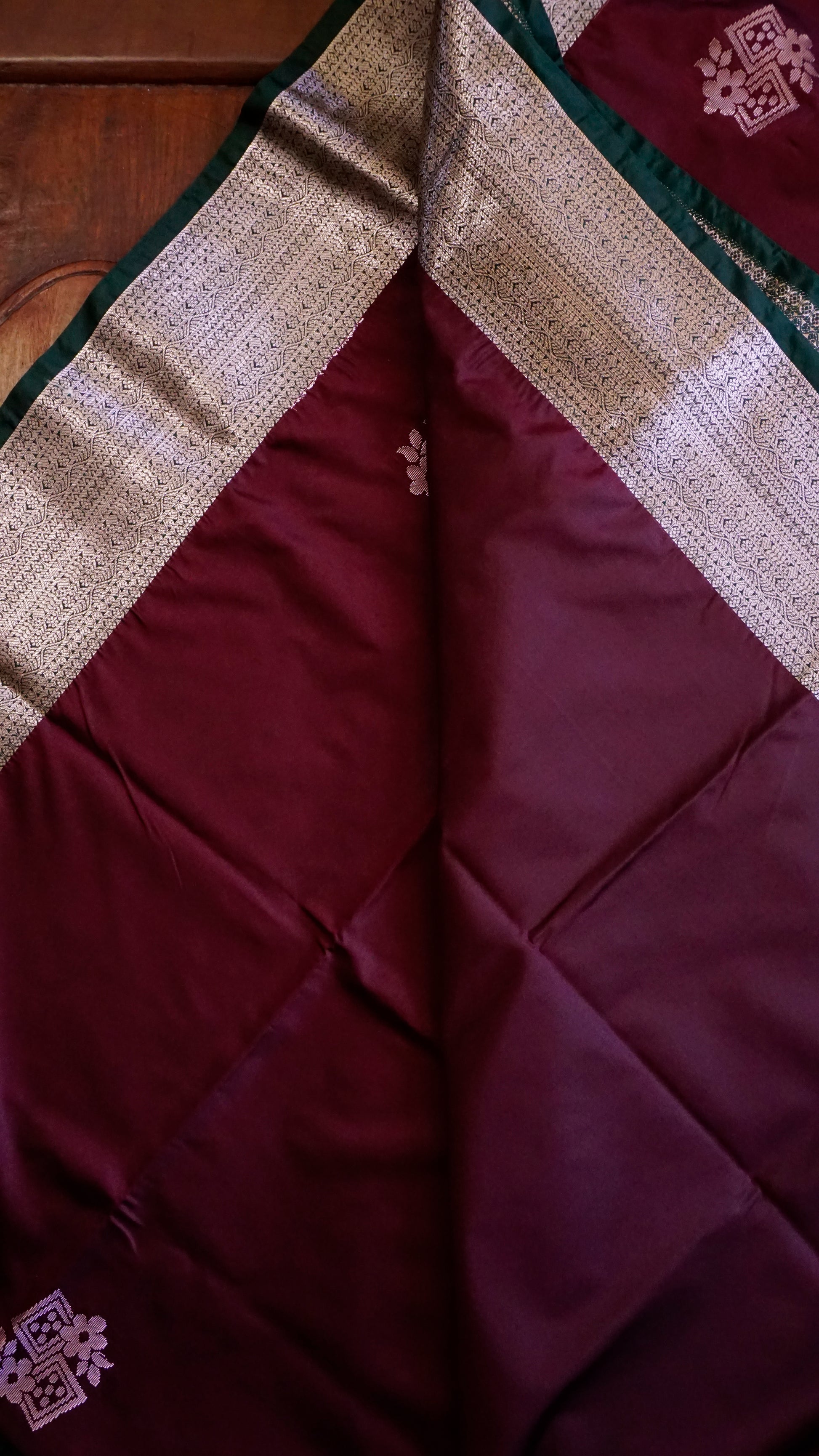 This semi-silk saree comes in a rich maroon body paired with a deep green pallu and border. The saree is highlighted with intricate silver zari motifs, floral vines, and geometric buttas across the body and pallu. The tassel finish on the pallu adds a graceful touch.