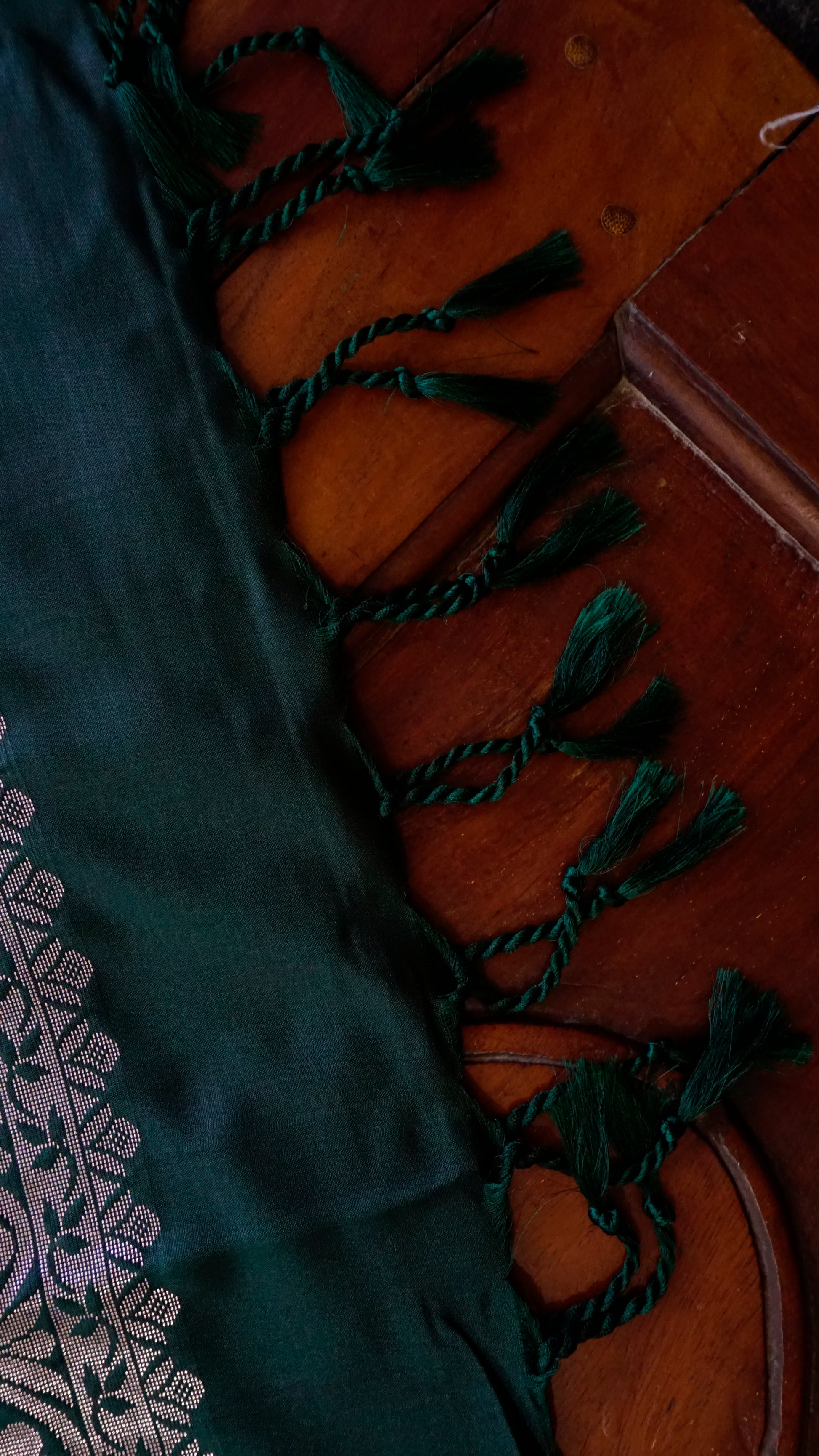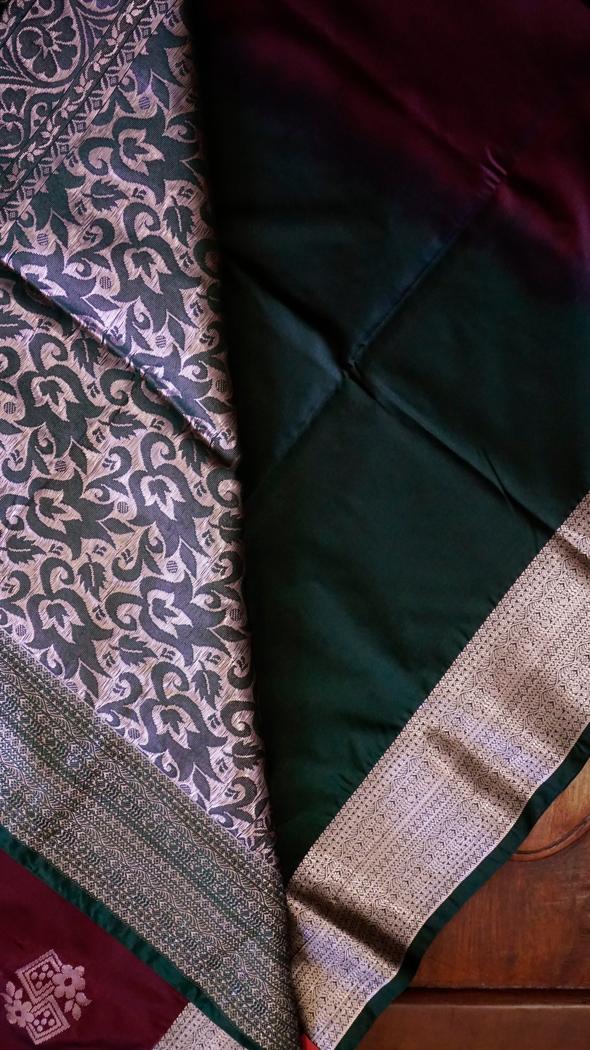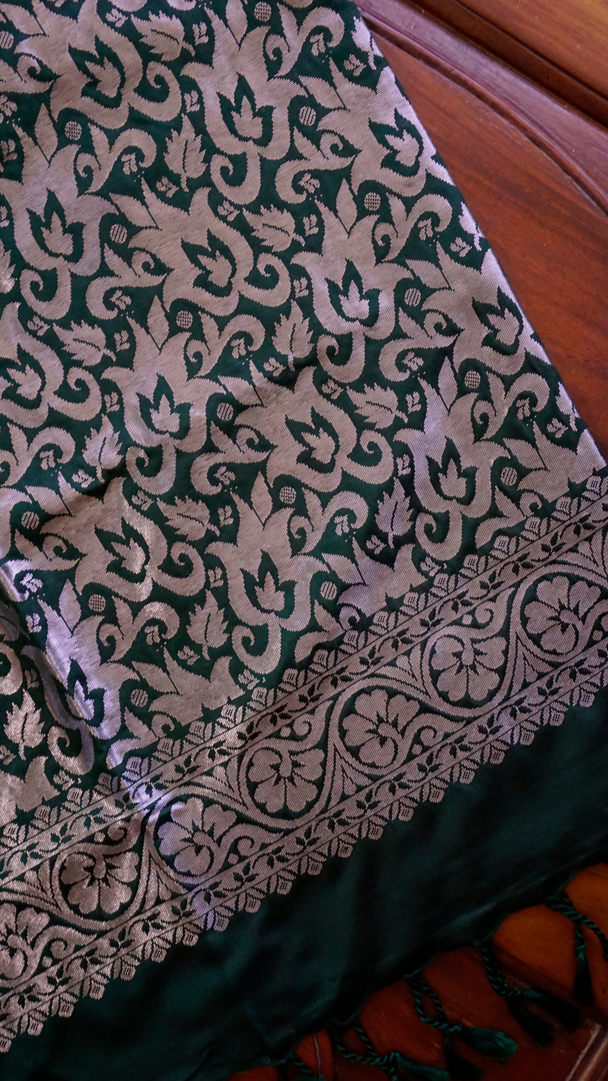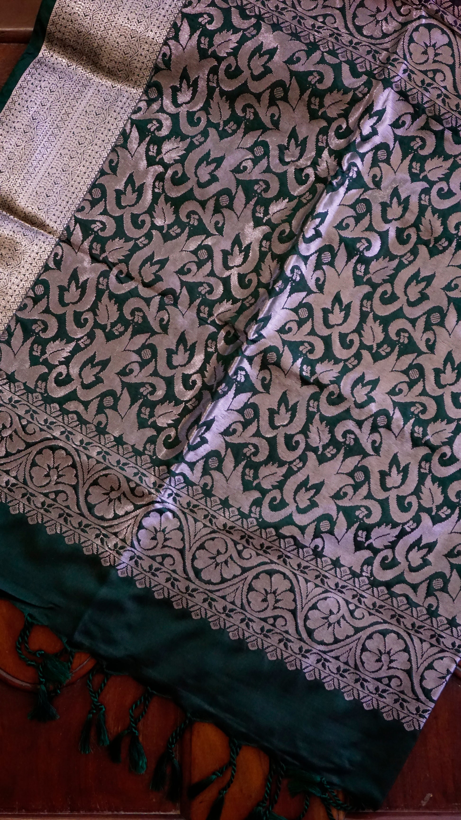 Border & Pallu: Deep Green with detailed silver zari weaving