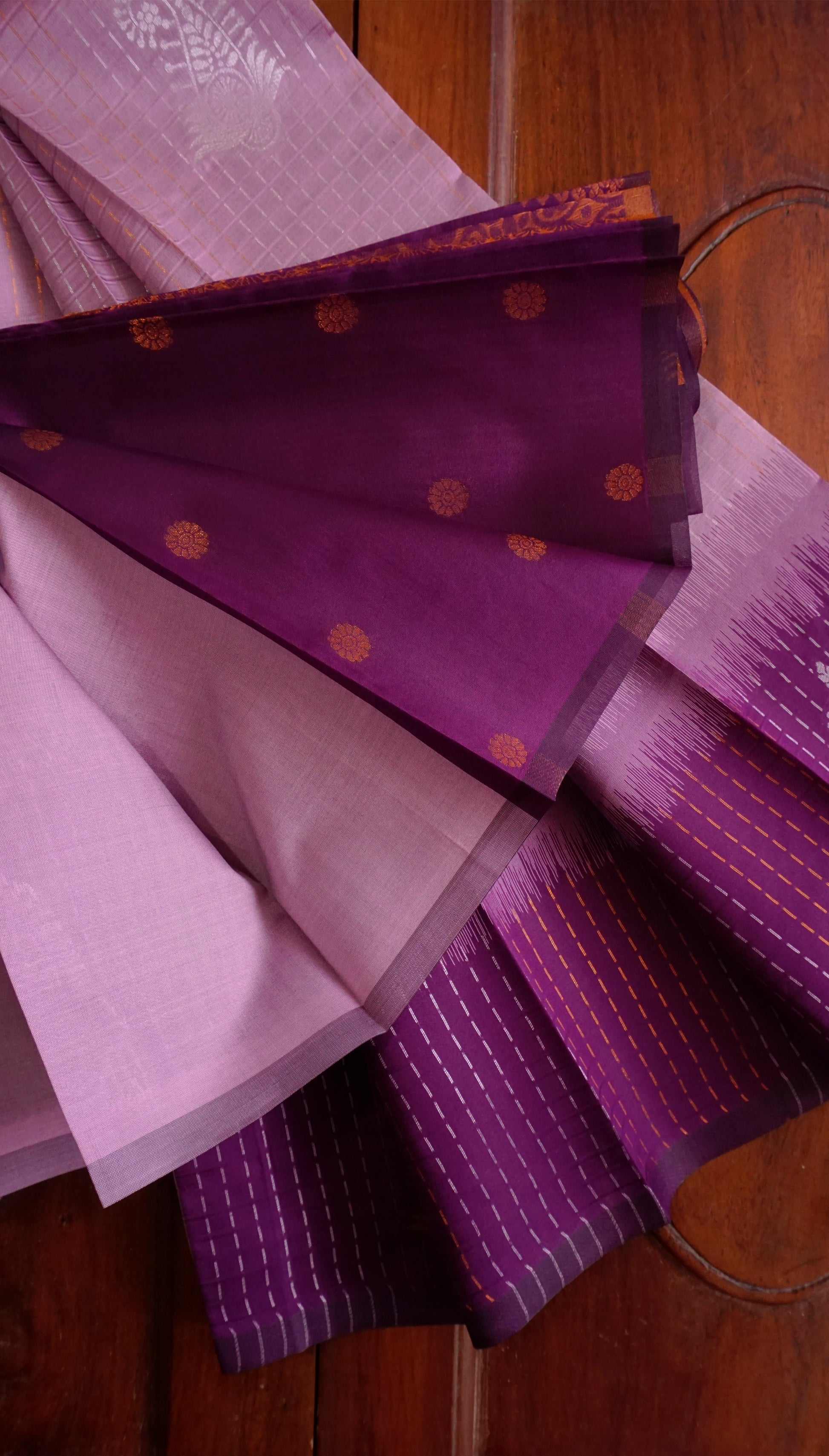 Drape yourself in elegance with this semi silk saree, blending traditional charm with a modern touch. The rich shades of purple are enhanced with delicate golden woven motifs and a striking contrast border and pallu. Lightweight yet graceful, this saree is perfect for festive occasions, temple visits, weddings, and cultural gatherings.