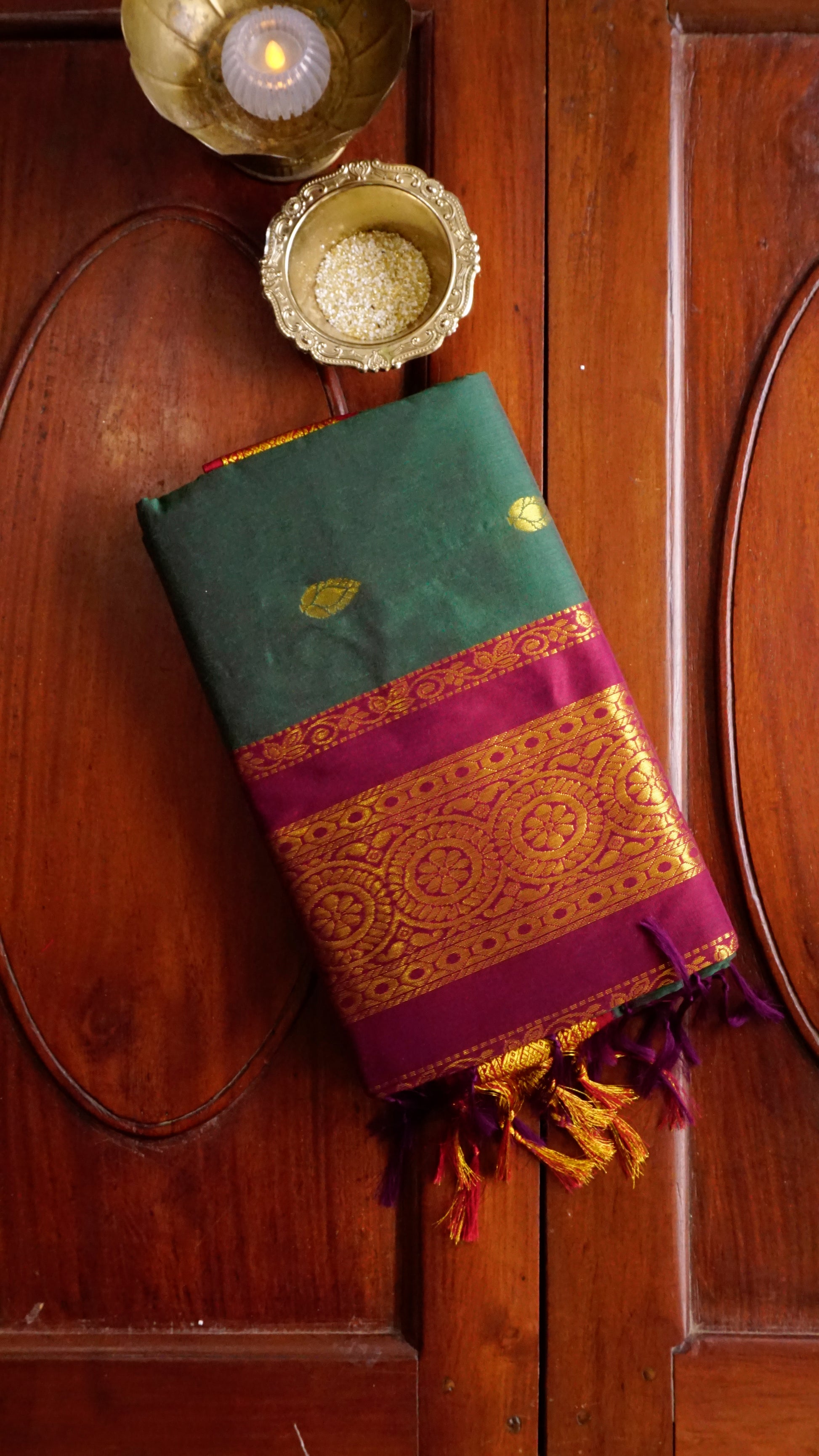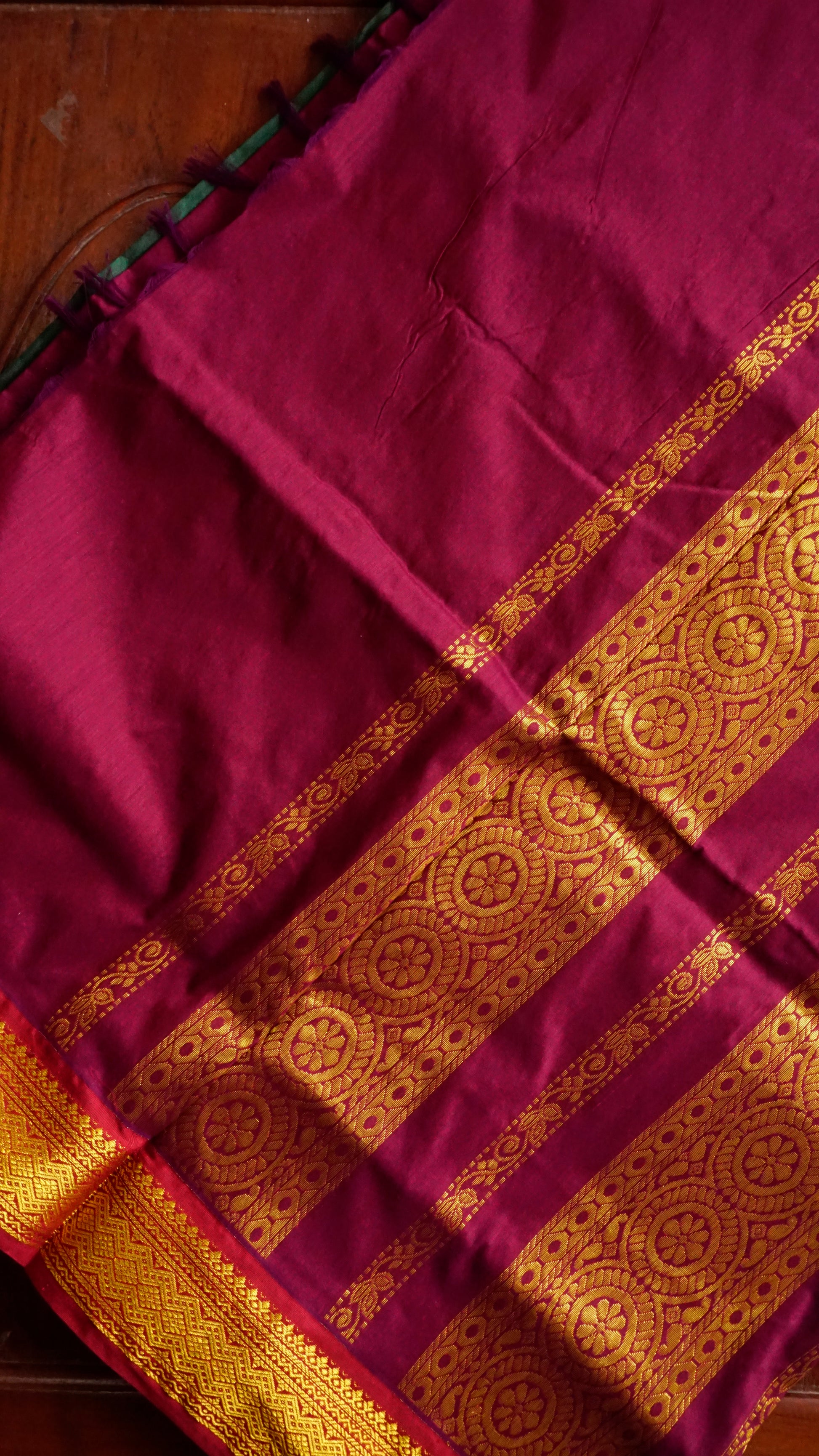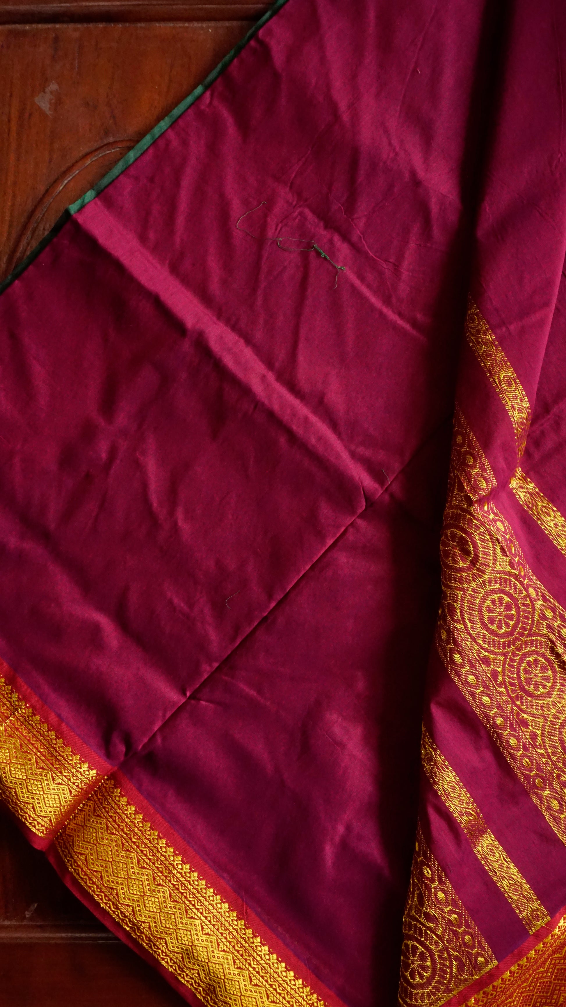 Border & Pallu: Contrasting rich maroon with intricate golden zari work that adds a regal touch.