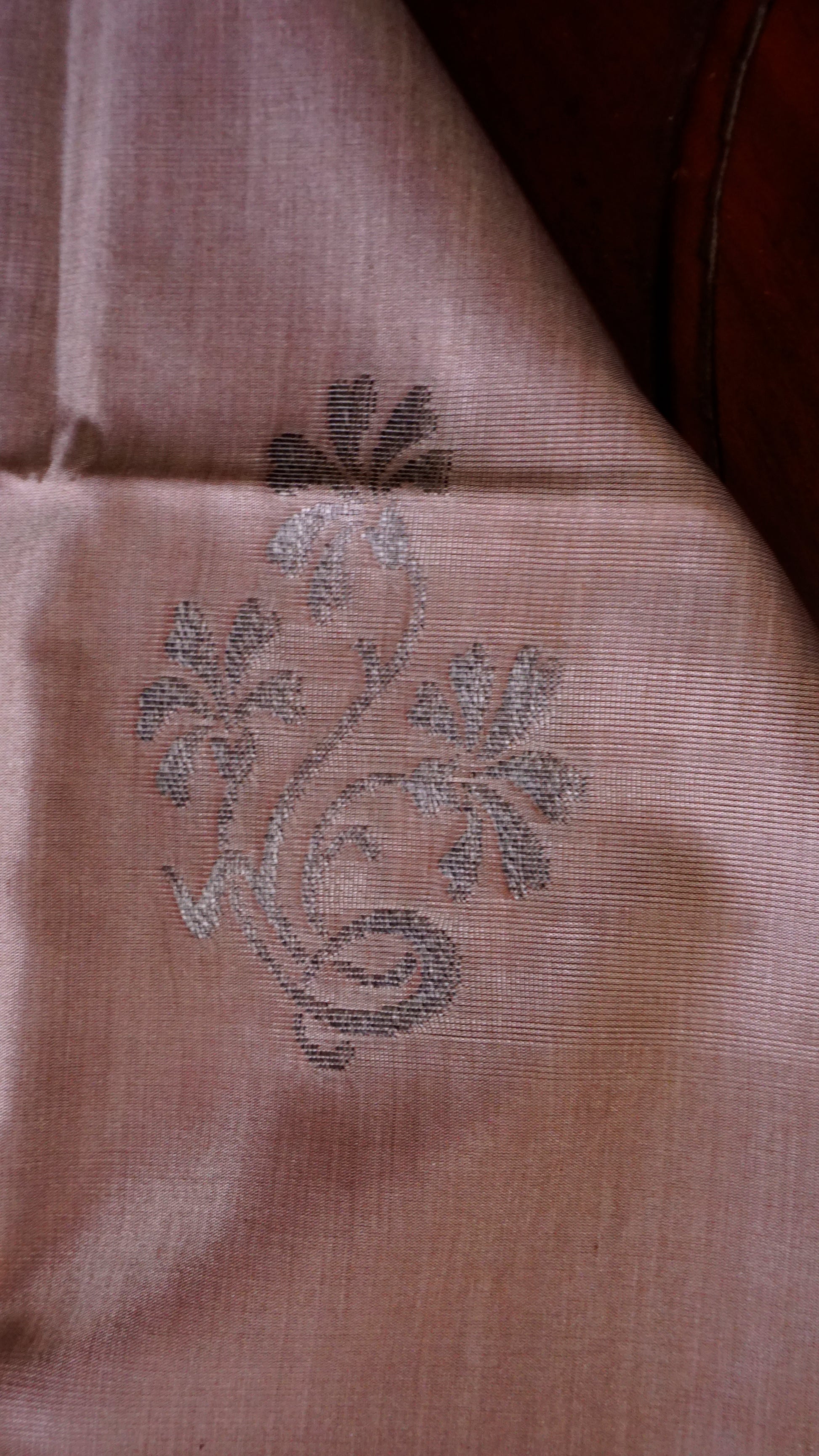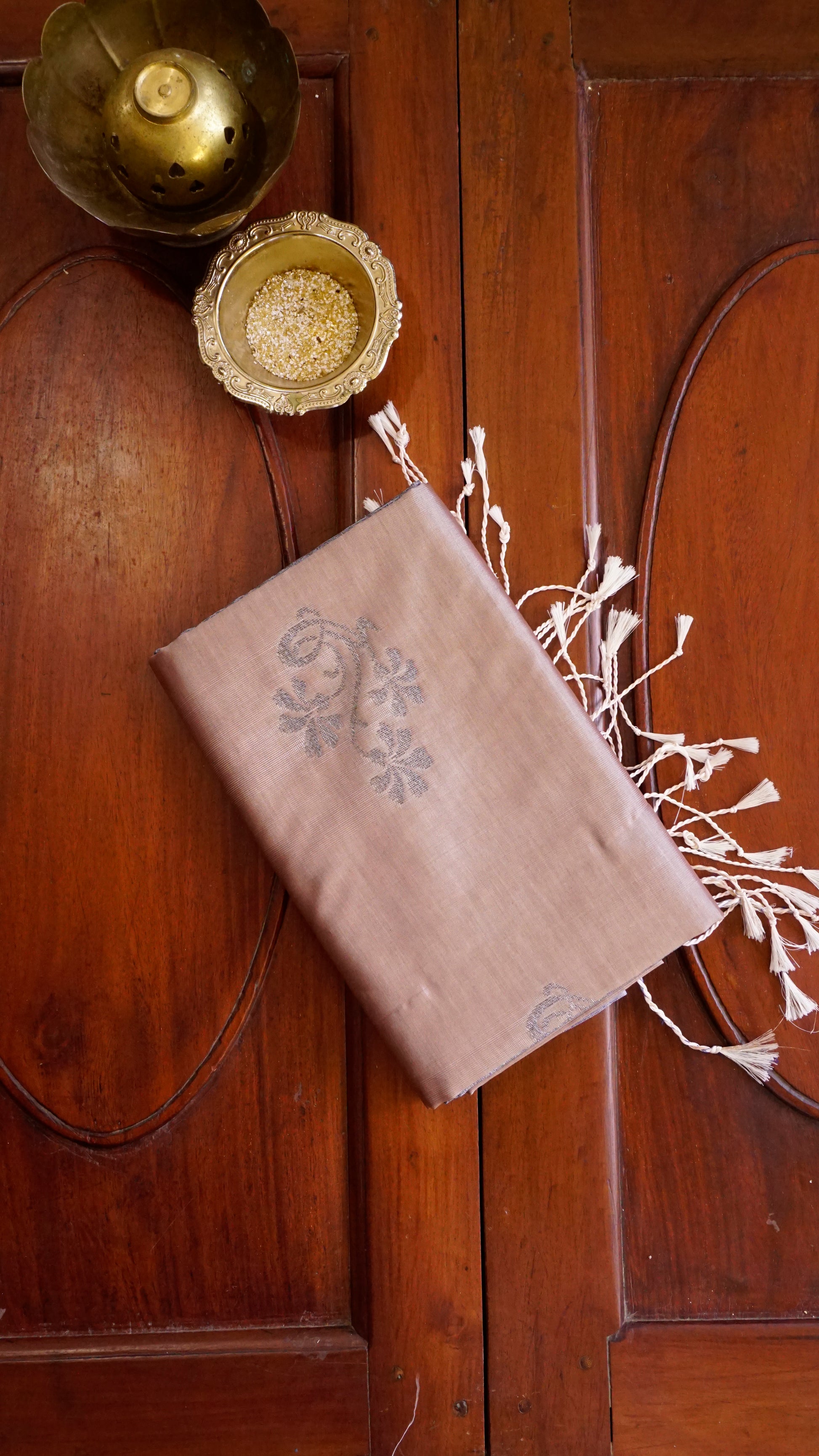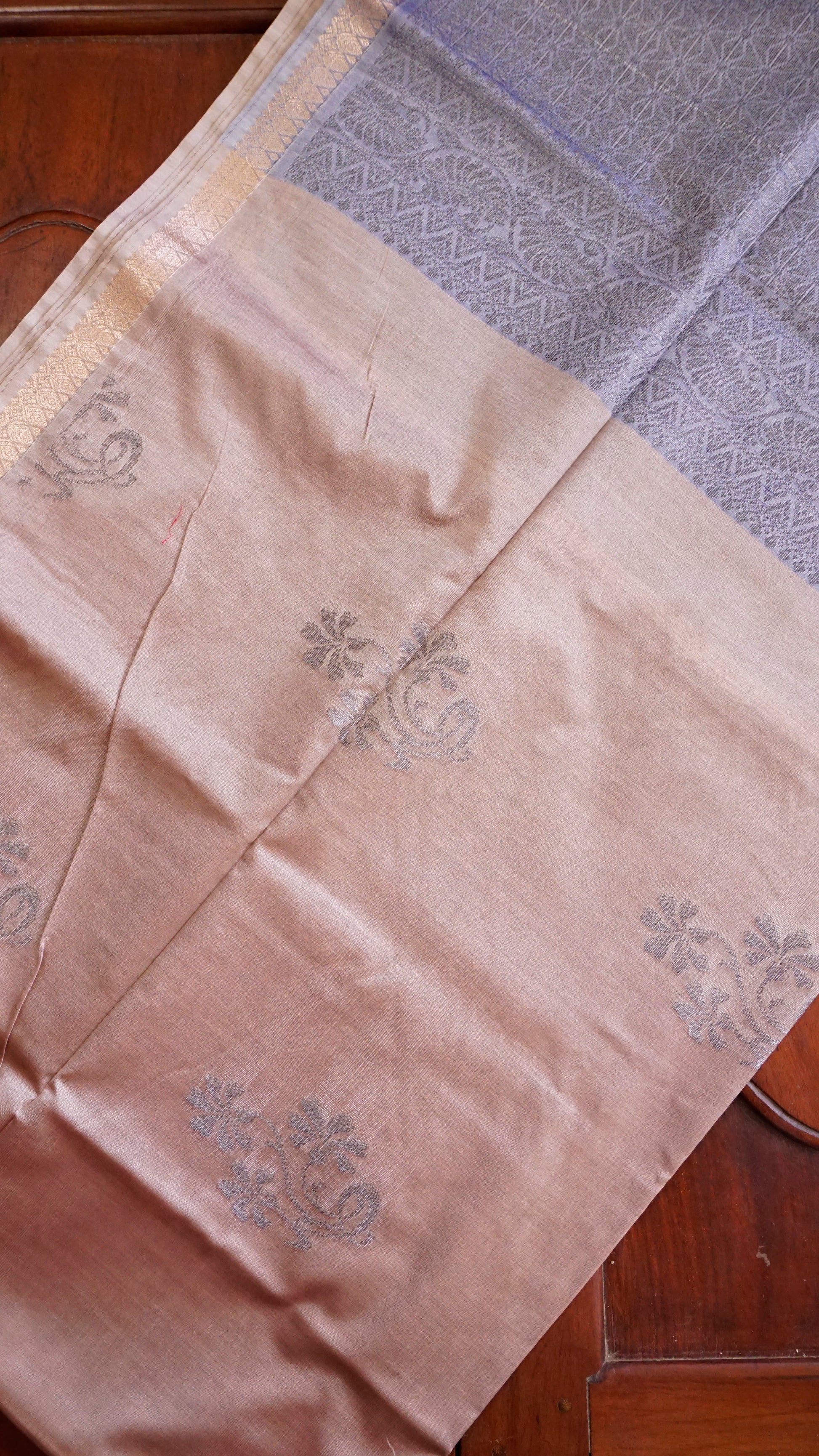 This saree is subtle yet eye-catching, with a graceful grey pallu and silver zari border woven around a soft beige body adorned with exquisite silver floral buttas. For ladies who enjoy simple yet festive fashions, the contrast is sophisticated and subtle.