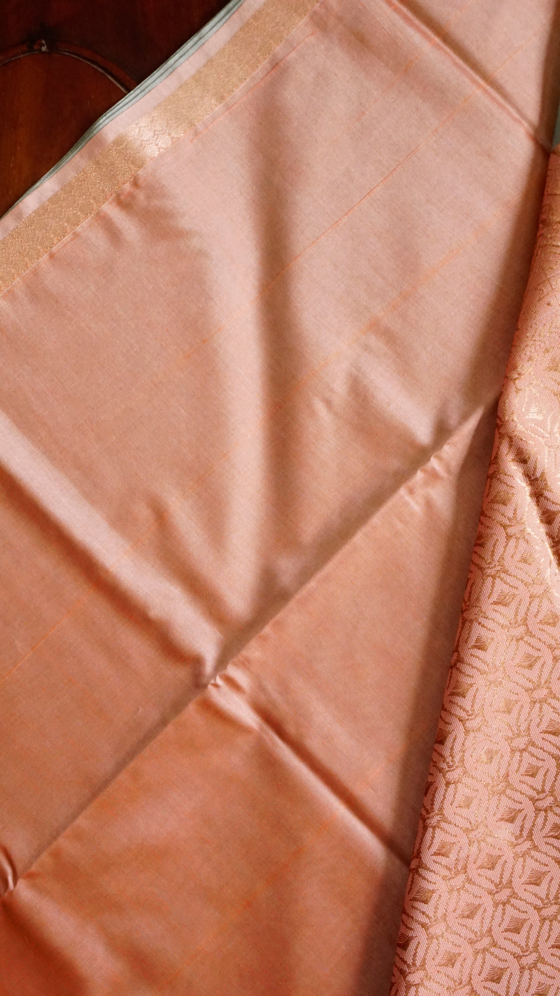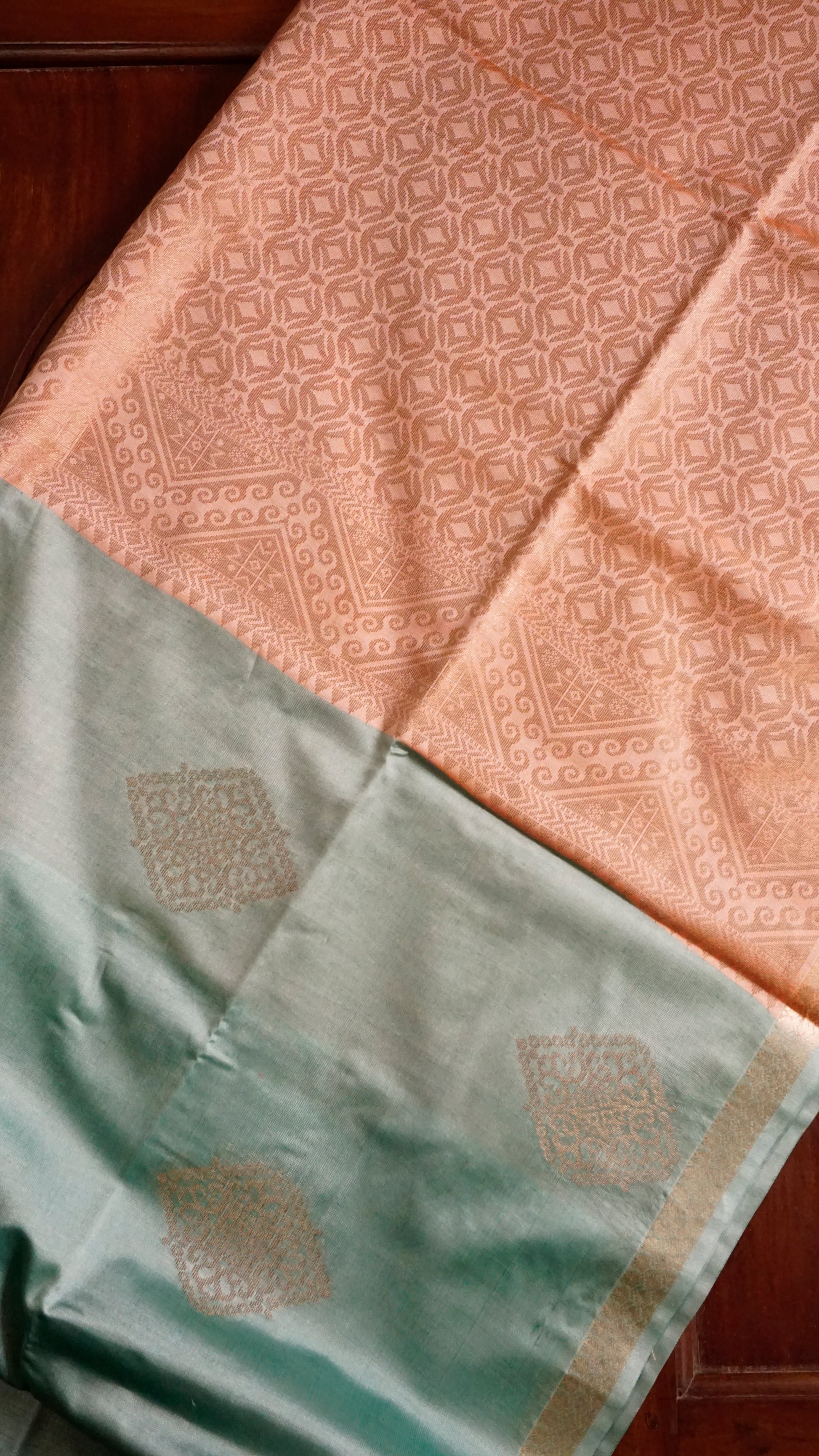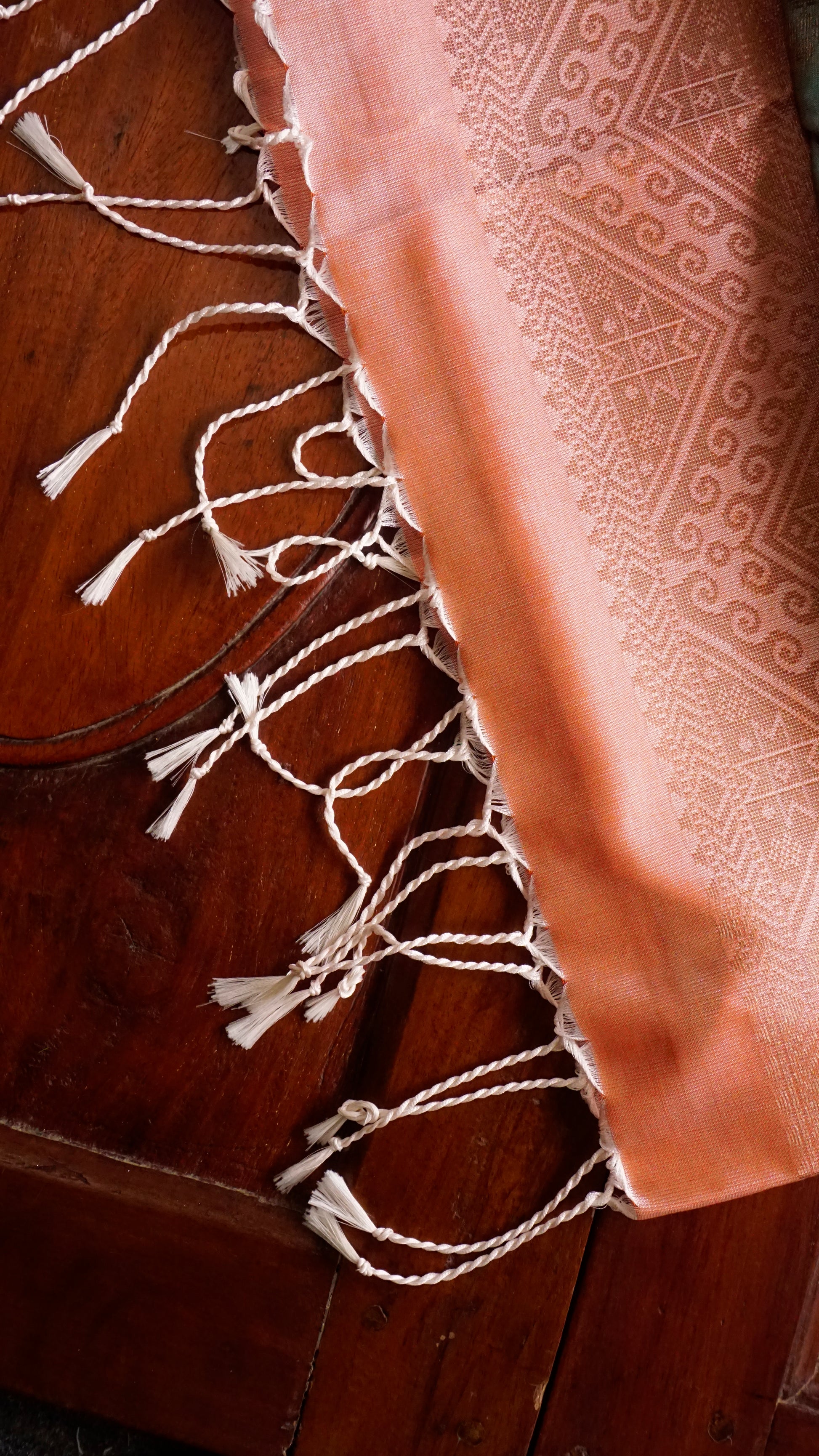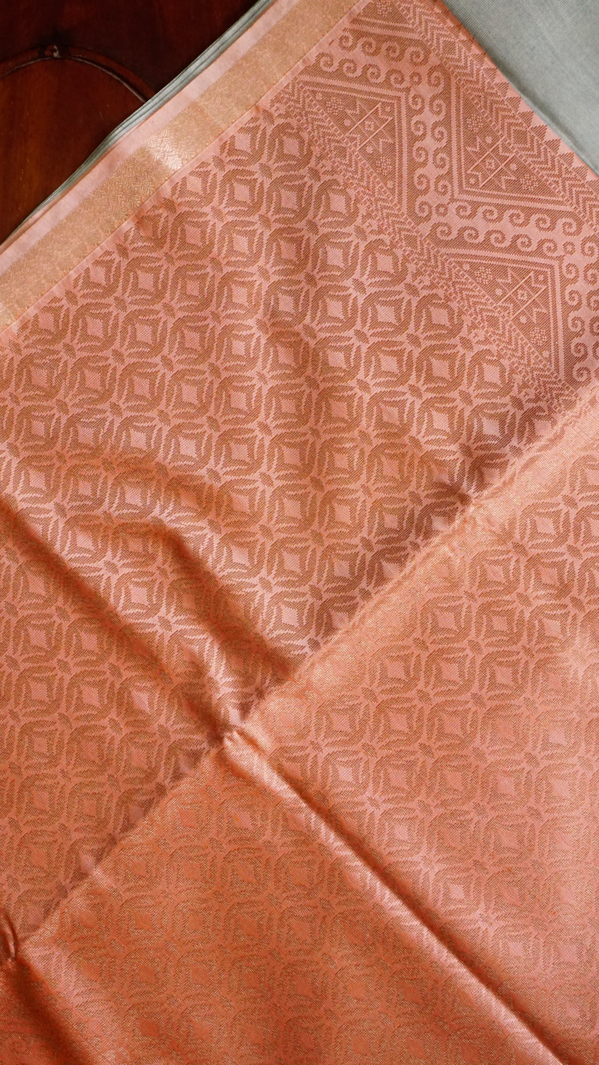 Border & Pallu: Contrasting peach shade featuring delicate self-woven geometric and floral jacquard patterns.