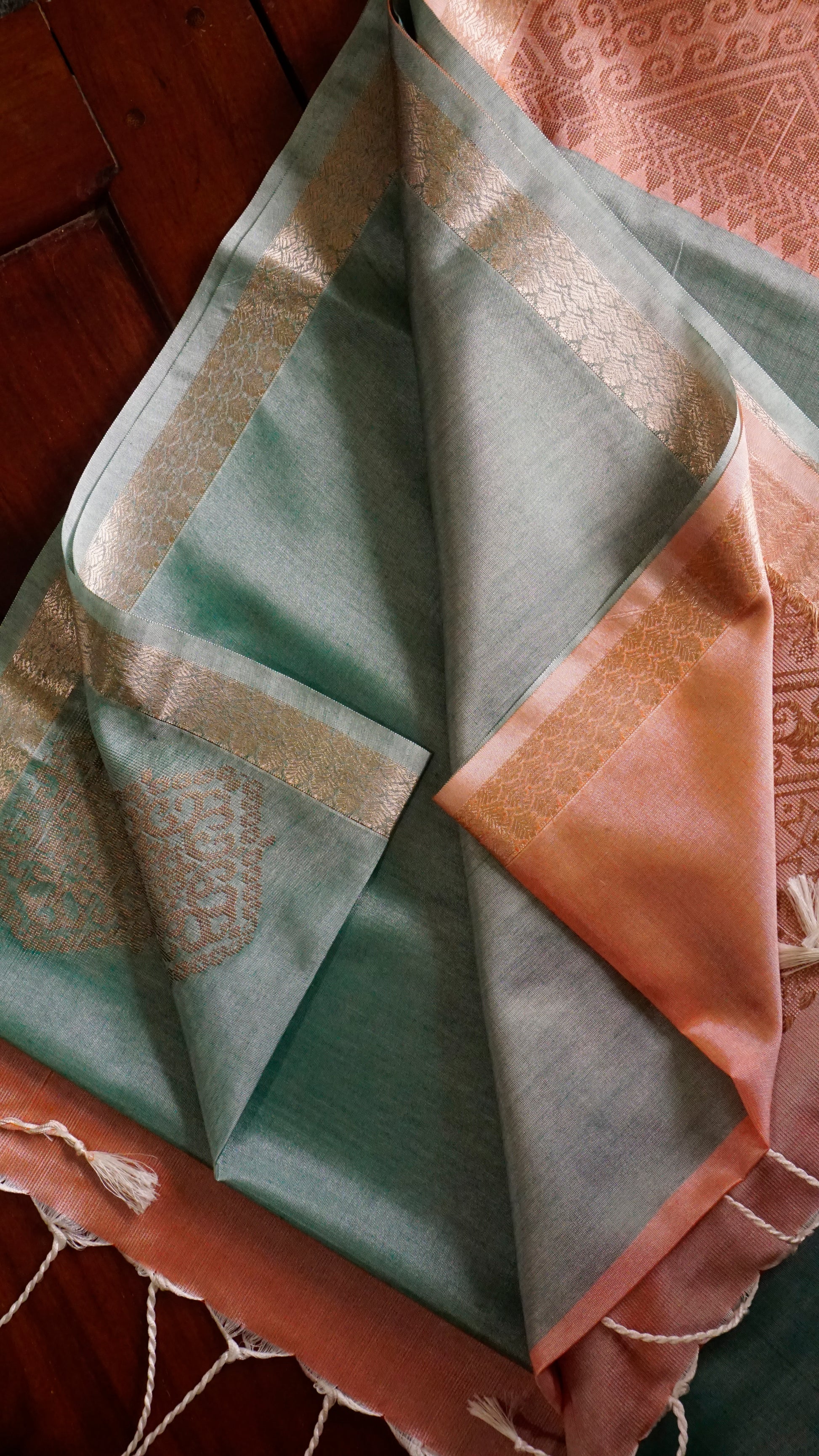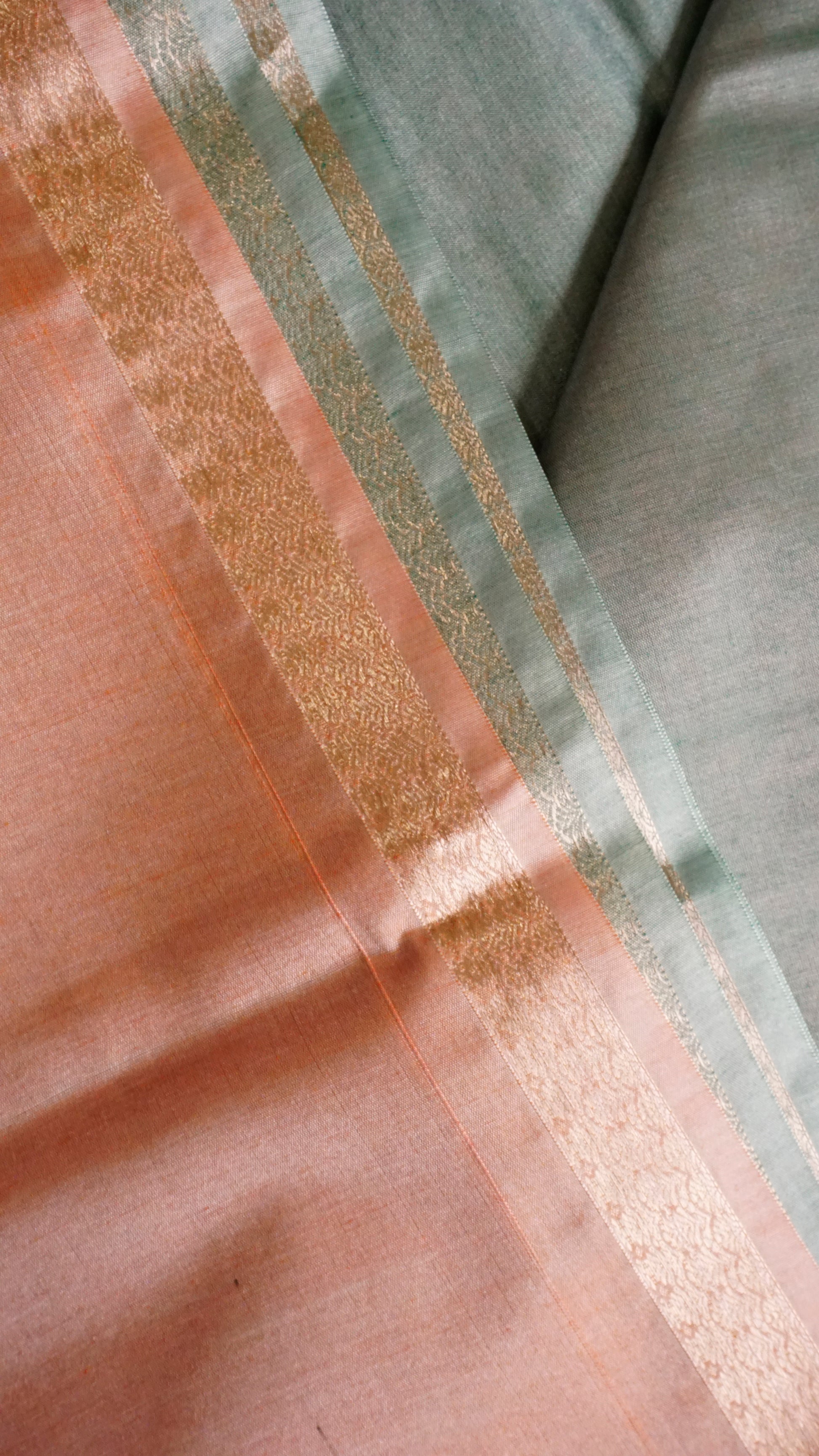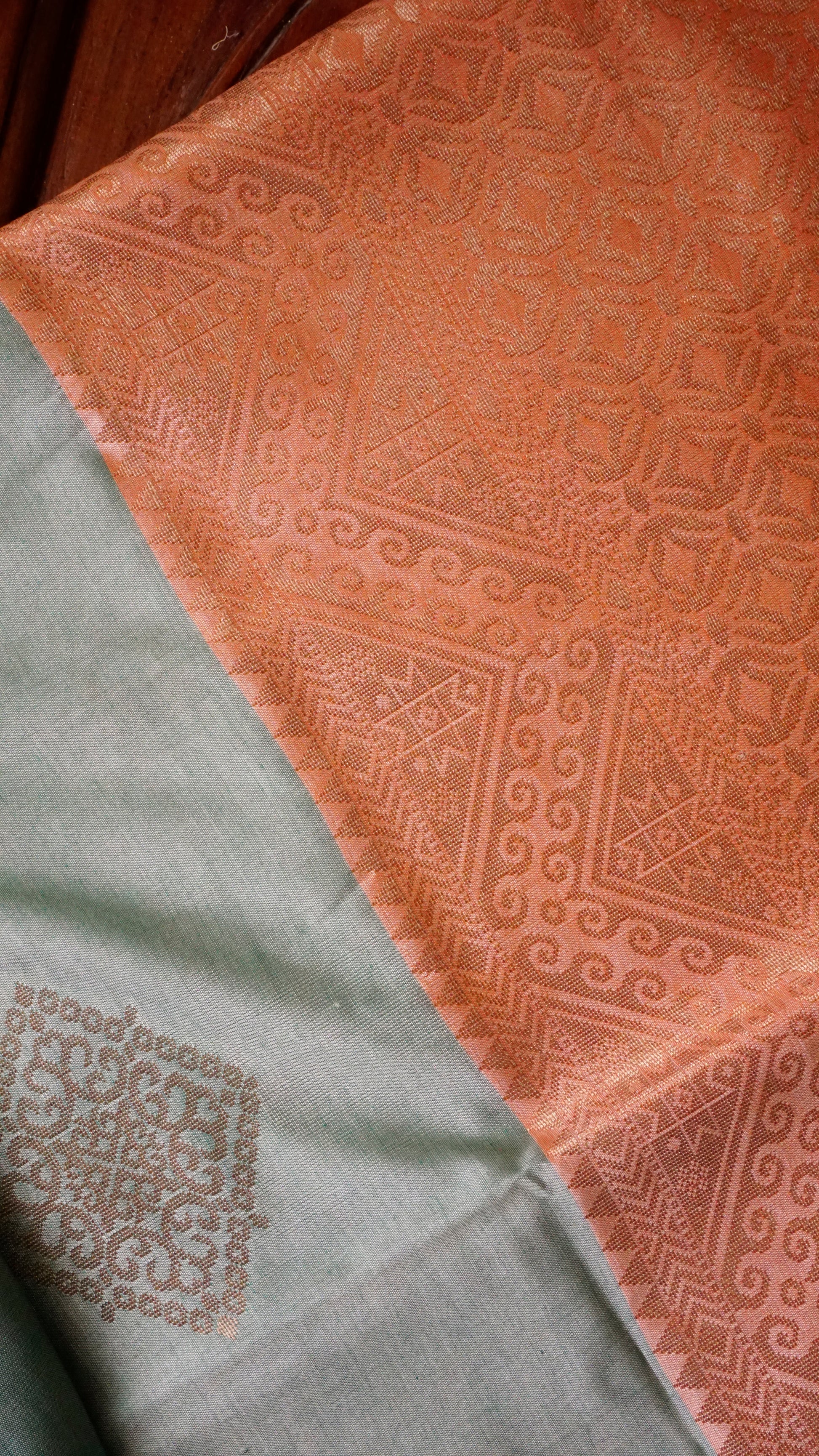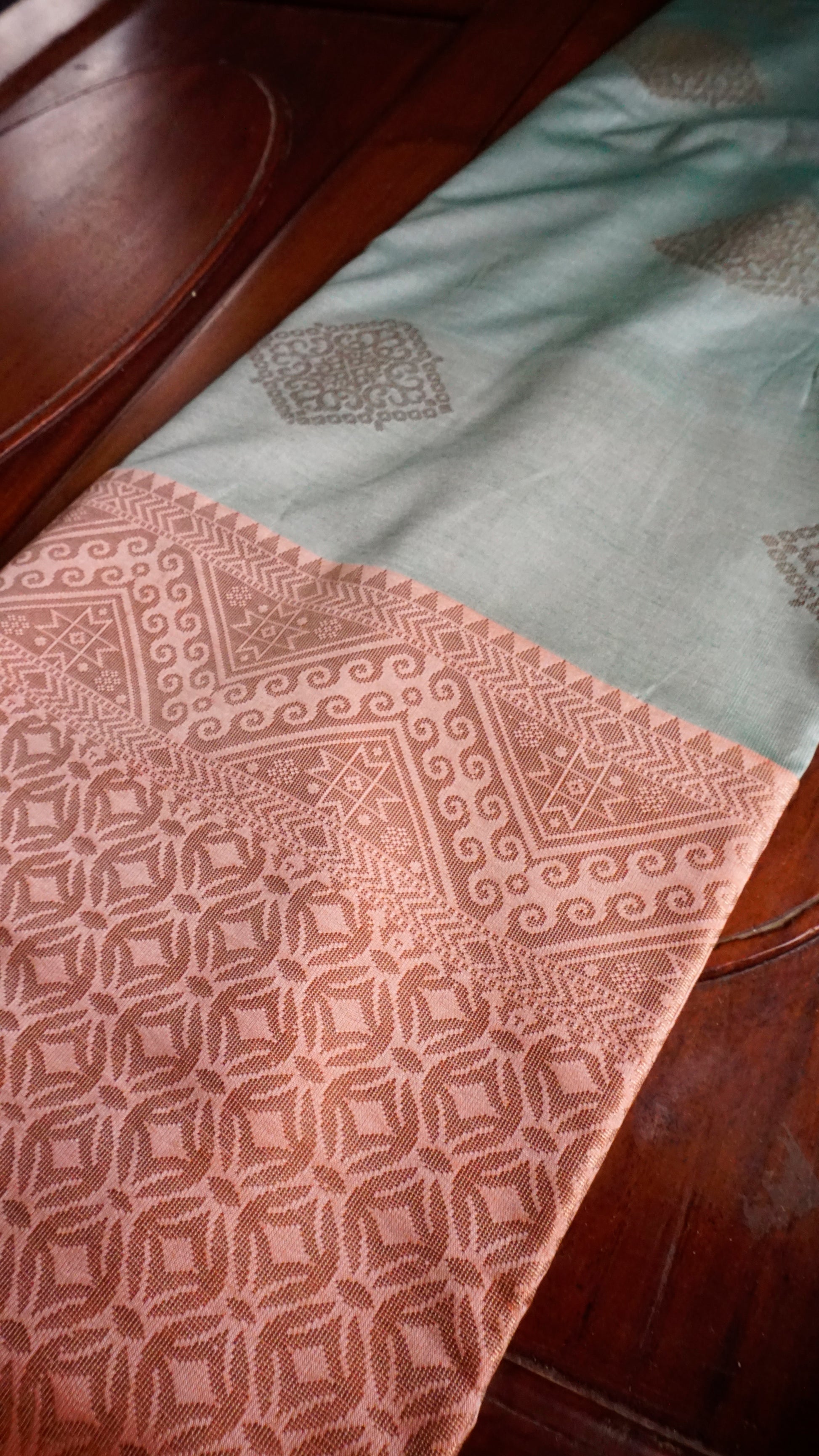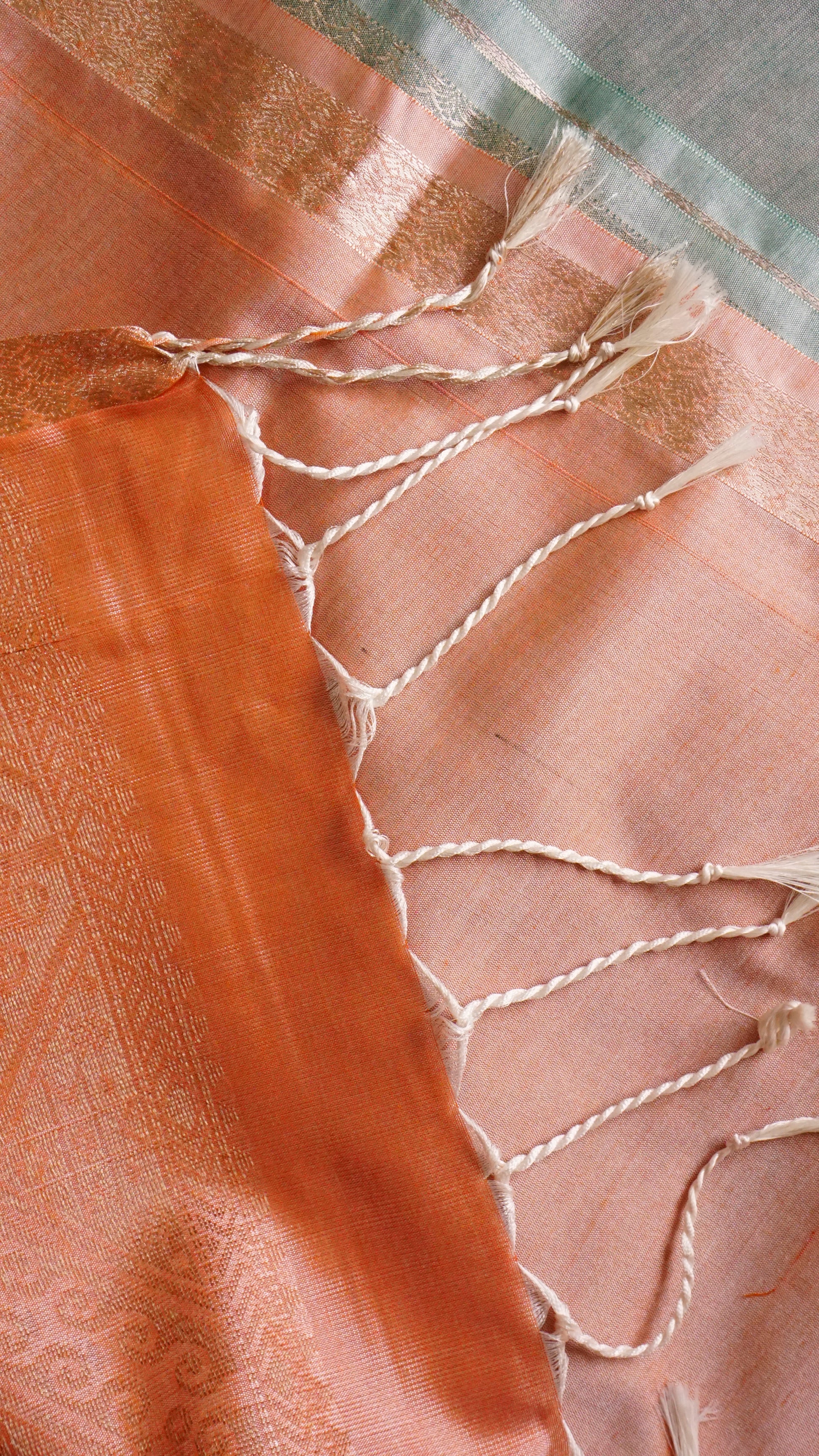 Border & Pallu: Contrasting peach shade featuring delicate self-woven geometric and floral jacquard patterns.