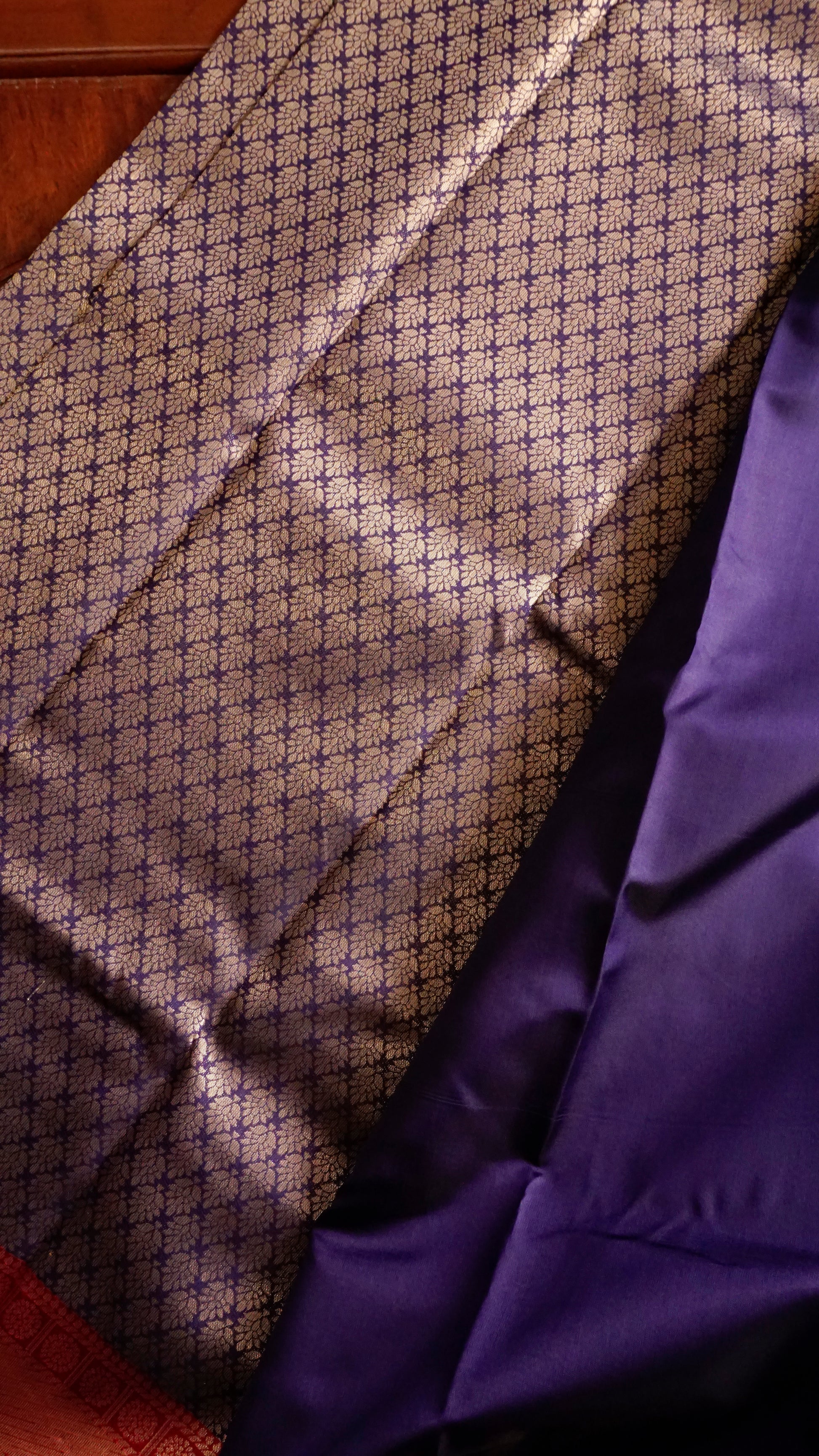 Step into timeless elegance with this royal blue semi-silk saree, adorned with delicate golden floral motifs that shimmer with every fold. The highlight is its luxurious crimson red pallu and border, woven with intricate zari work that adds depth, richness, and festive charm. A perfect blend of traditional craftsmanship and modern grace, this saree is designed to make you the centre of attention at weddings, festivals, and grand celebrations.