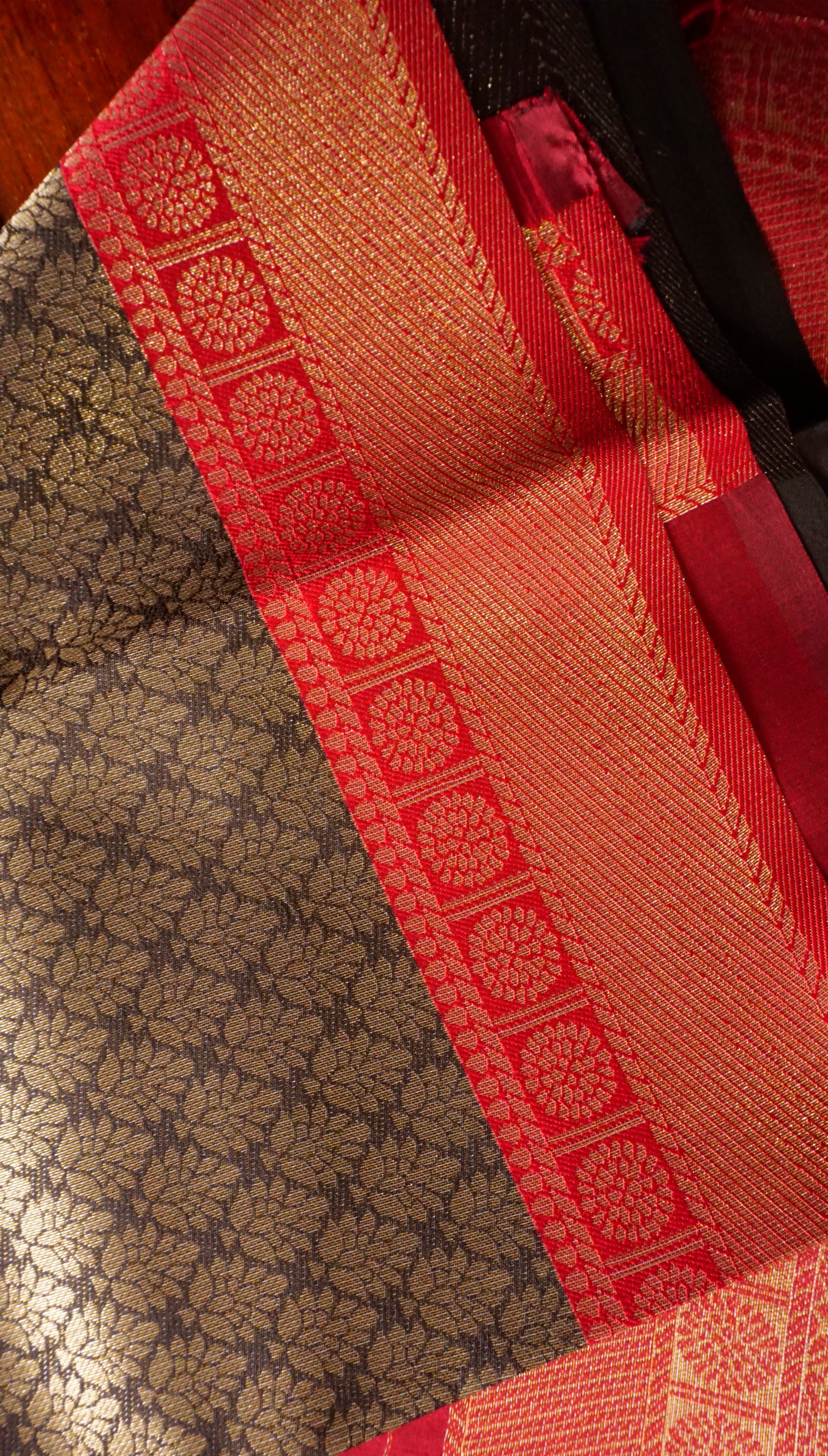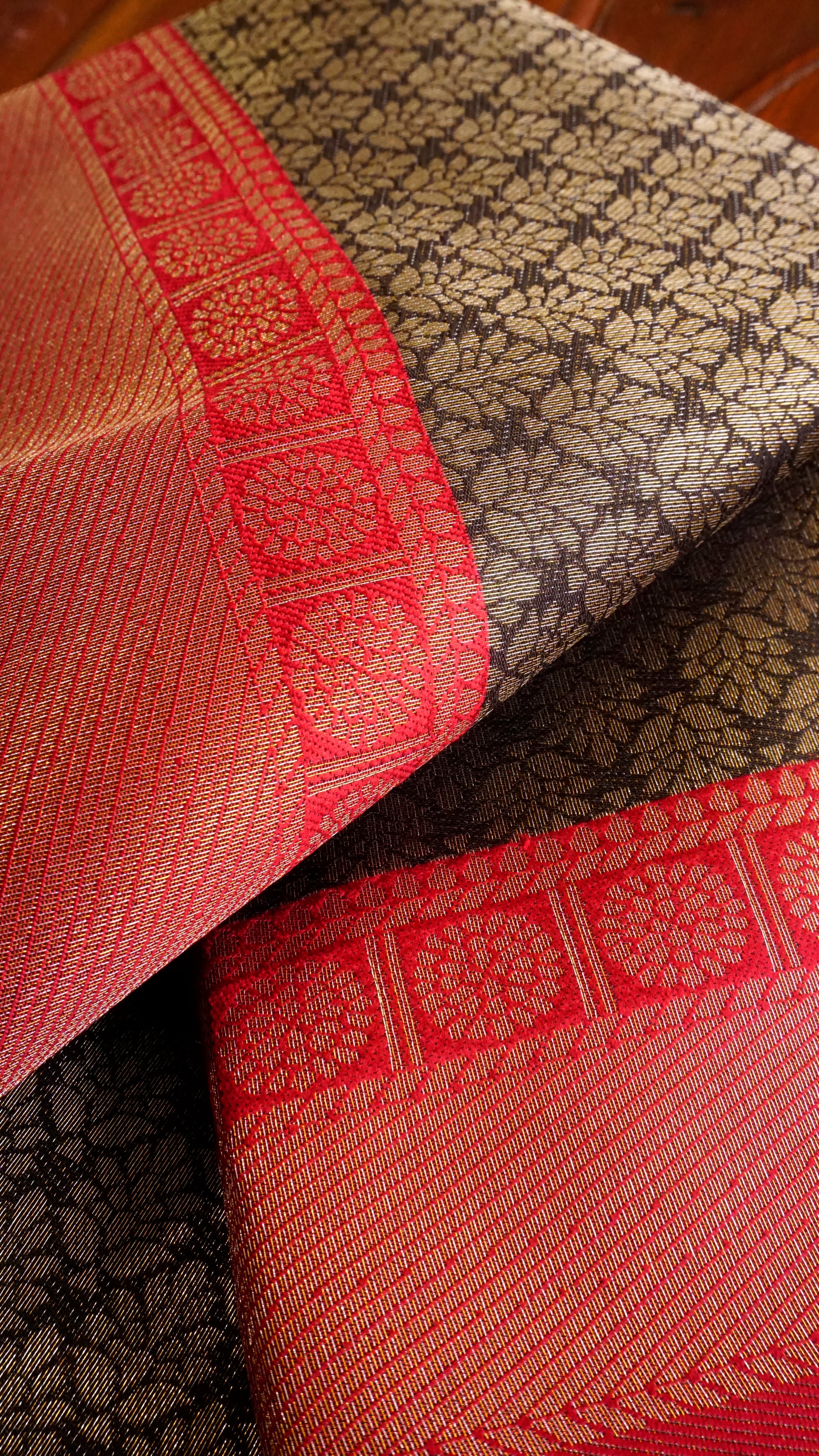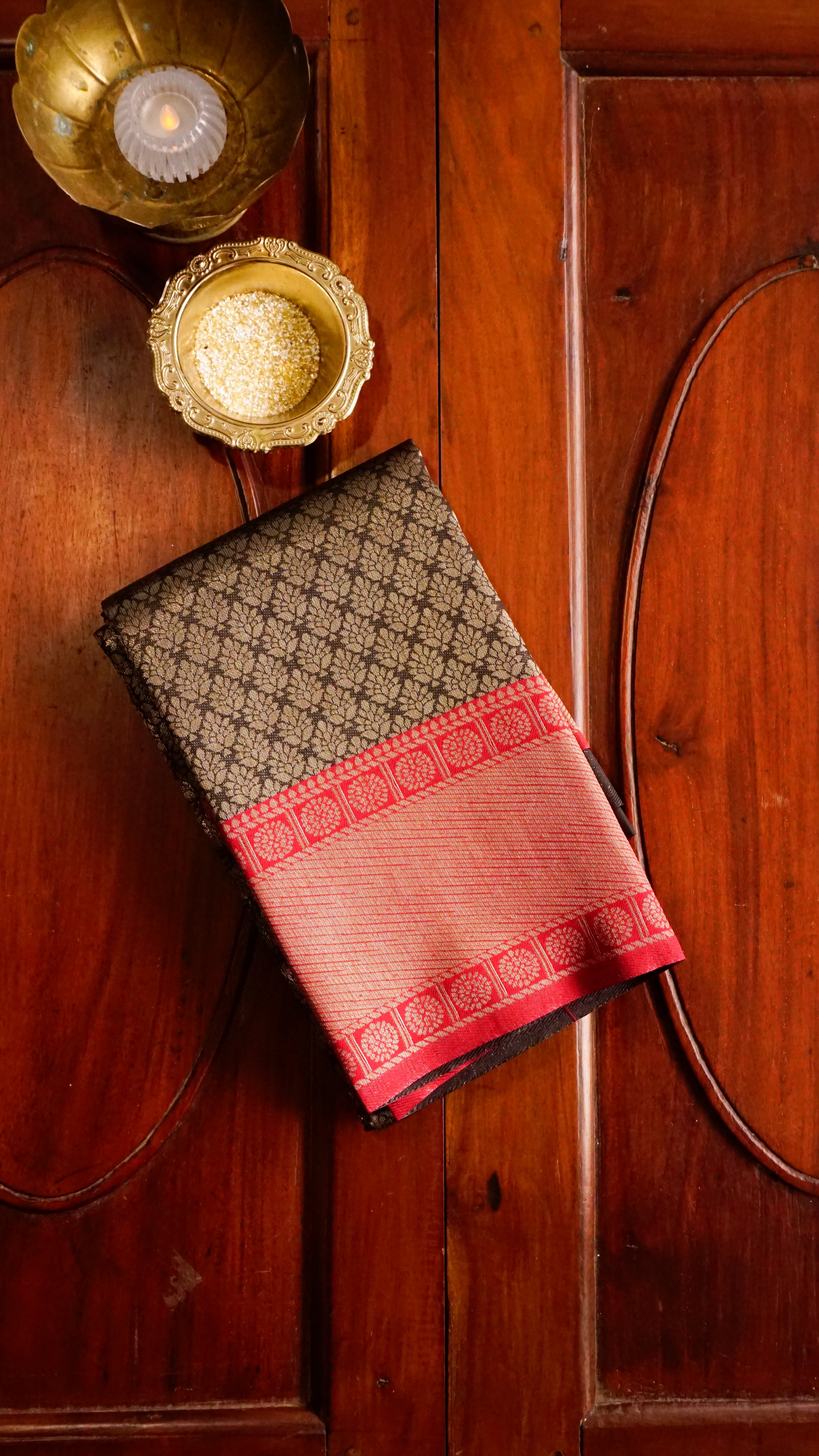 Step into timeless elegance with this stunning semi-silk saree. The rich black body adorned with golden floral motifs creates a regal look, while the vibrant red border and pallu with intricate zari detailing add festive grandeur.