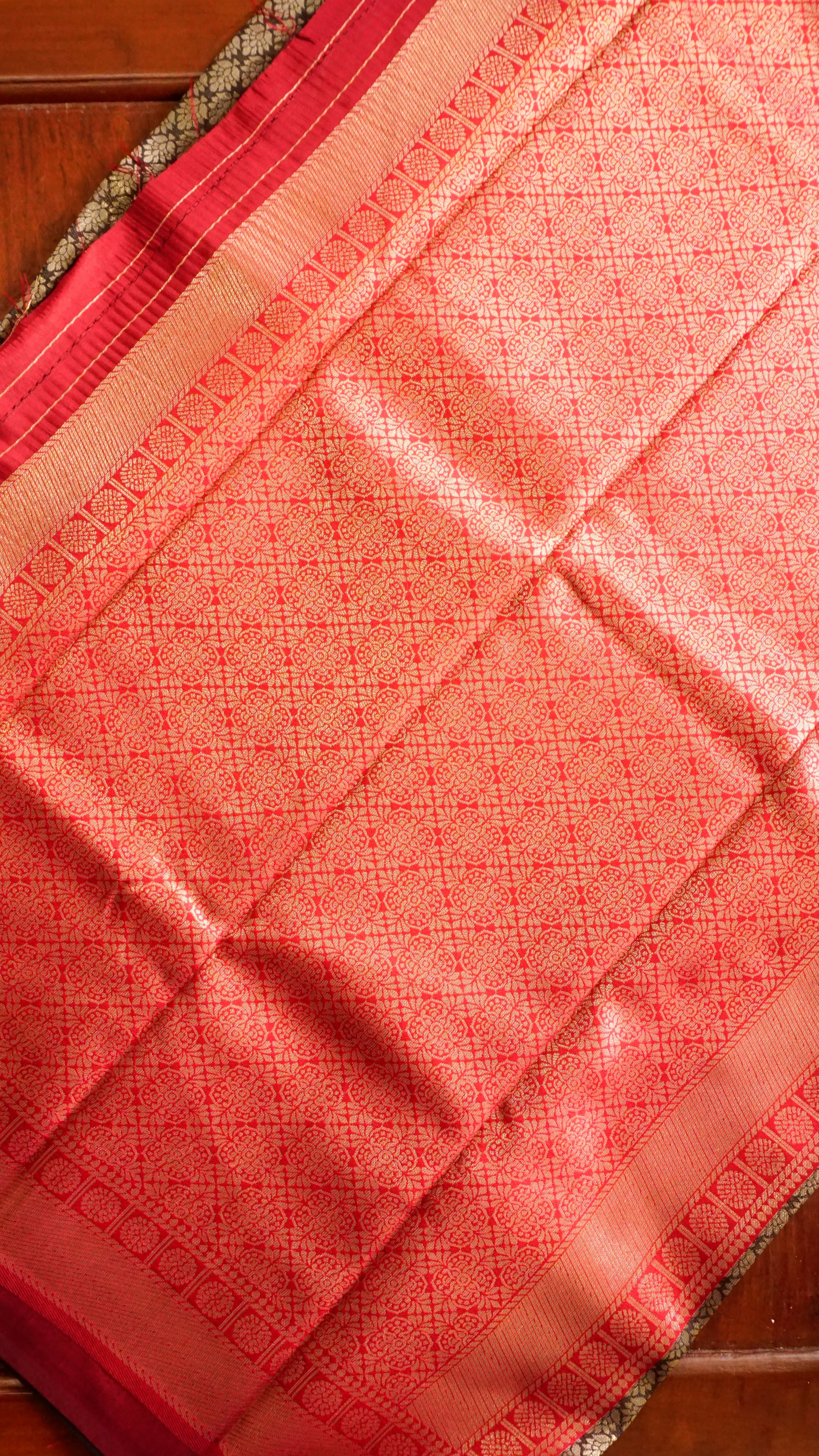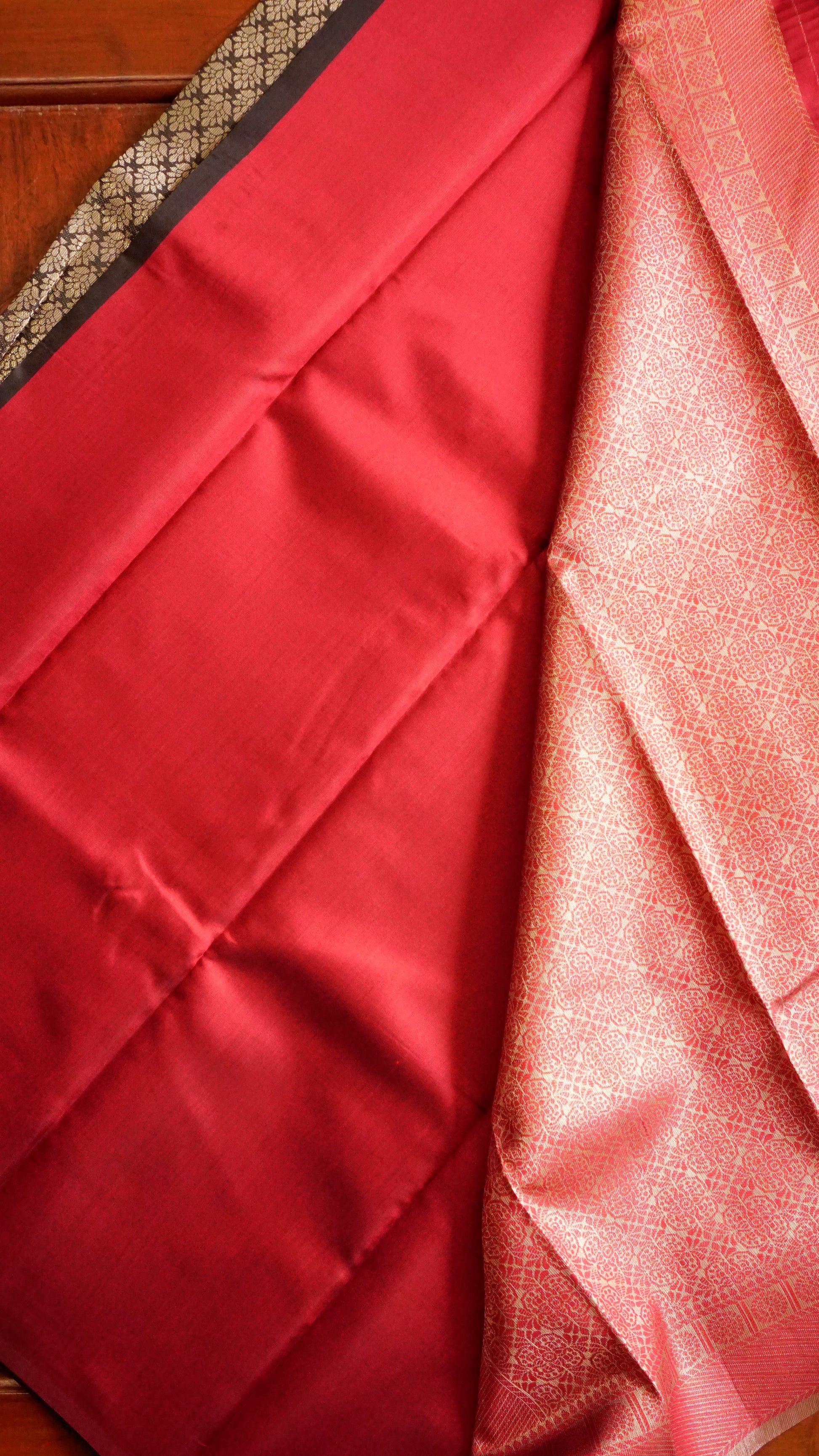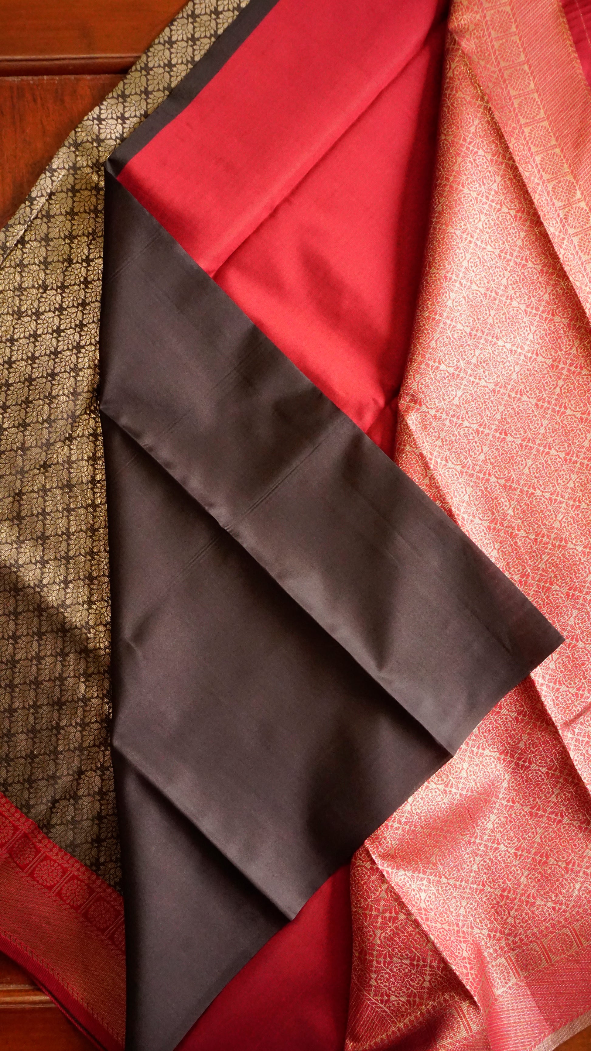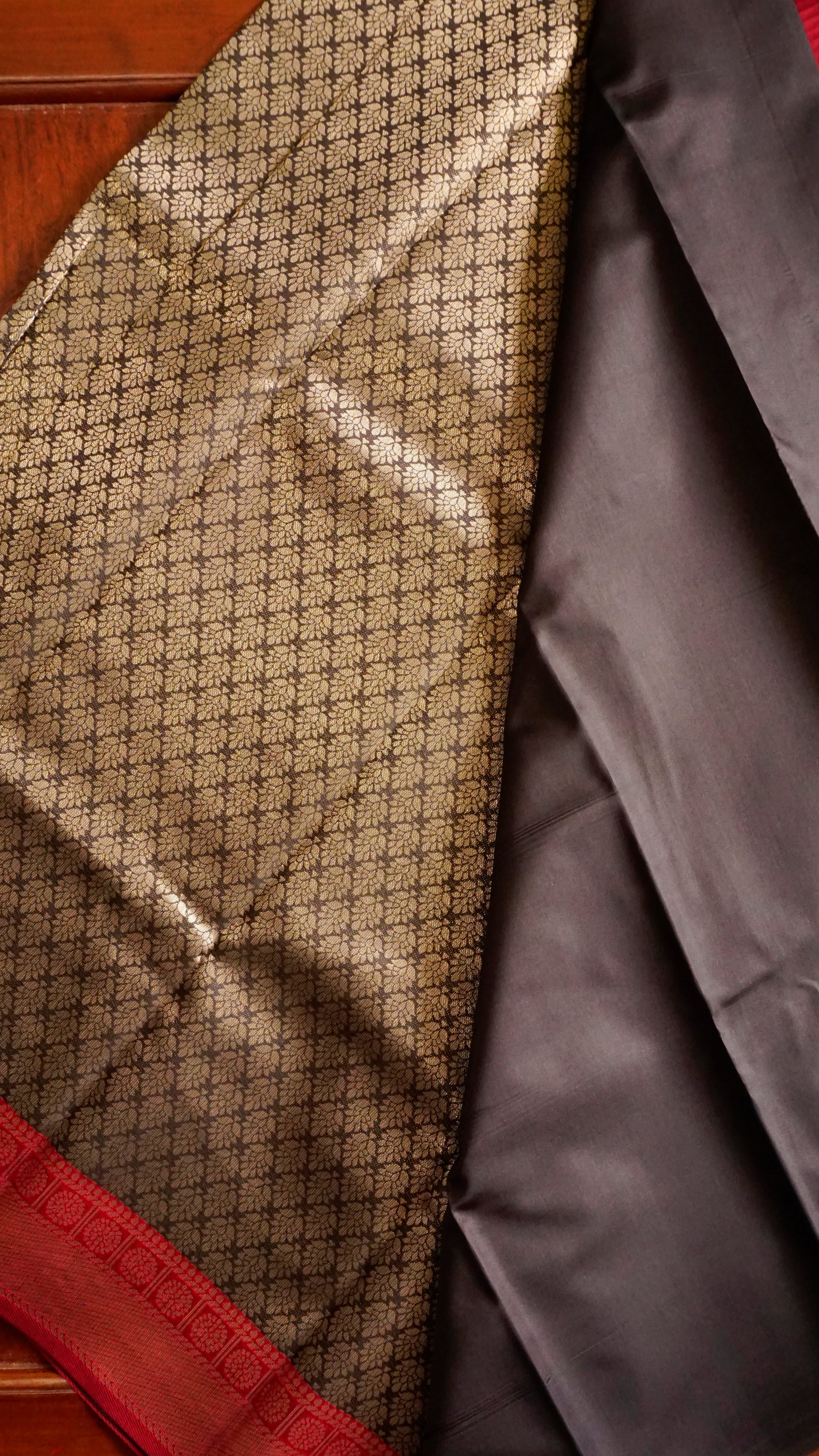 Step into timeless elegance with this stunning semi-silk saree. The rich black body adorned with golden floral motifs creates a regal look, while the vibrant red border and pallu with intricate zari detailing add festive grandeur.