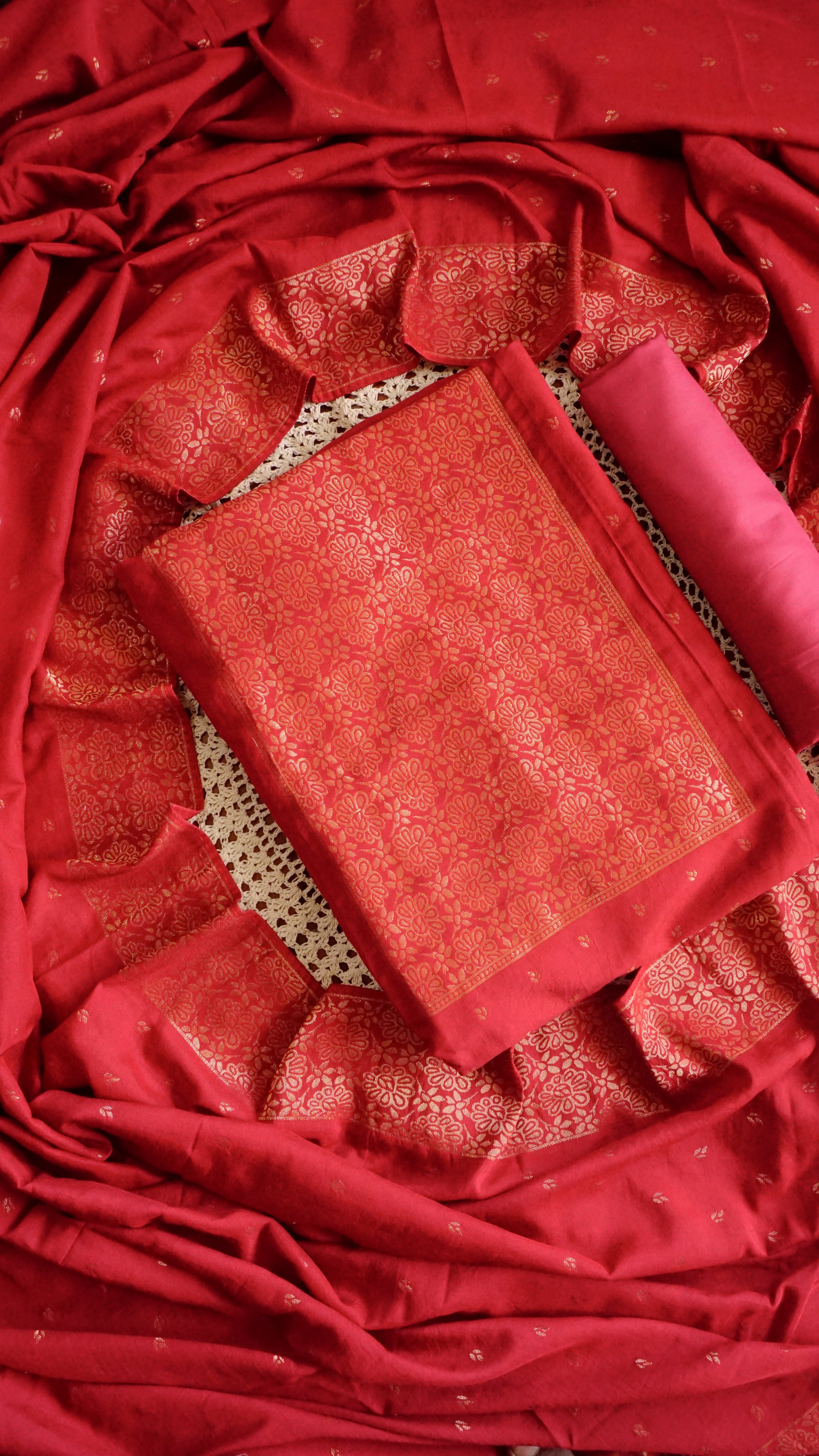 Red Semi-Banarasi Unstitched Salwar Set with Golden Zari Work