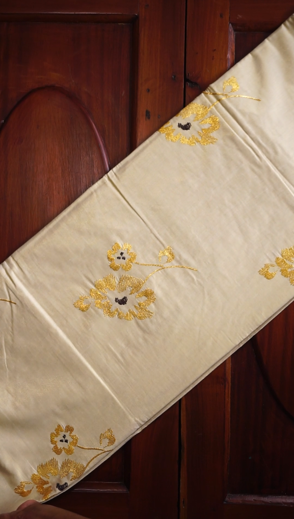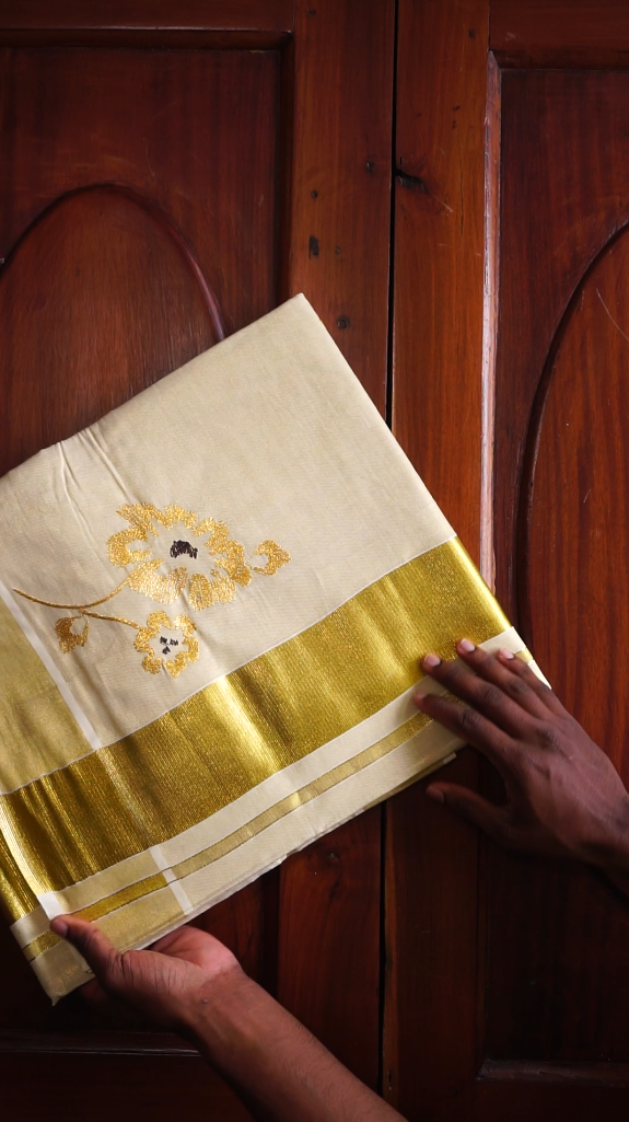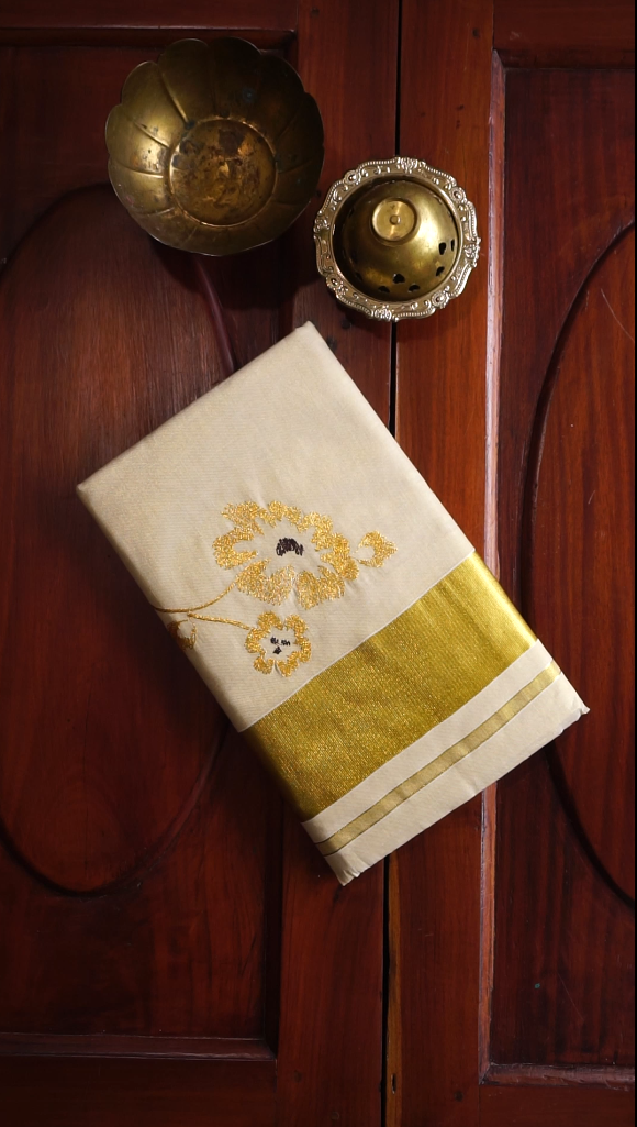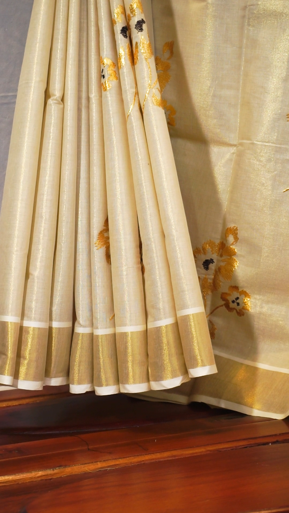 🌼 Kerala Kasavu Saree with Floral Embroidery 🌼