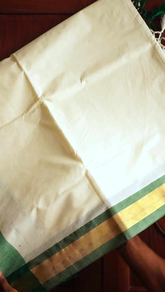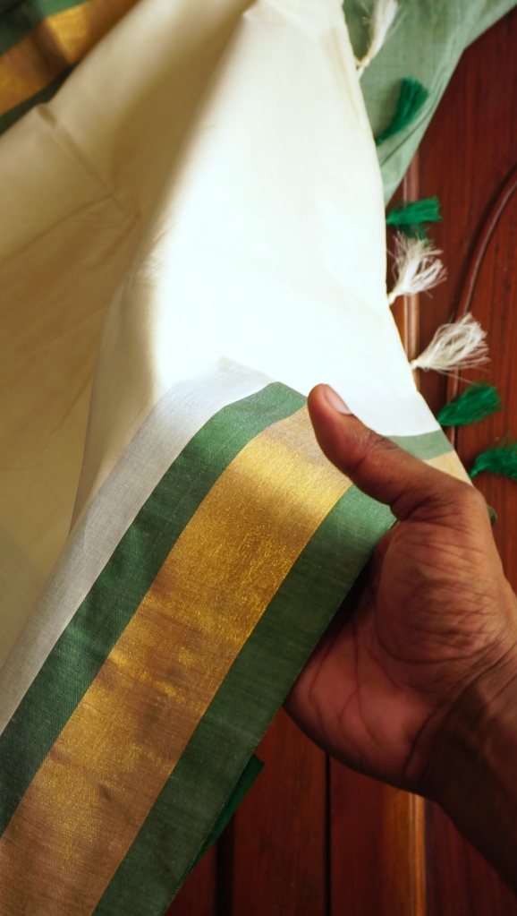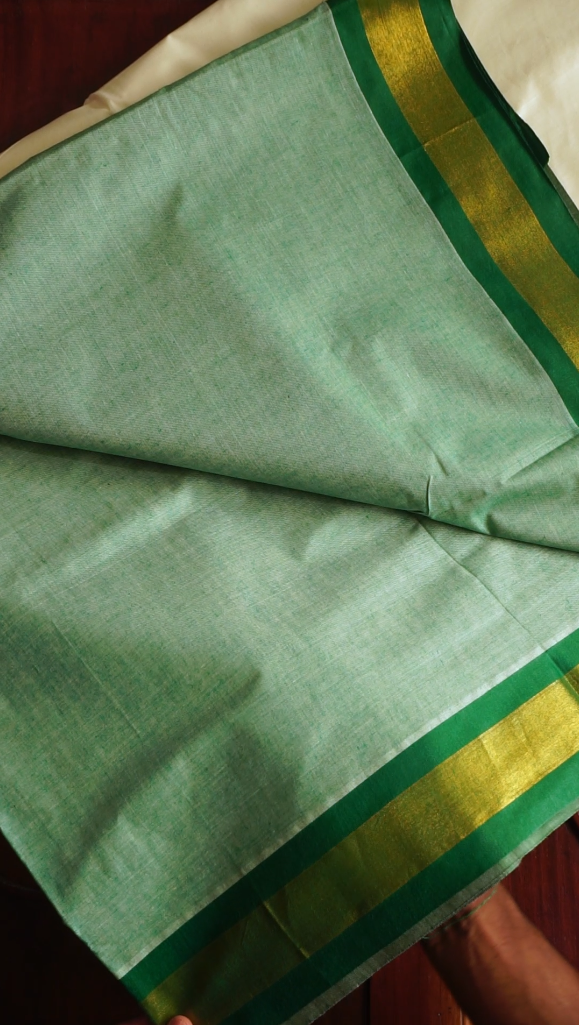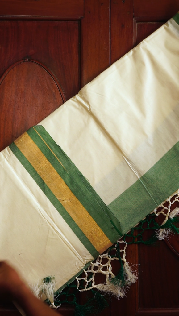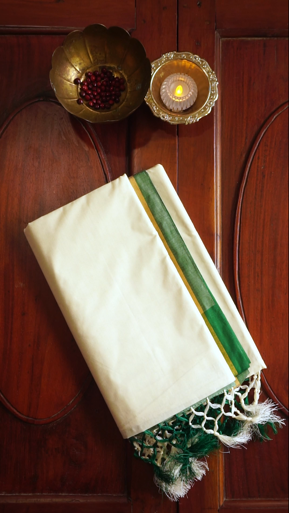 Kerala Kasavu Saree with Green Pallu & Golden Border