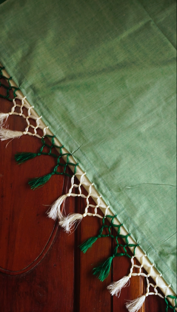 Embrace the grace of Kerala tradition with this stunning Kasavu saree, featuring a classic off-white body paired with a vibrant green pallu. The golden zari border adds a festive charm, while the pallu is adorned with elegant green and white tassels for a touch of sophistication. Crafted from soft, breathable cotton, this saree is perfect for Onam celebrations, weddings, and cultural occasions, offering both comfort and timeless elegance.