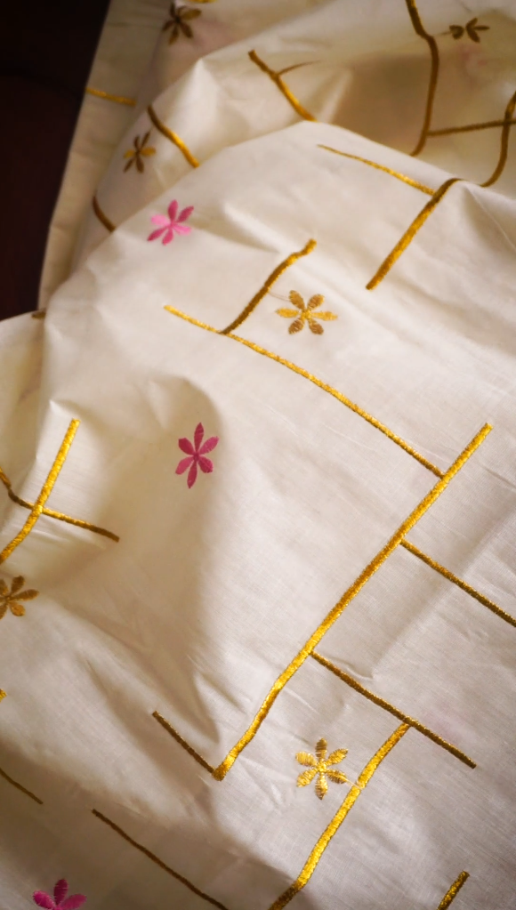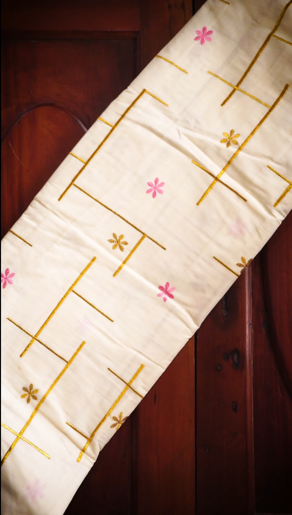 ~ Colour Variants: Off-white base with contrast borders in Navy Blue, Deep Pink & Jet Black ~ Pallu: Golden zari with contrast colour detailing ~ Border : Golden kasavu with contrast colour stripe ~ Blouse: Attached blouse with matching border (unstitched)