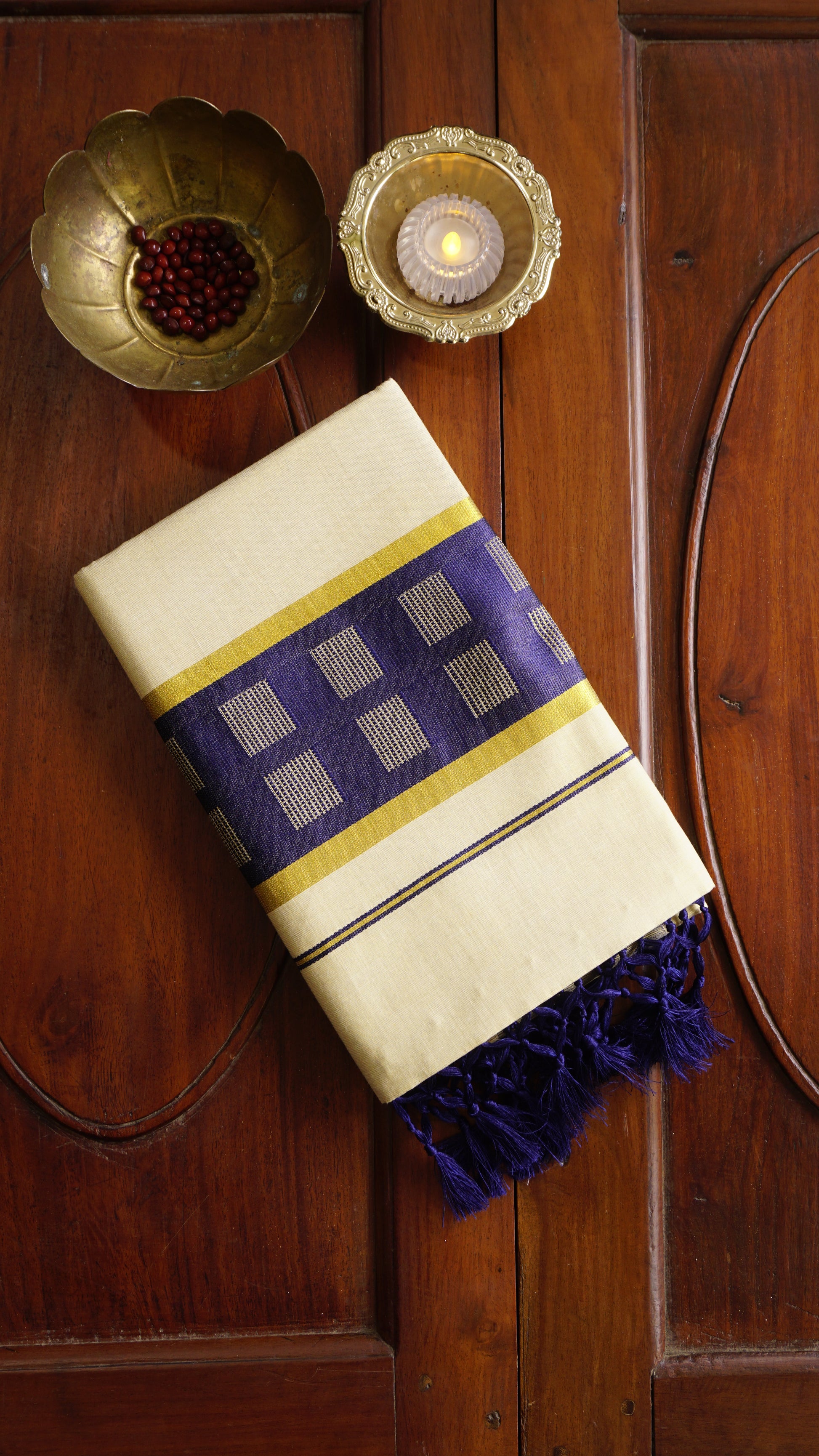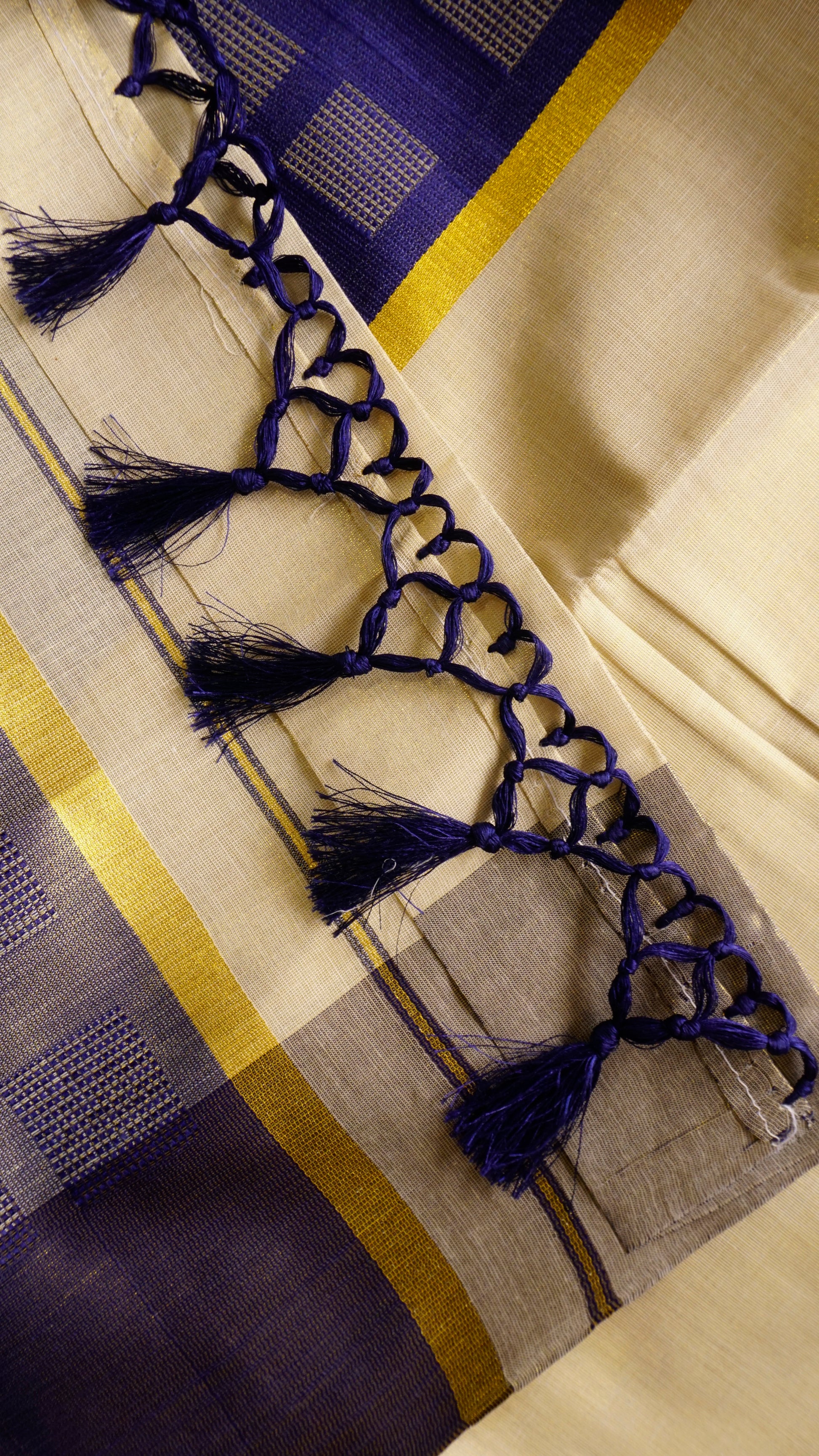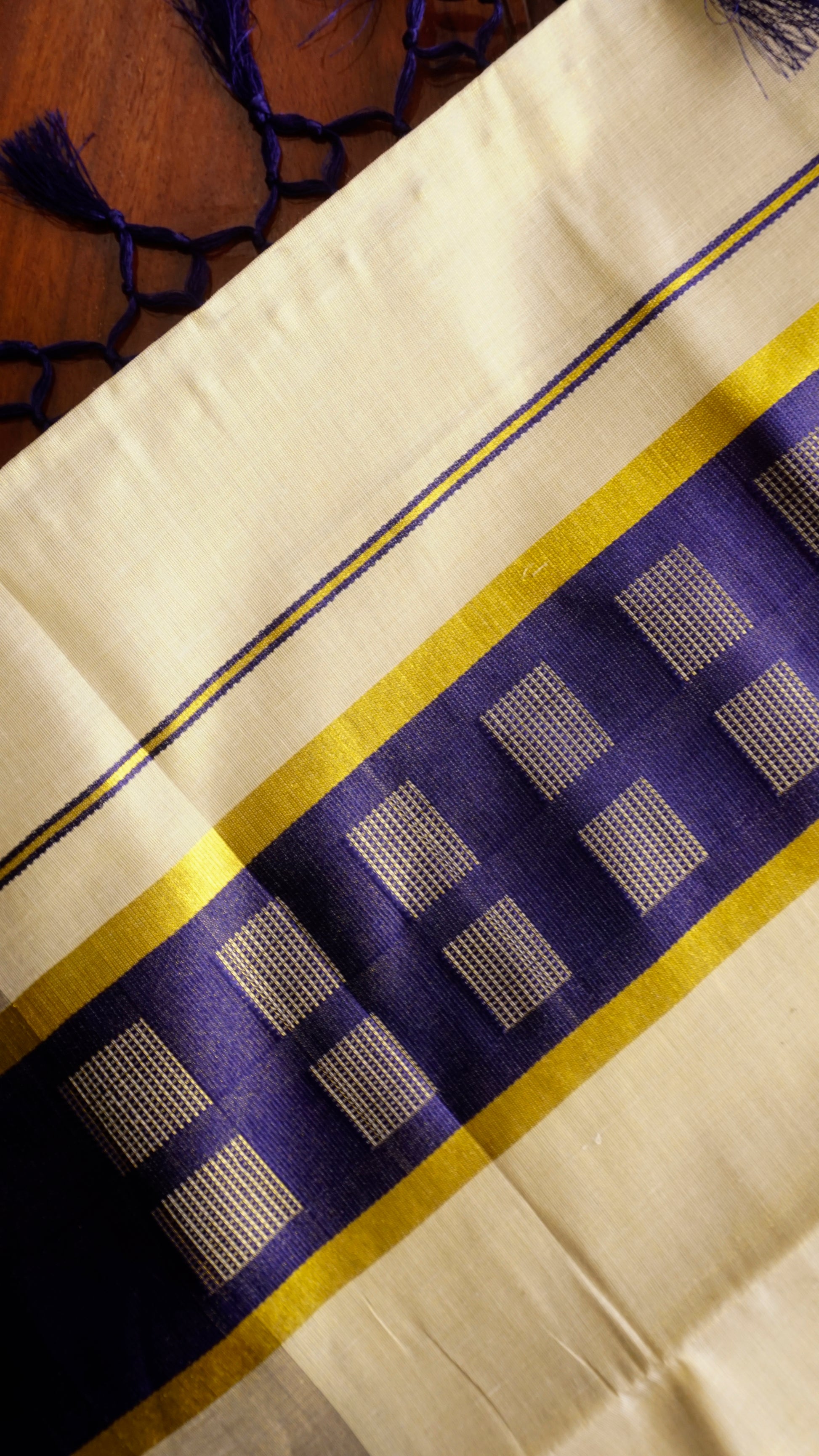 Bring a regal touch to your festive attire with this exquisite Kerala Kasavu saree, featuring the traditional cream body enhanced by a striking royal blue border with intricate checked patterns. The golden zari lining adds a hint of shimmer, while the deep blue tassels on the pallu lend a graceful finishing touch. Crafted from soft, breathable cotton, this saree offers both elegance and comfort, making it a perfect choice for Onam, temple visits, and cultural gatherings.