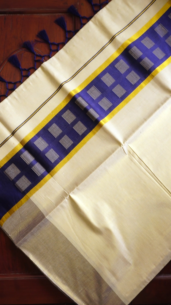 Kerala Kasavu Saree with Royal Blue Checks Border