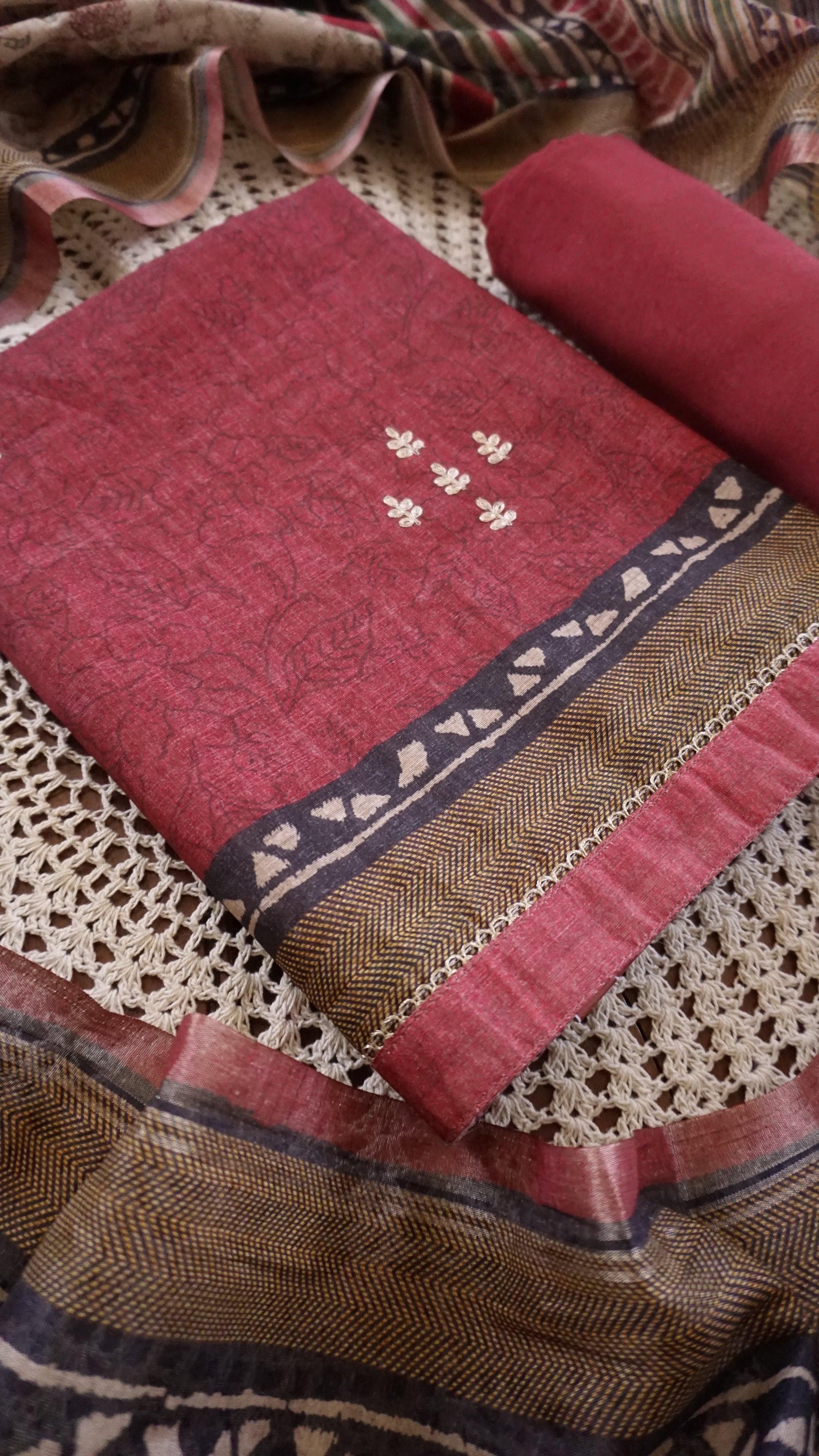 - Top: Tussar Chanderi fabric in a rich crimson/rose red, adorned with delicate hand-embroidered mirror work (shisha) detailing