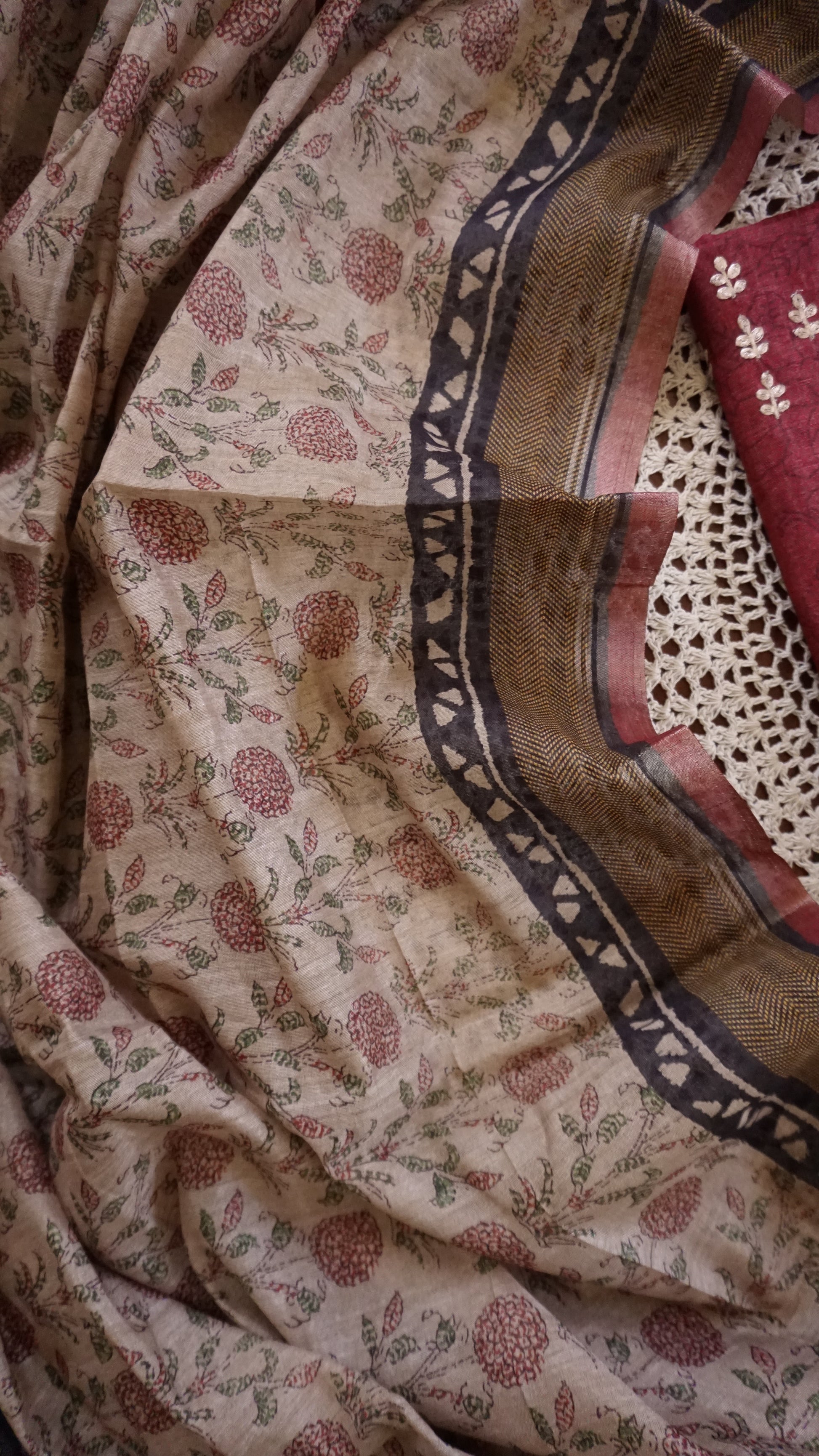 Indulge in timeless elegance with this exquisite Tussar Chanderi Unstitched Salwar Set, crafted for the woman who appreciates traditional artistry with a contemporary edge.