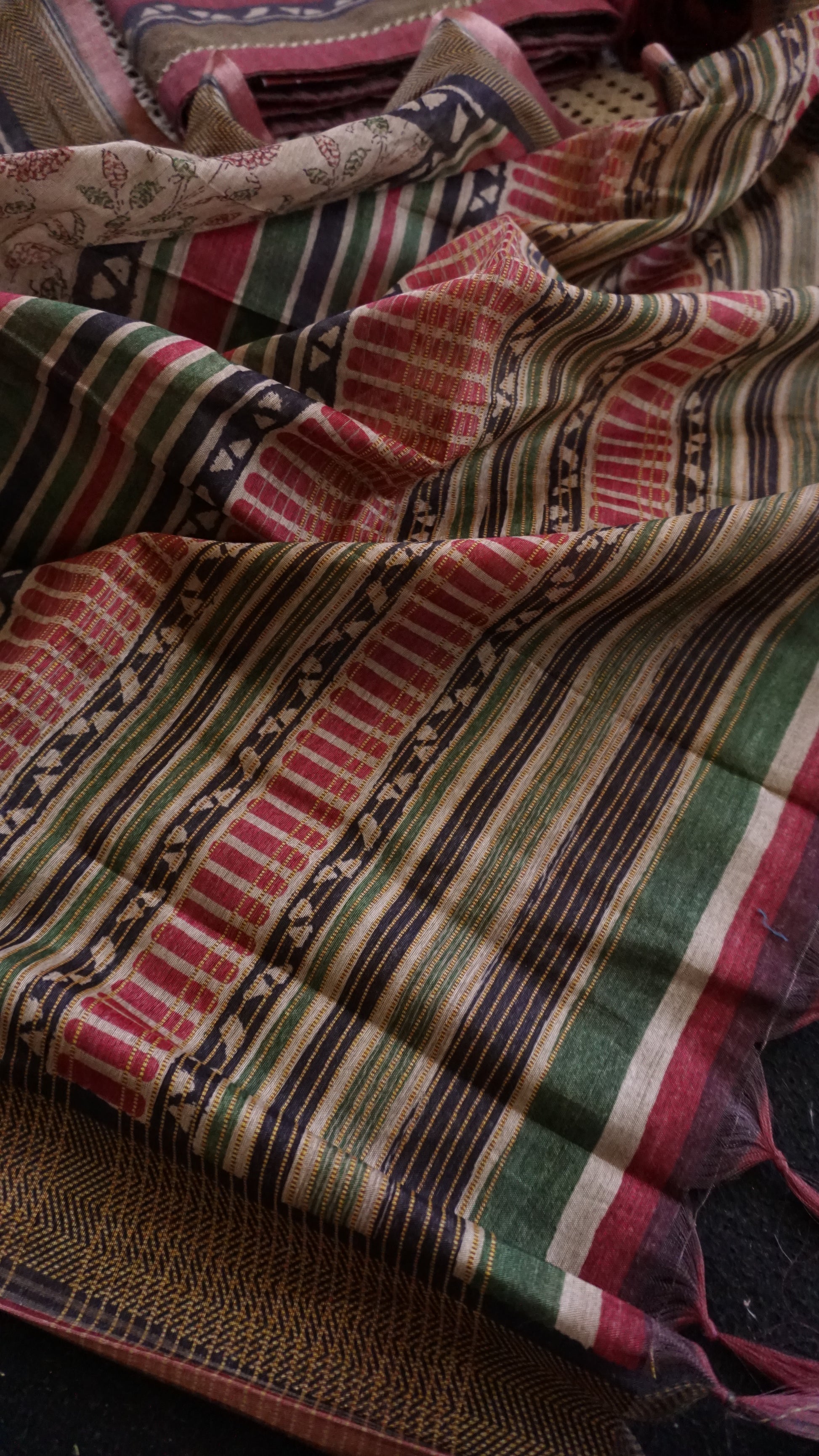 - Premium Tussar Chanderi — lightweight, breathable, and naturally lustrous