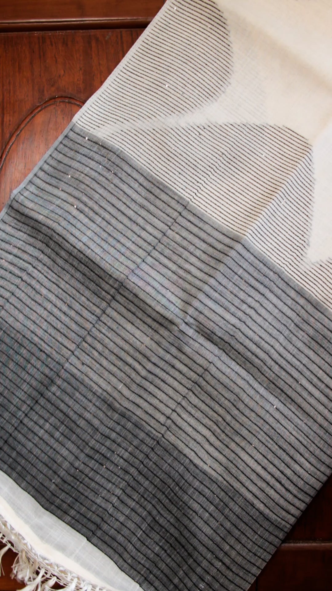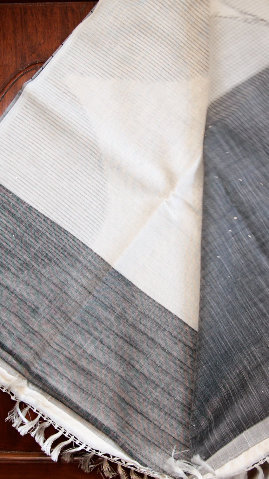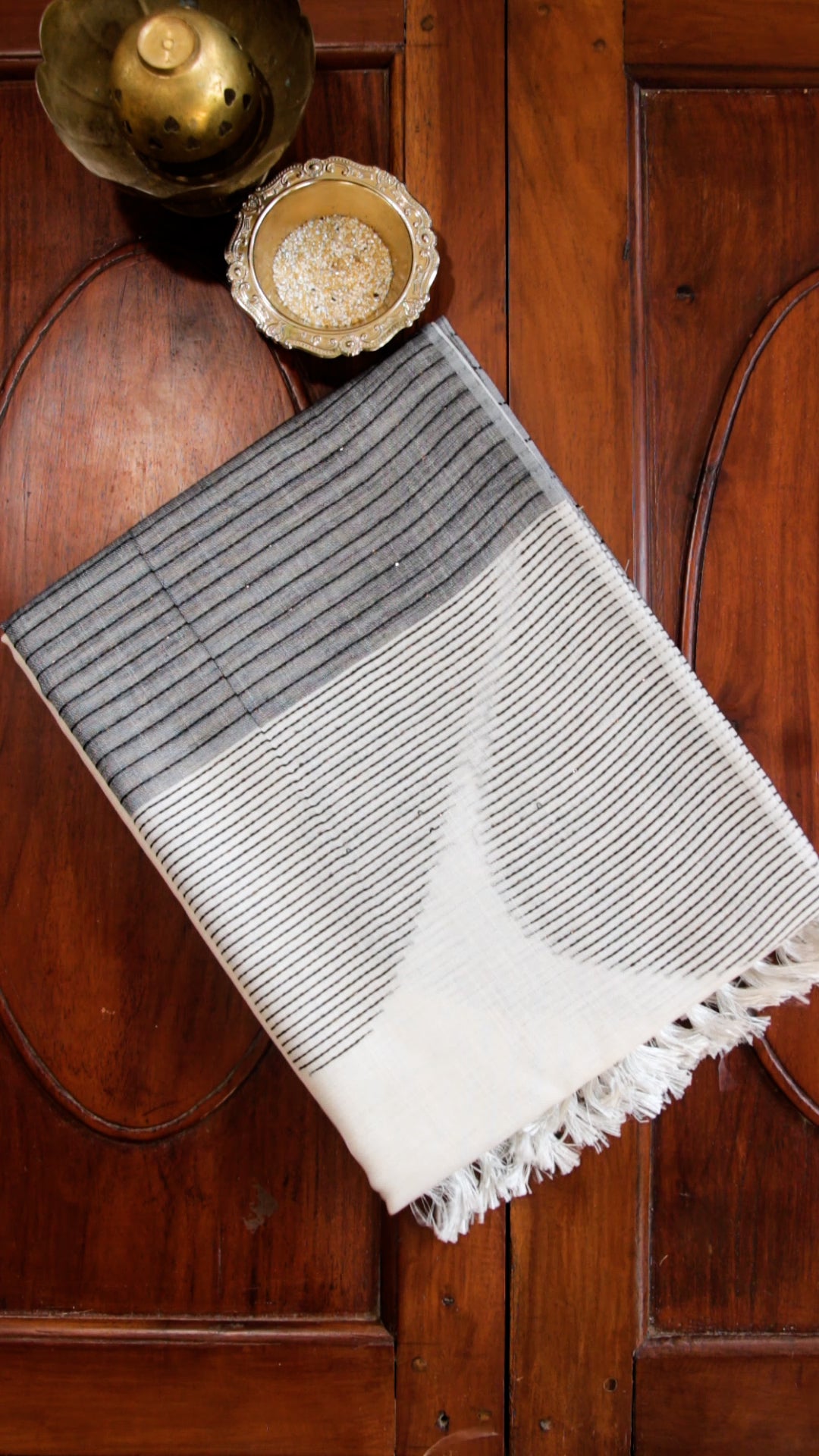 This stunning handloom saree combines traditional workmanship with contemporary style. With one part in a deep, dense black or charcoal gray and the other in a soft, creamy off-white, the saree has a traditional half-and-half pattern.