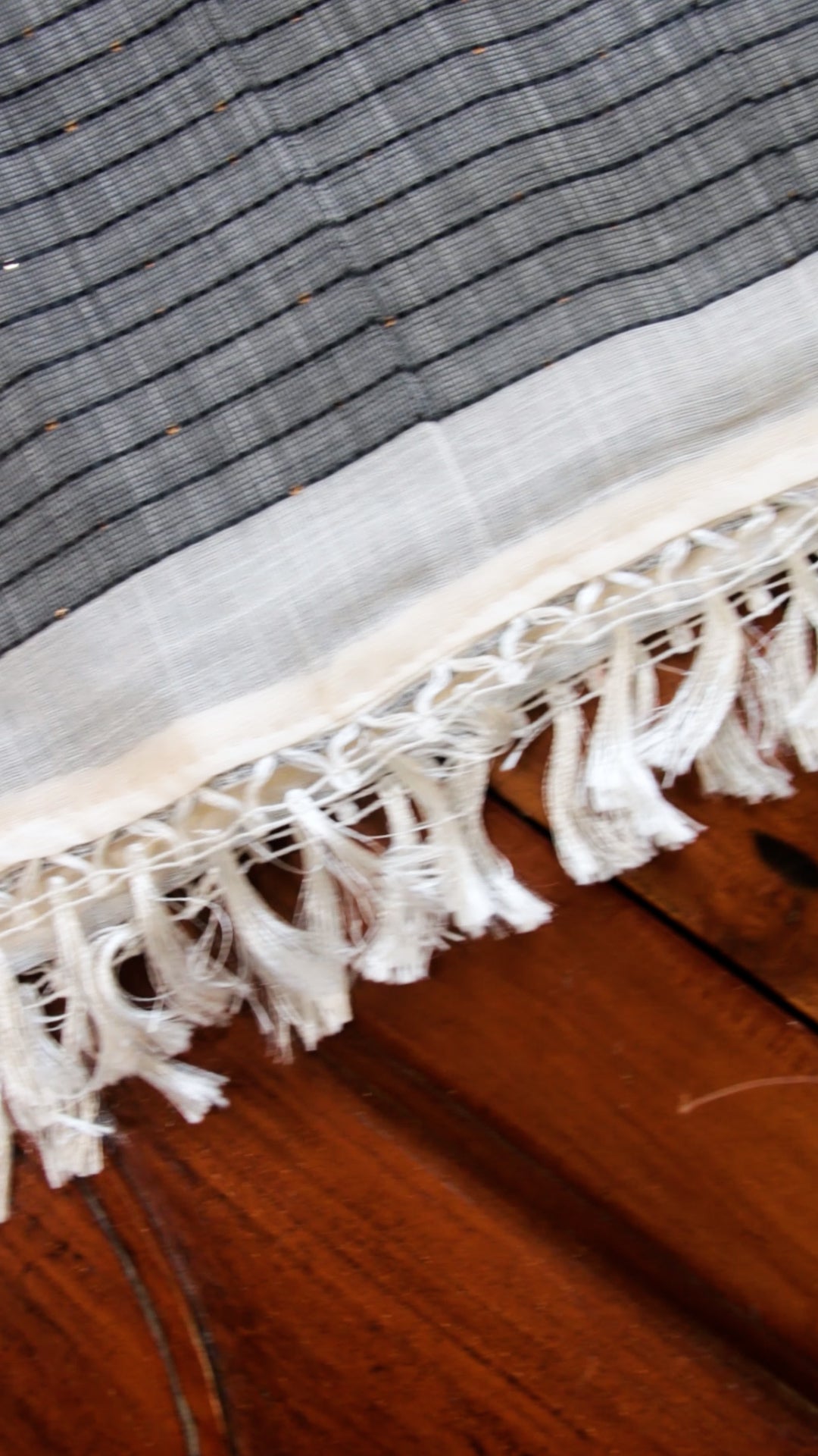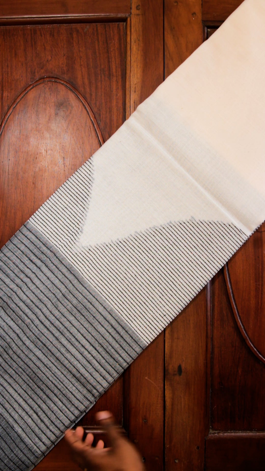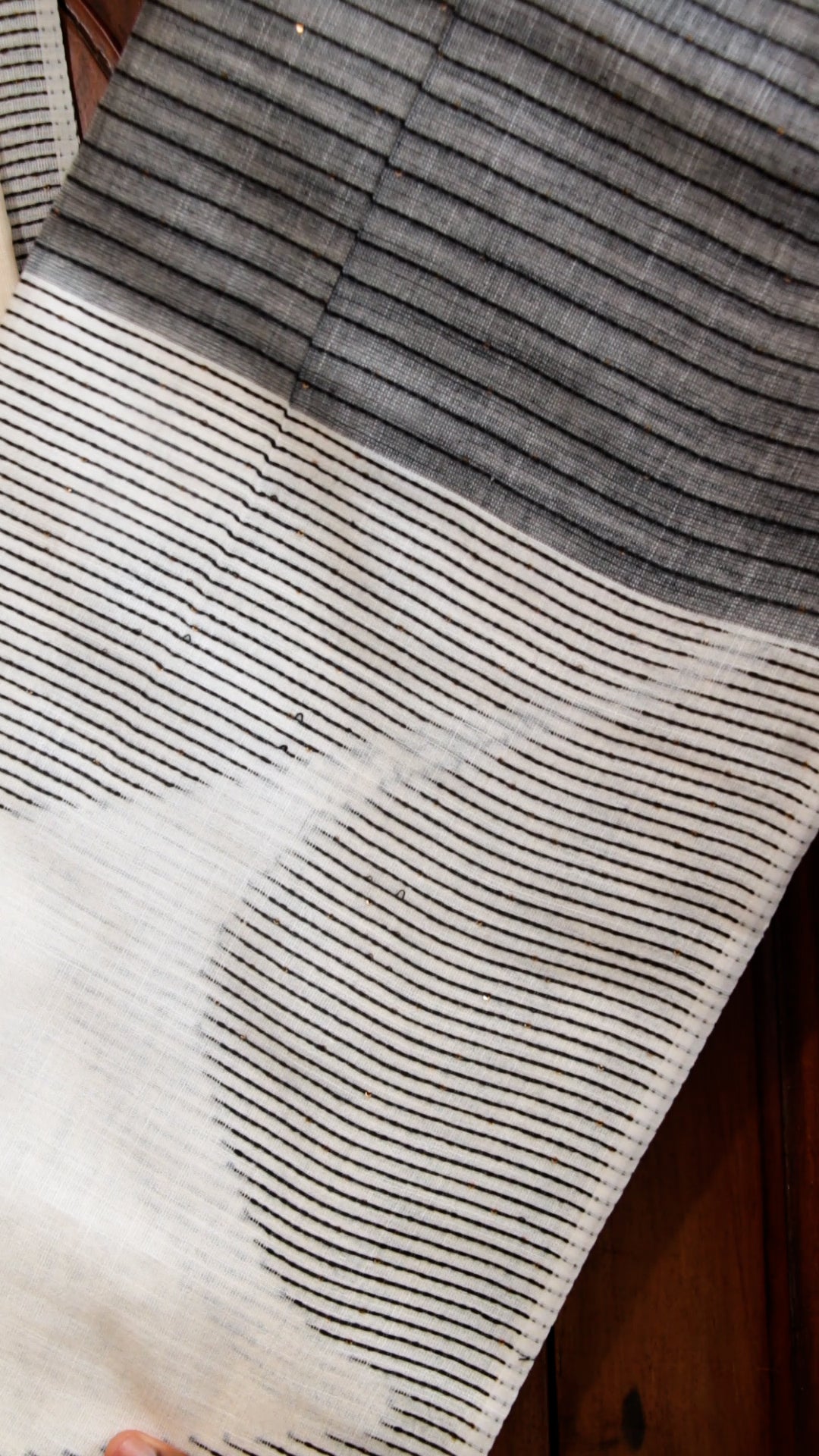 This stunning handloom saree combines traditional workmanship with contemporary style. With one part in a deep, dense black or charcoal gray and the other in a soft, creamy off-white, the saree has a traditional half-and-half pattern.