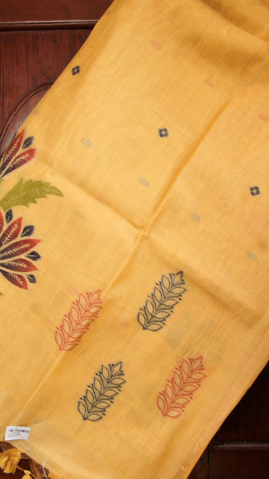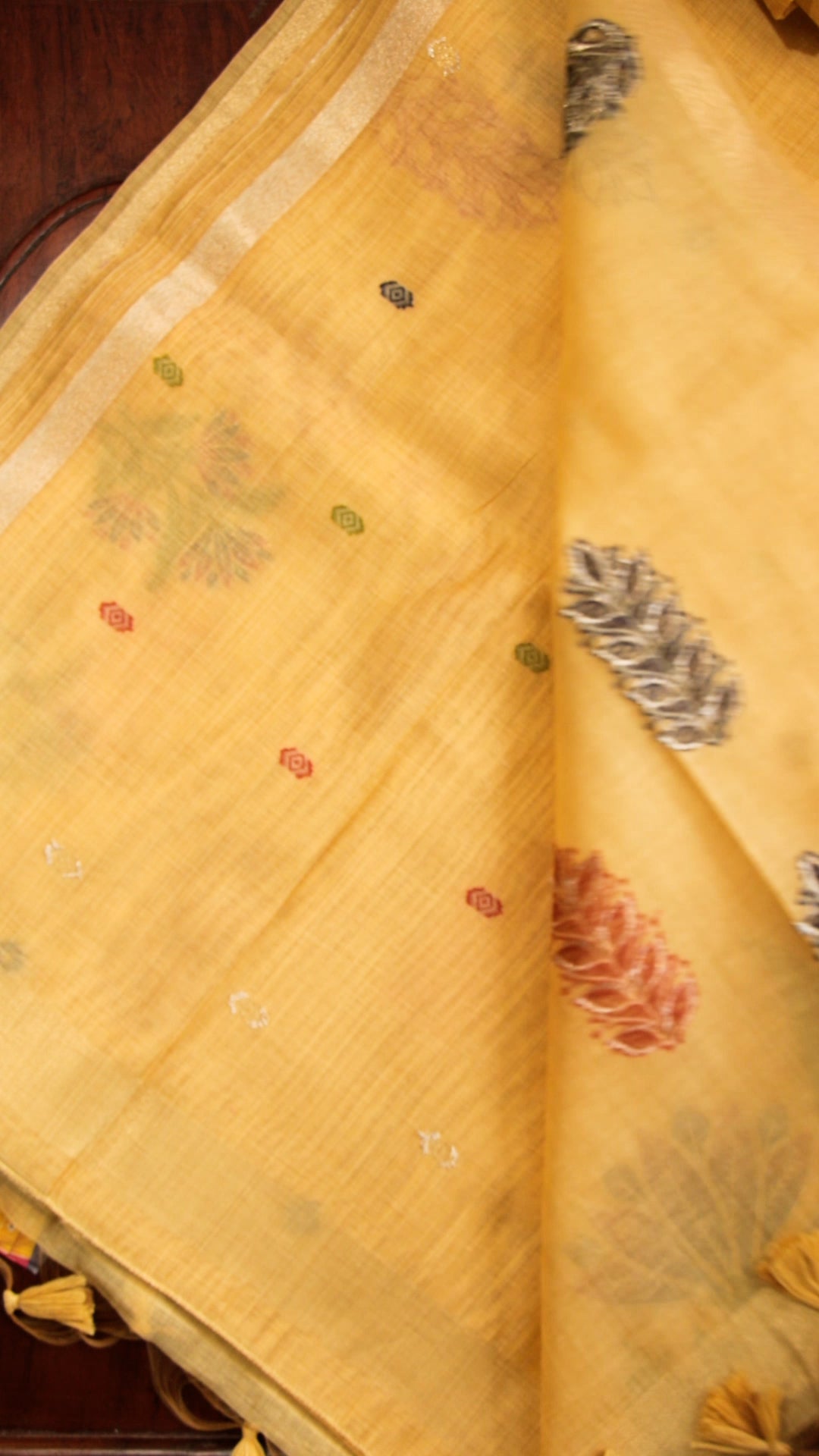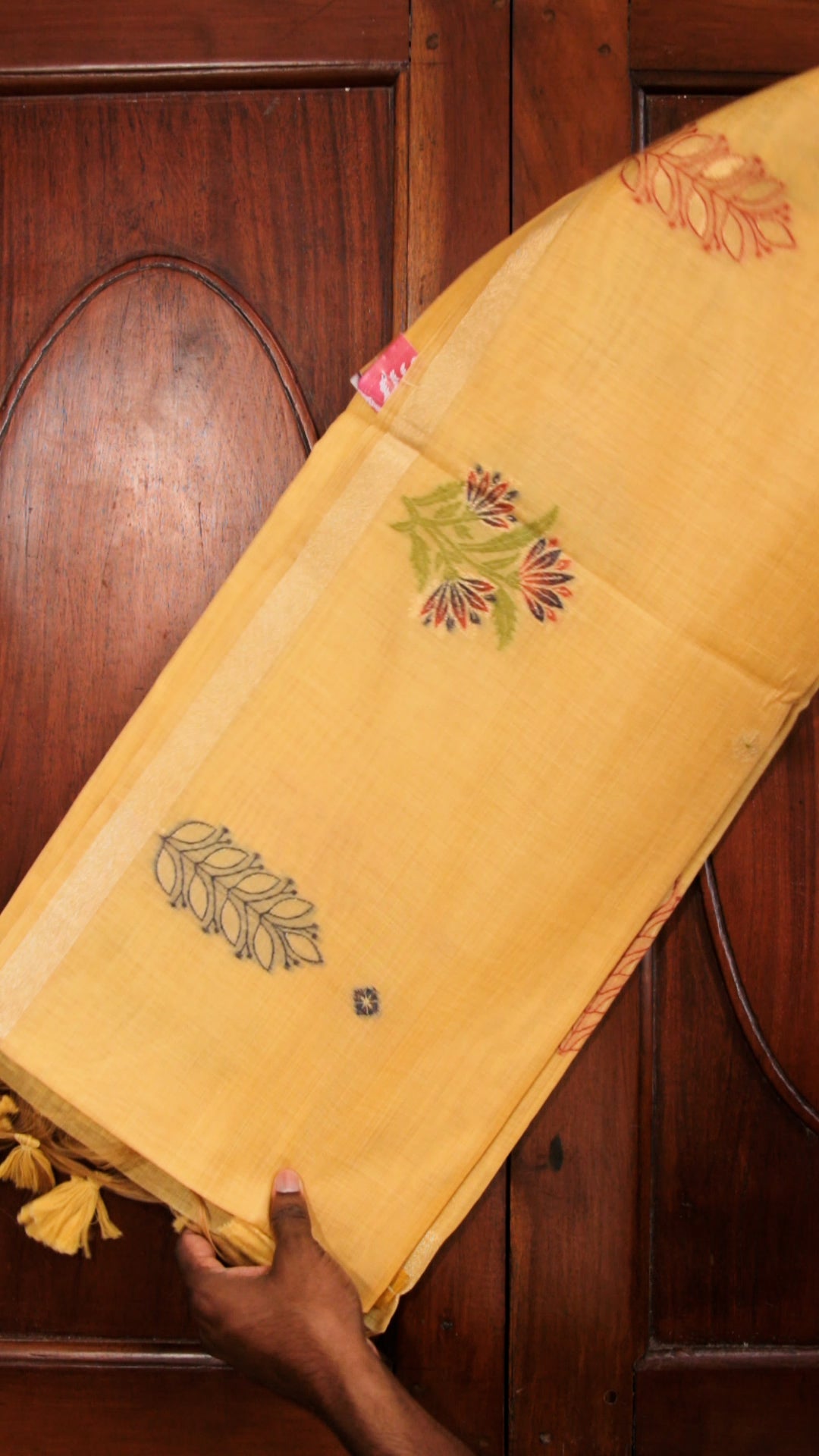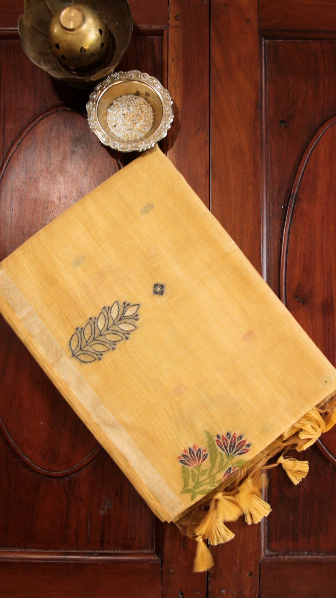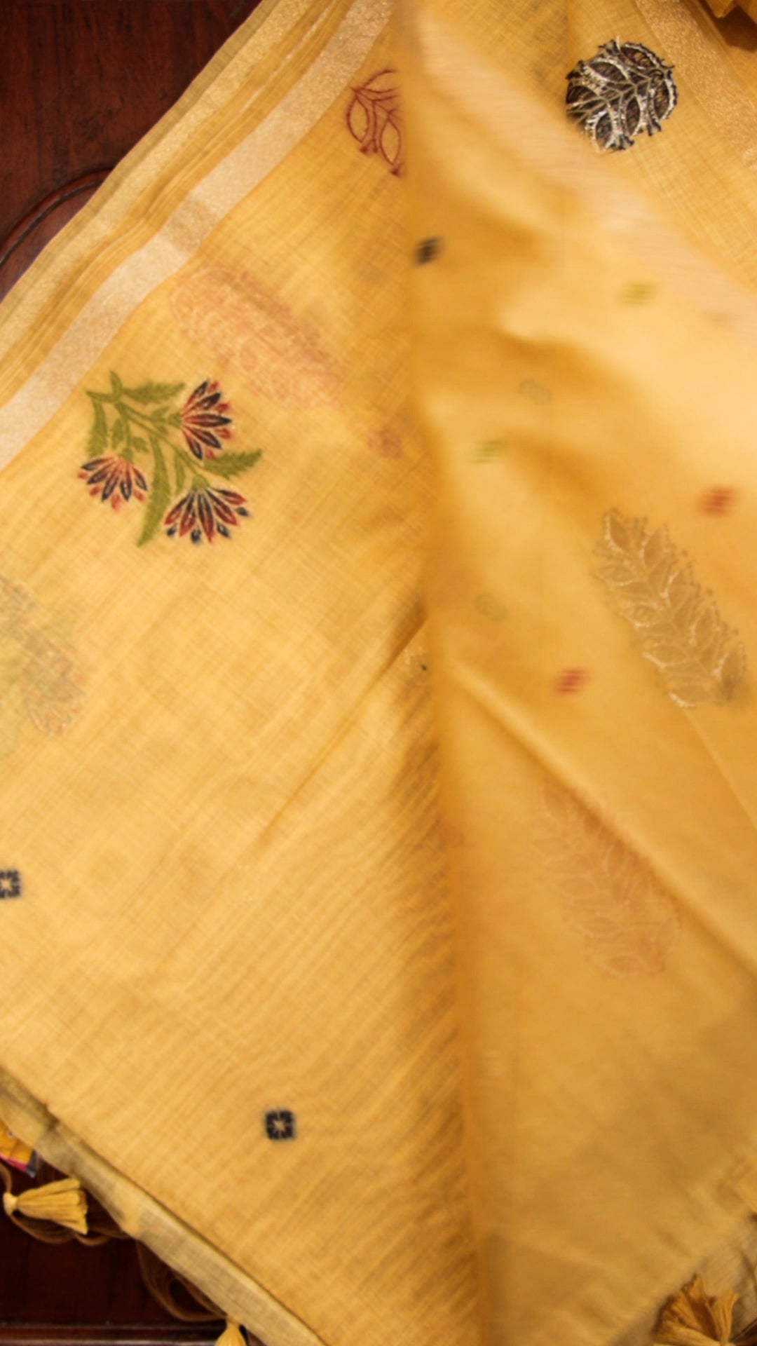 Mustard Yellow Cotton Saree with Floral Embroidery & Tassel Pallu